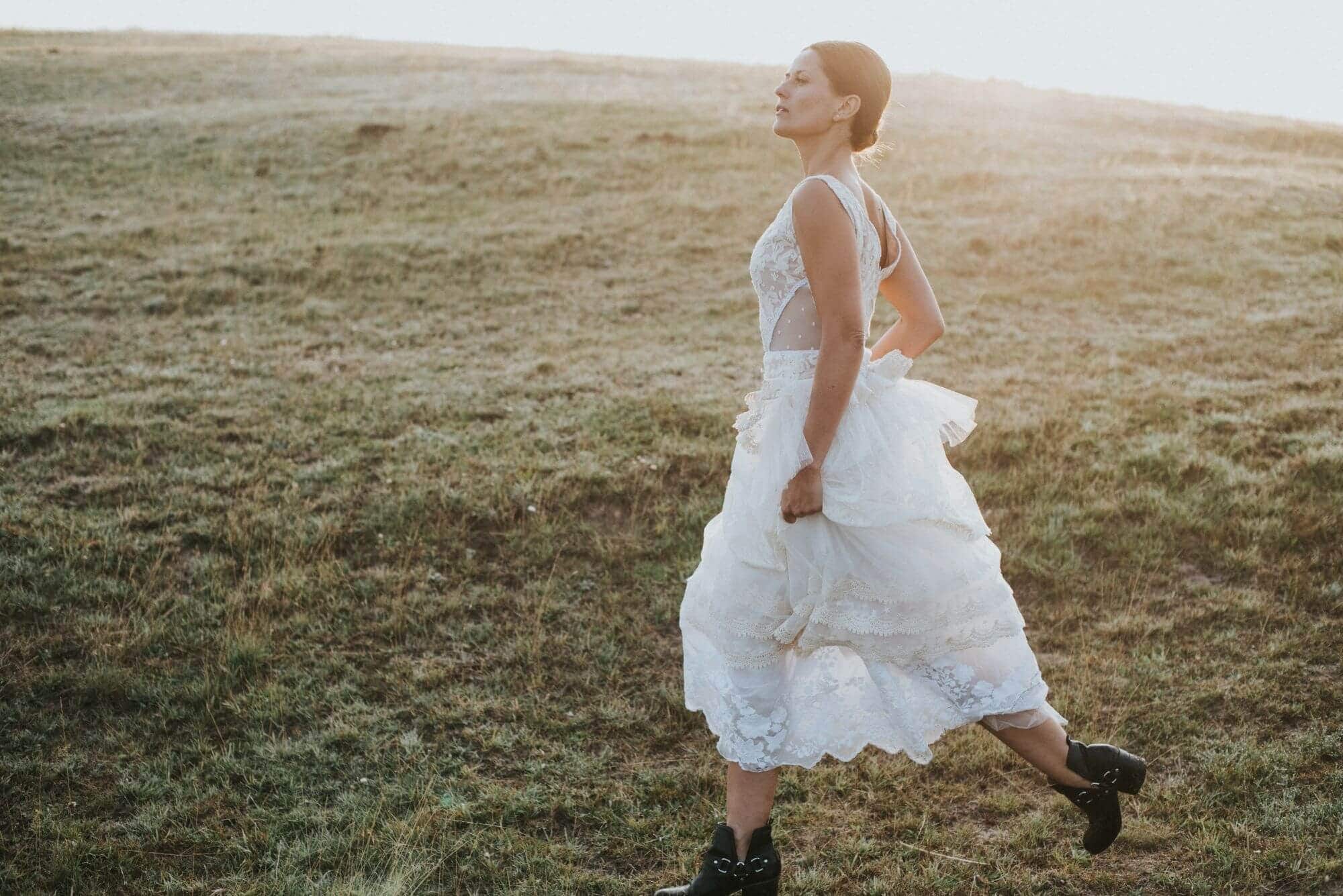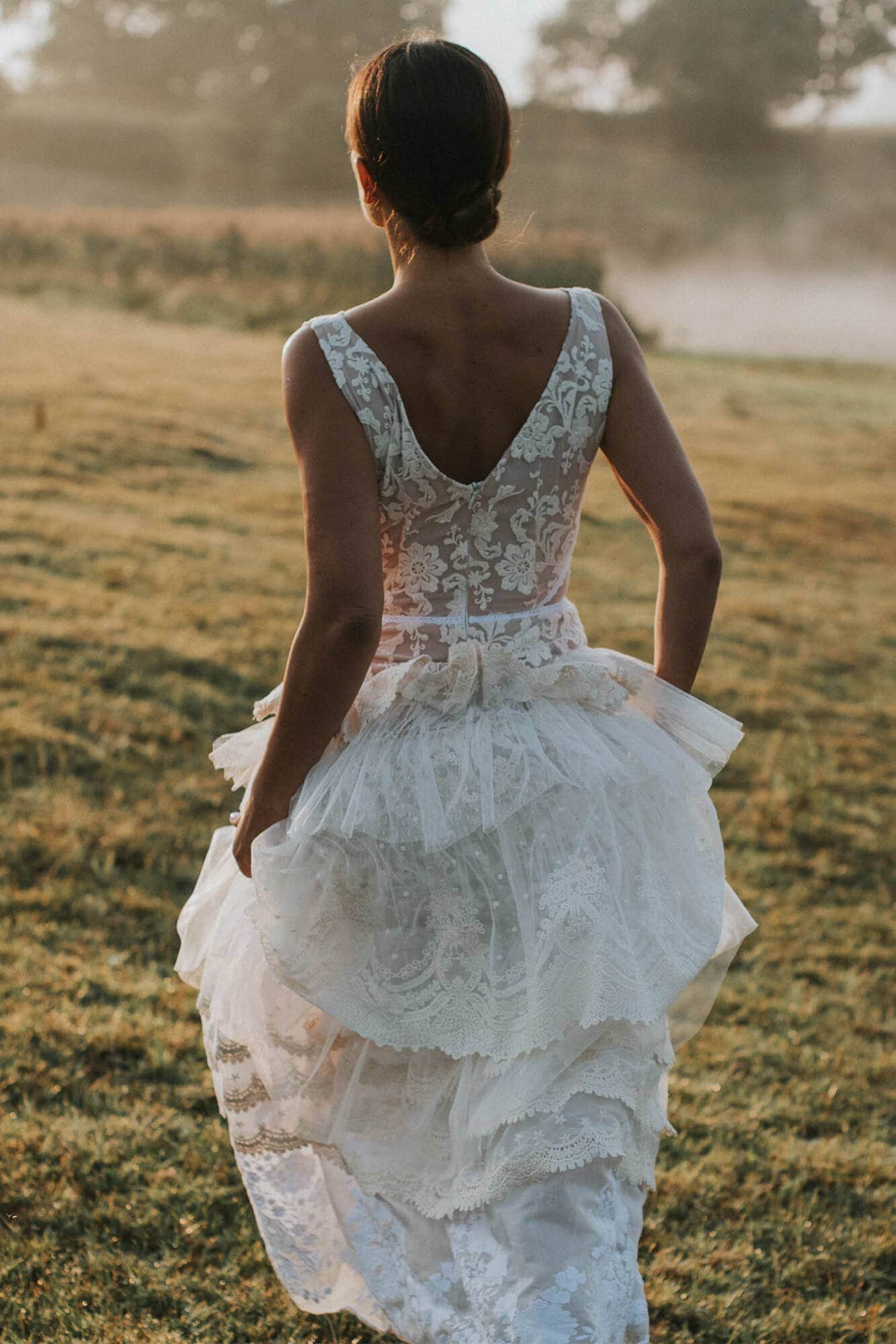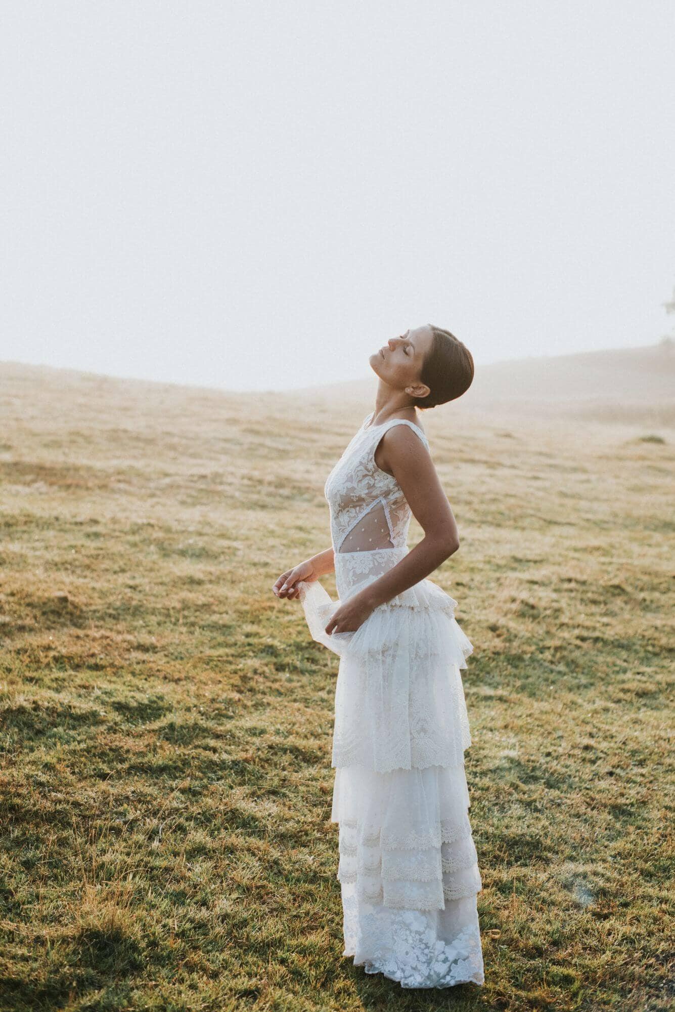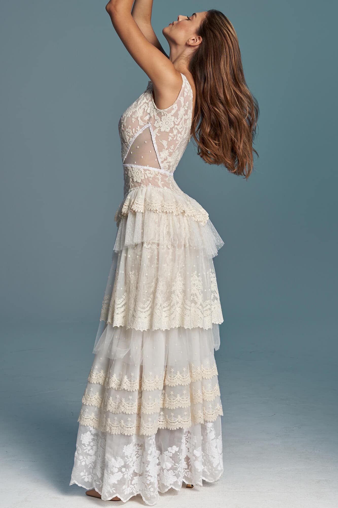 Warstwowa suknia ślubna w stylu boho uszyta z różnych hiszpańskich koronek w odcieniach bieli, beżu i écru. Ma zabudowaną górę z dekoltem w łódkę, co daje stabilność i pozwala na założenie biustonosza. Spódnica składa się z kilku pięter o zróżnicowanej fakturze, które modelują biodra i talię. Boczne wstawki z tiulu w kropeczki dodają lekkości sylwetce. Model szyty na miarę – możesz zmienić dekolty, rękawy, falbany i podszewkę.
