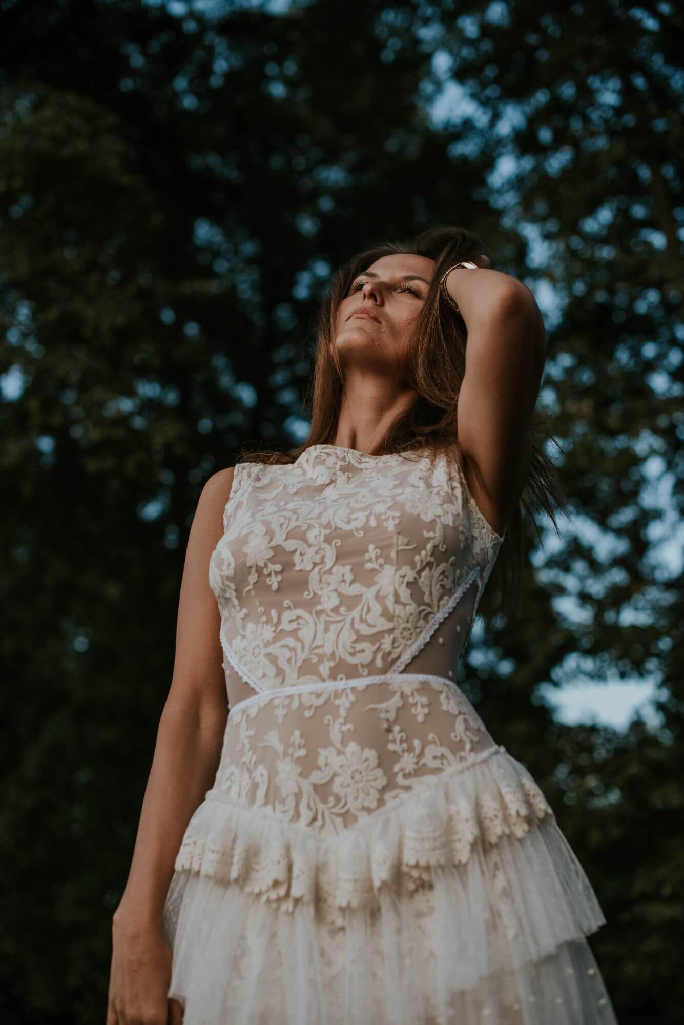 Spódnica została zbudowana z kilku pięter koronek o różnej strukturze. Warstwy podkreślają talię i modelują linię bioder, nie odbierając lekkości całej formie. Po bokach wszyto wstawki z tiulu w drobne kropeczki, które optycznie wysmuklają i nadają konstrukcji subtelności. To fason, który dobrze pracuje w tańcu i naturalnie układa się w ruchu.