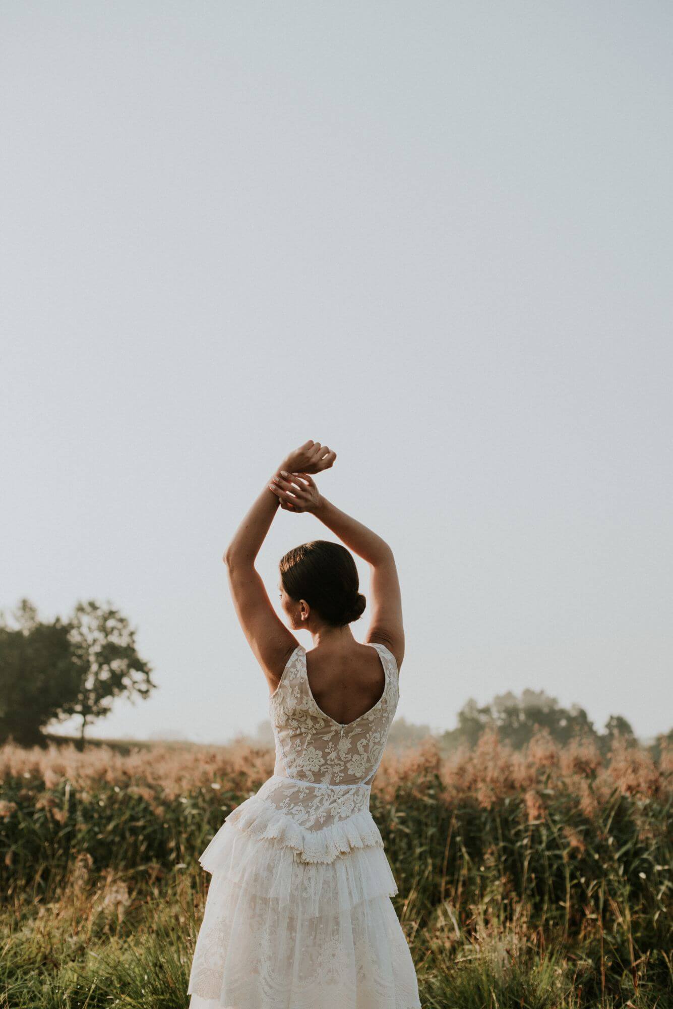 Suknia powstaje ze sprawdzonych materiałów. Koronki są miękkie, lekkie i niedrapiące – nie podrażniają skóry nawet przy wielogodzinnym noszeniu. Dobrze dopasowują się do sylwetki i pracują w ruchu, zapewniając komfort także przy zmieniającej się figurze, w tym w ciąży. Większość z nich można prać w pralce; nie gniotą się, więc suknię bez trudu spakujesz do walizki na sesję poślubną.