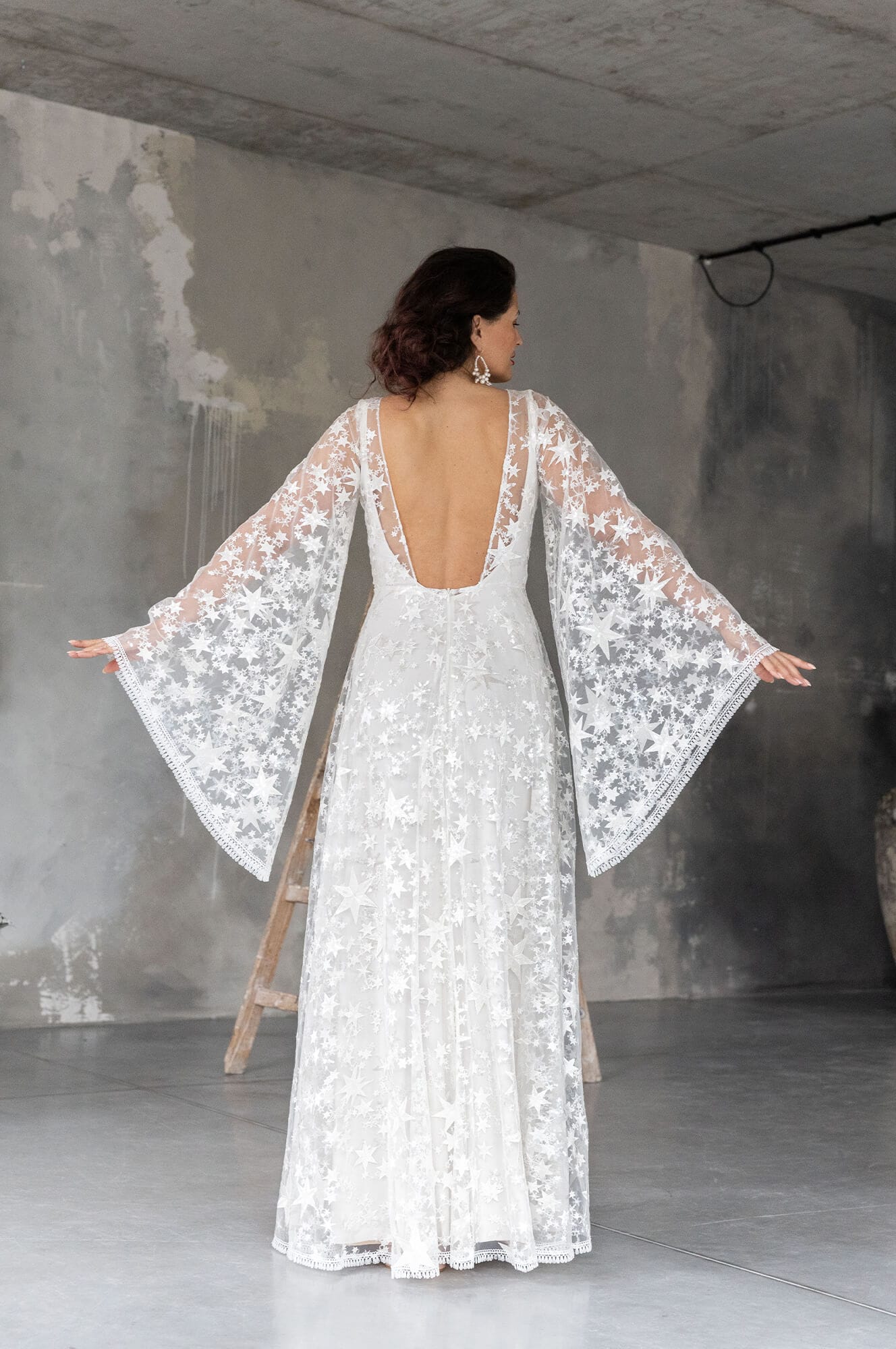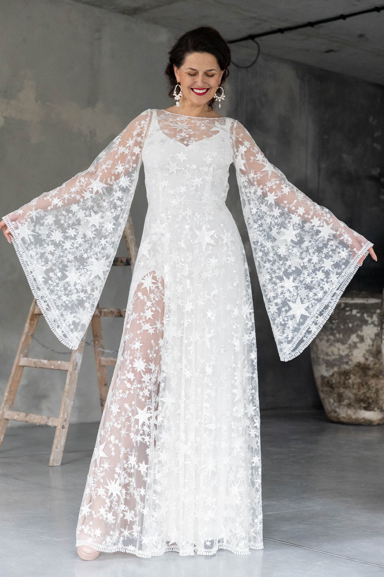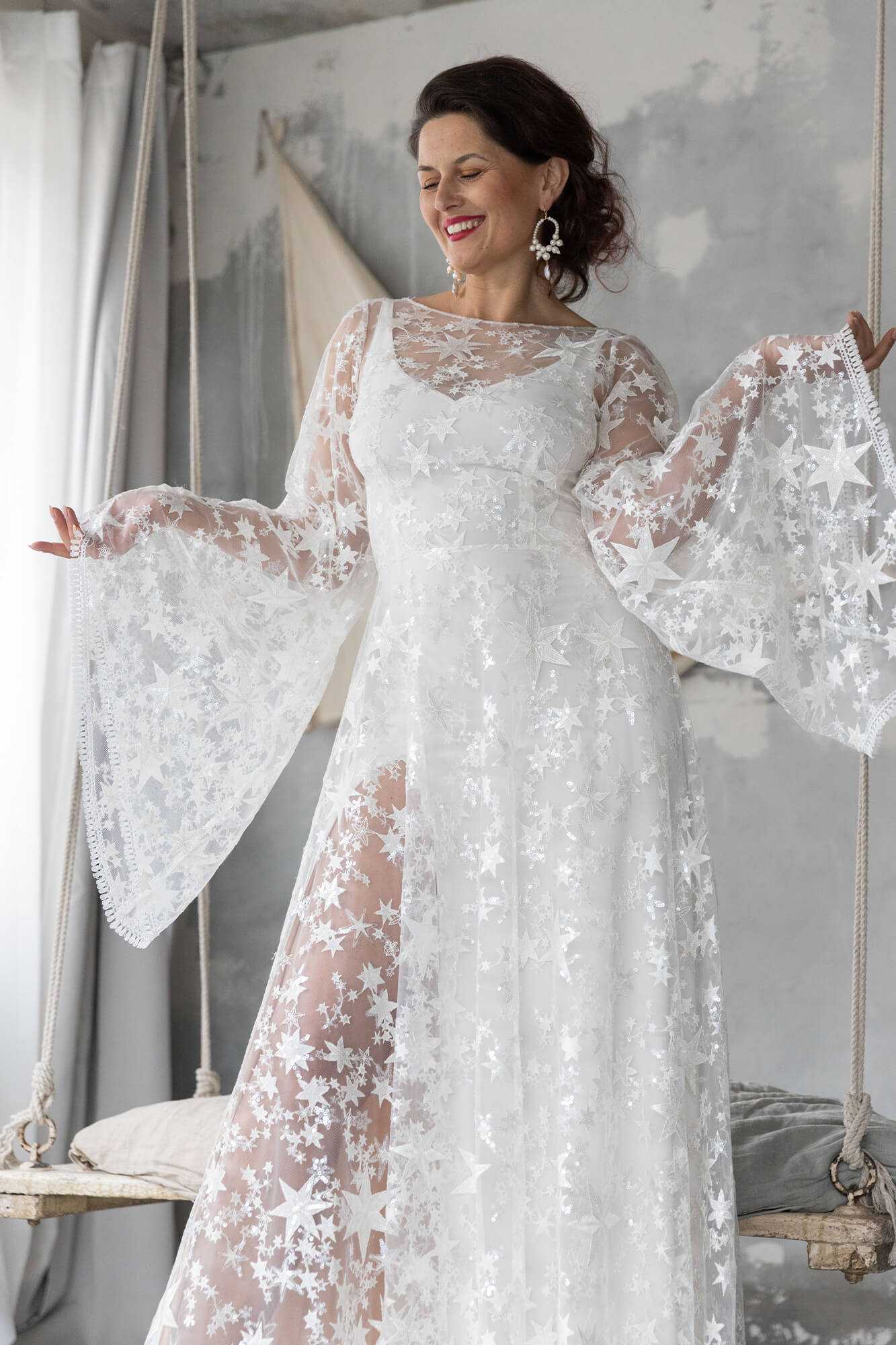 Suknia ślubna z transparentnej koronki w gwiazdy z delikatnymi cekinami. Model składa się z dwóch warstw – dopasowanej spodniej i luźniejszej wierzchniej. Elastyczna, dwustronna podszewka pozwala wybrać stronę białą lub cielistą. Górna warstwa ma dekolt w łódkę i szerokie rękawy, dolna – serce i rozcięcie na nodze. Fason możesz zmieniać i dopasować do siebie podczas szycia.