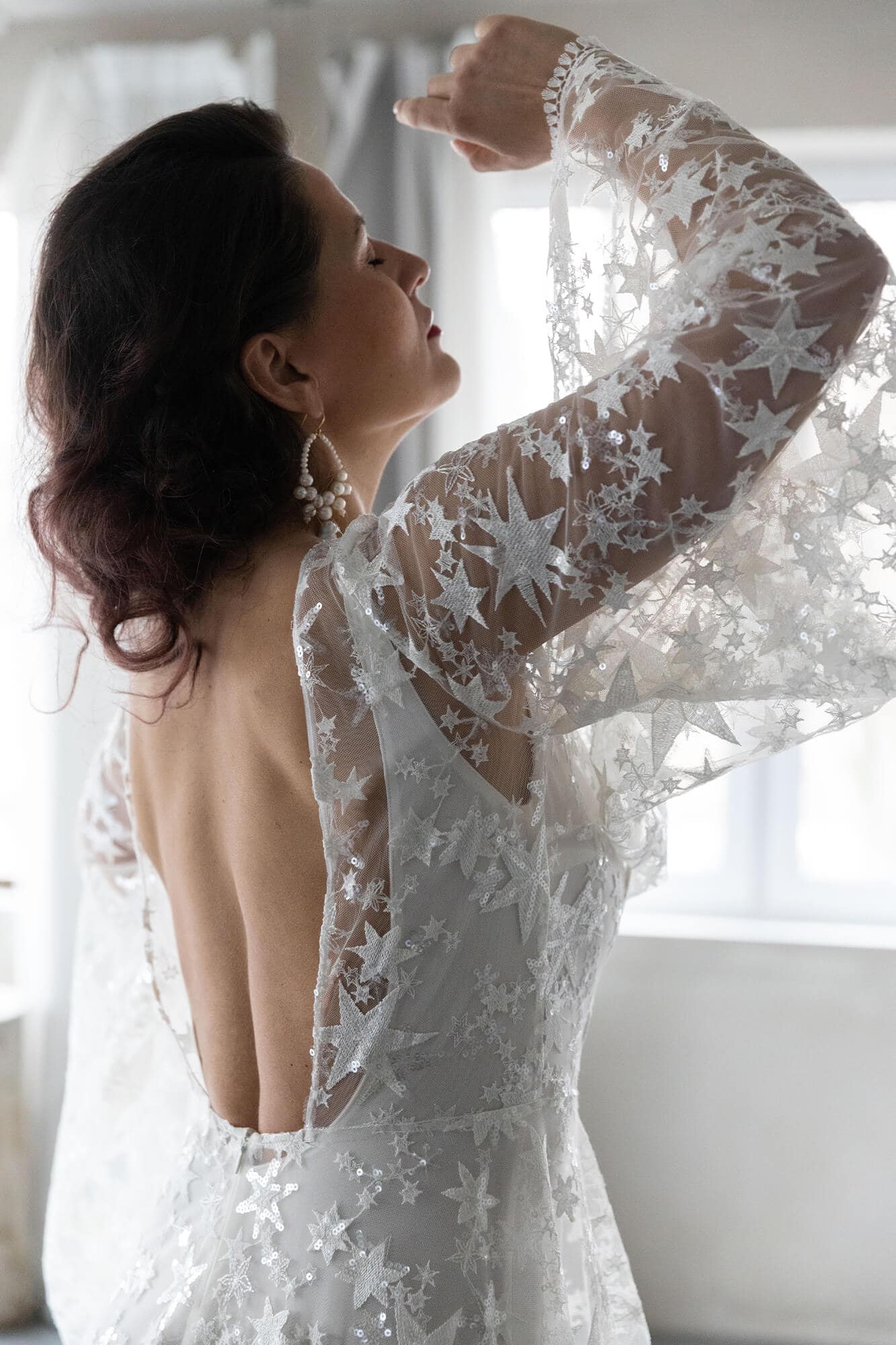 Cannes 3 to suknia ślubna dla kobiet, które lubią wyraziste detale. Transparentna koronka w motyw gwiazd została ozdobiona drobnymi cekinami, które subtelnie odbijają światło. Tkanina jest lekka i przewiewna, dzięki czemu sprawdzi się także podczas dłuższej uroczystości.