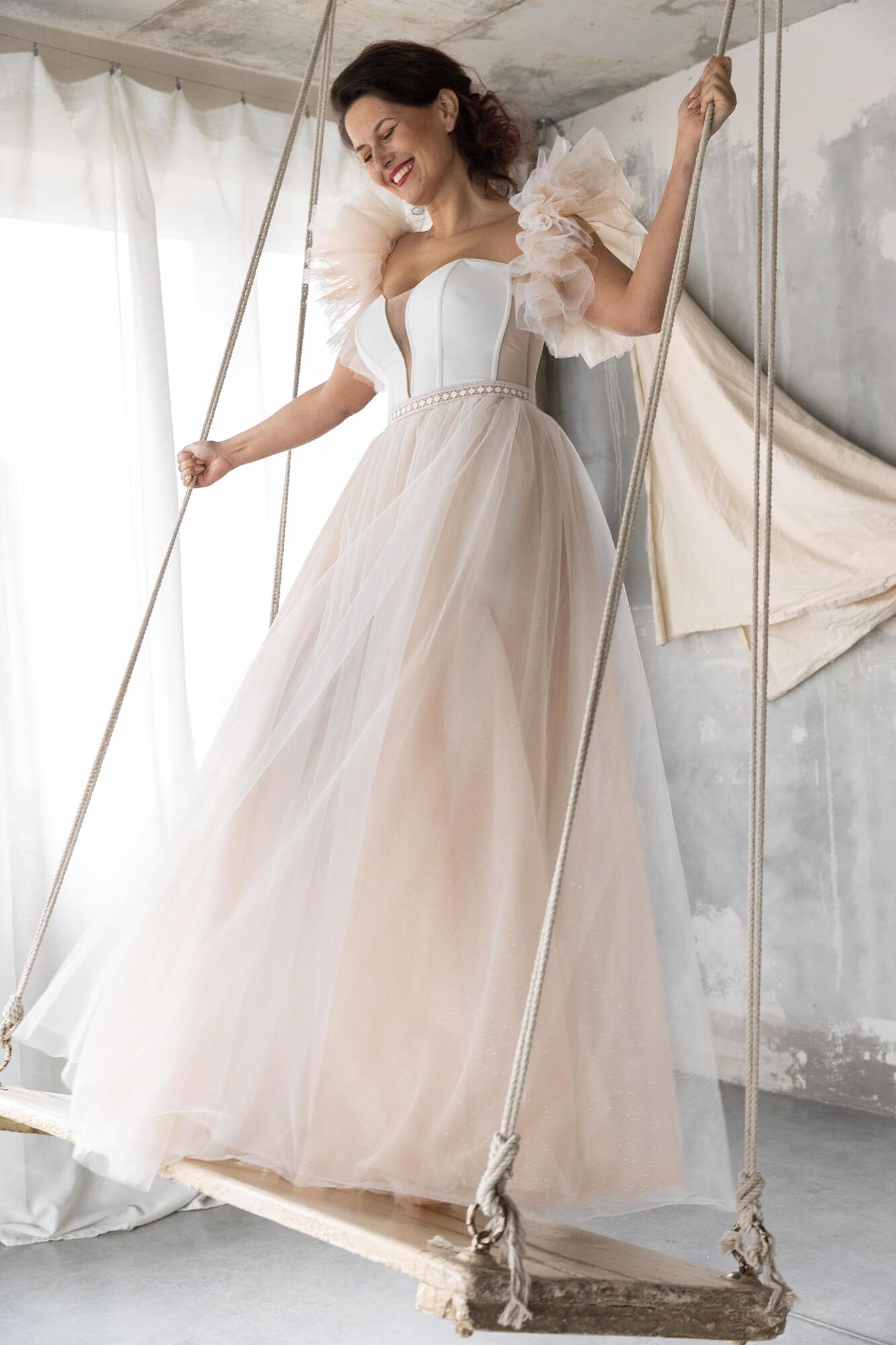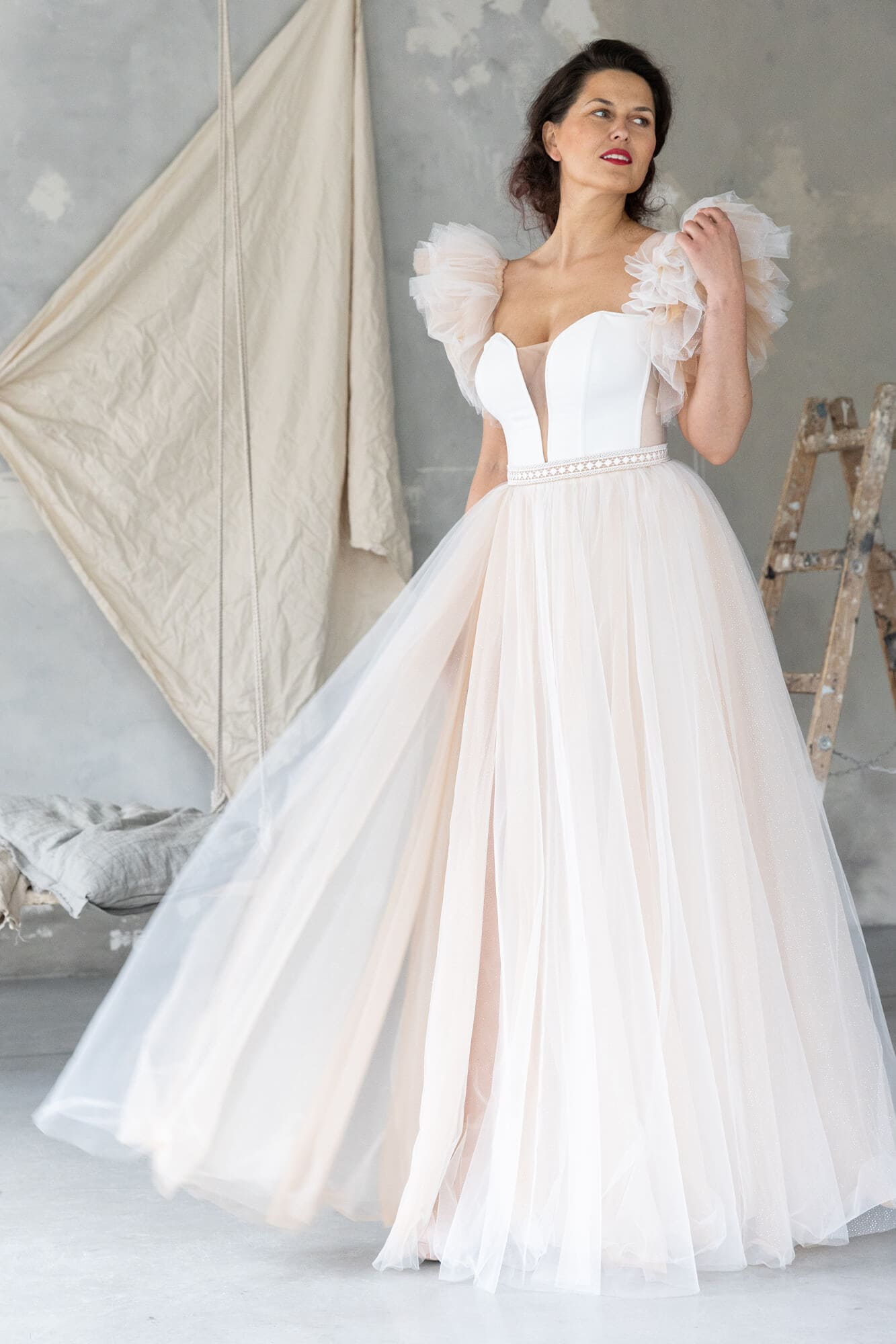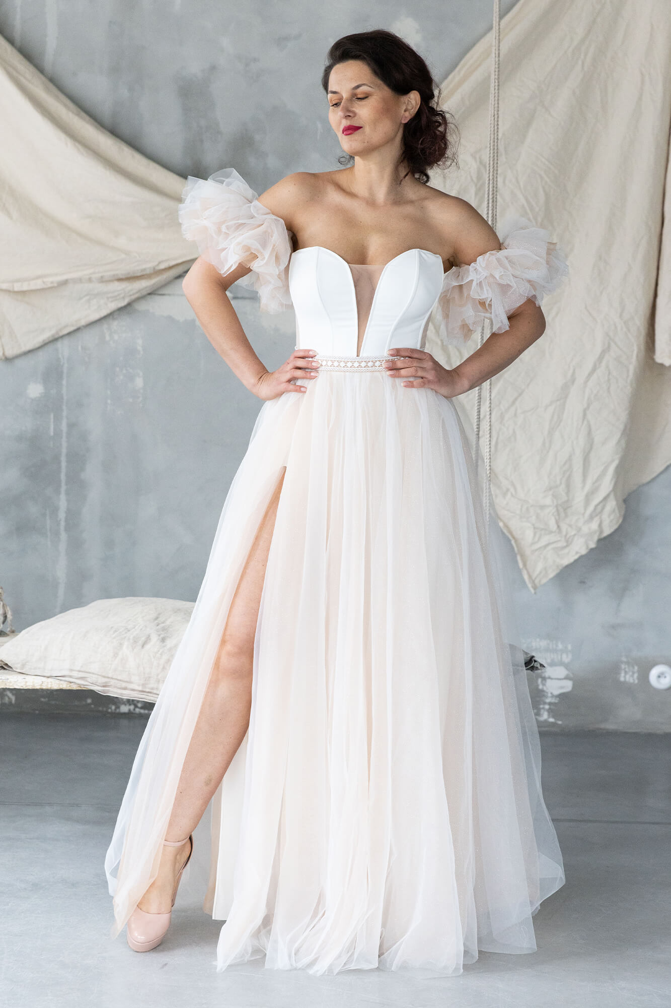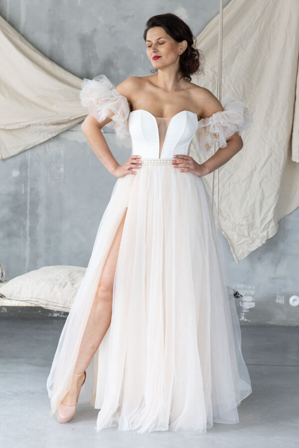 Tiulowa suknia ślubna z gorsetem i rozkloszowaną spódnicą z pełnego koła. Kilka warstw tiulu – ecru, cielistego i delikatnie brokatowego – tworzy lekki, wielowymiarowy efekt. Gorset z krepy ma wszyte fiszbiny i miseczki, które stabilnie podtrzymują biust. Długie rozcięcie na nodze dodaje swobody ruchu. Odpinane rękawki możesz nosić na ramionach, niżej lub z nich zrezygnować.