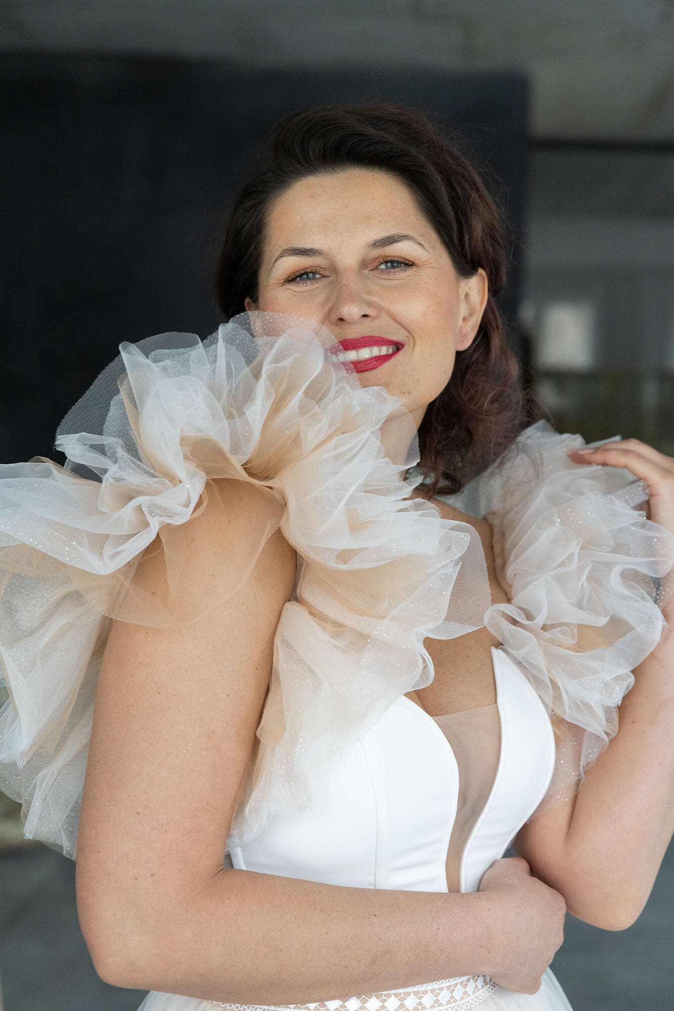 Ten model traktujemy jako punkt wyjścia. Możemy zmienić niemal każdy element: kształt i głębokość dekoltu, wykończenia, falbany czy frędzle. Rękawy mogą mieć inną długość lub formę – albo nie być ich wcale. Regulujemy ilość tiulu w spódnicy, długość i kolor podszewki (biel, beż), a także dodajemy lub usuwamy rozcięcie oraz tren.