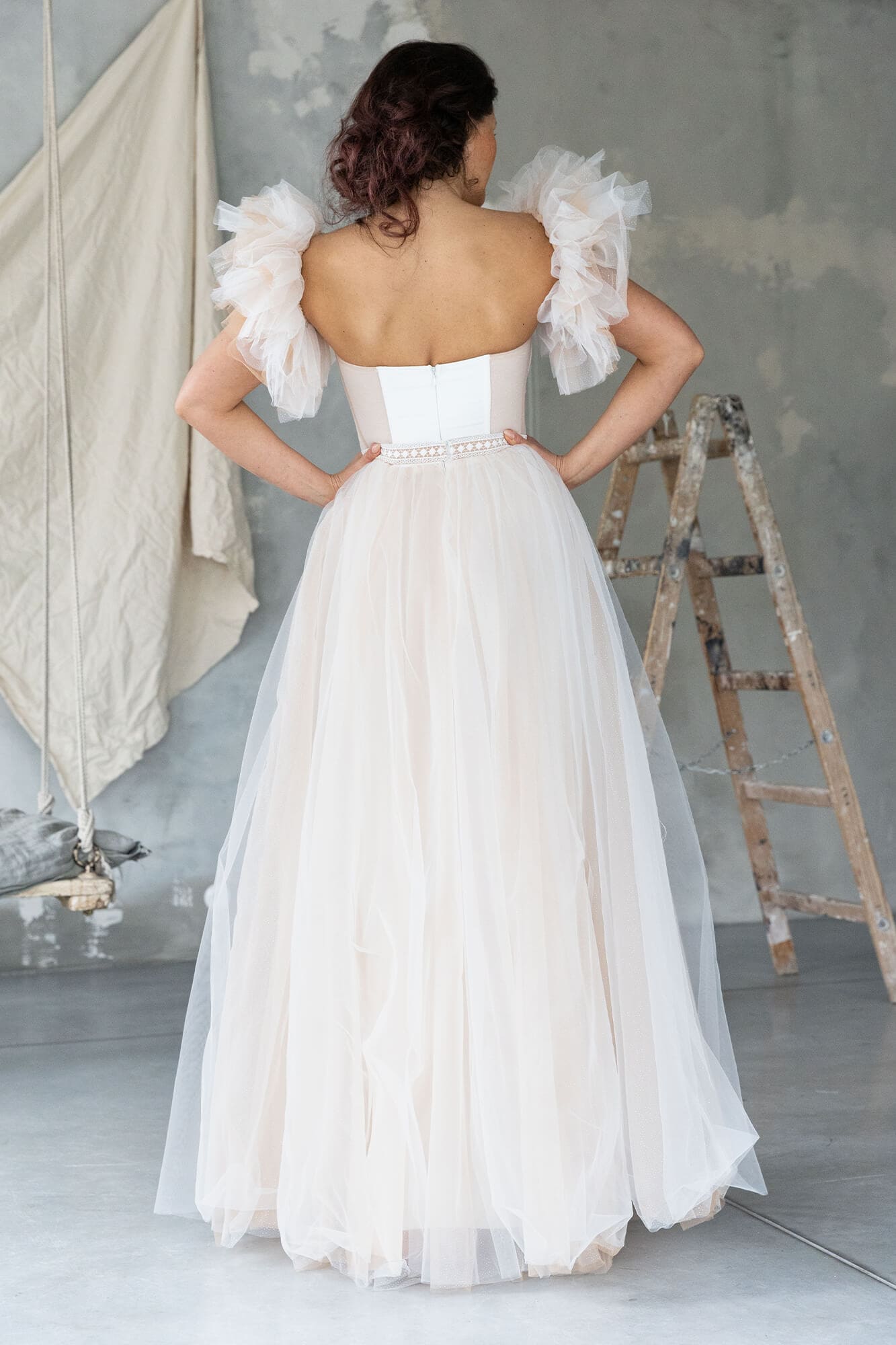 Cannes 5 to tiulowa suknia ślubna z wyraźnie zaznaczoną talią i rozbudowaną spódnicą. Dół został uszyty z kilku warstw tiulu w odcieniach ecru i cielistym, a jedna z nich ma subtelny brokat. Każda warstwa jest skrojona z pełnego koła i lekko zmarszczona w pasie, dzięki czemu spódnica efektownie pracuje w ruchu.