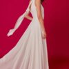 Luźna suknia ślubna z lekką, szyfonową warstwą wierzchnią. Subtelnie zaznacza talię i dekolt, nie opinając sylwetki. Spódnica posiada rozcięcie na nogę, które dodaje swobody ruchu. Spodnia warstwa z grubszej tkaniny nie prześwituje i dobrze układa się na ciele. Model możesz modyfikować według własnych potrzeb.