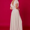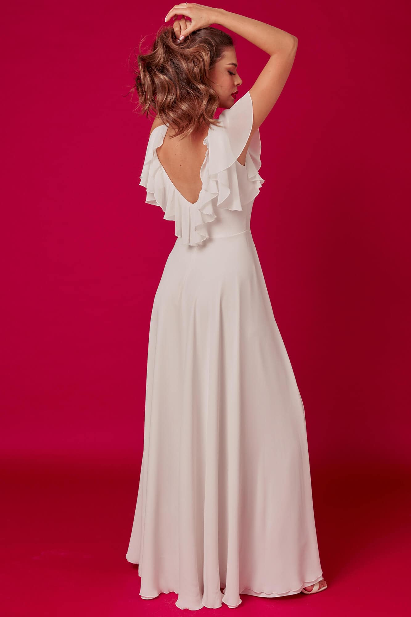 Gładka suknia ślubna z lejącego szyfonu, która lekko pracuje w ruchu i pięknie układa się w tańcu. Ramiona osłaniają krótkie rękawki z koła, a plecy zdobi delikatna falbanka. W spódnicy znajduje się rozcięcie, które dodaje swobody i lekkości. Fason możesz zmienić według własnych potrzeb podczas szycia w pracowni. To model dla Ciebie, jeśli lubisz okryte plecy i zwiewne tkaniny.