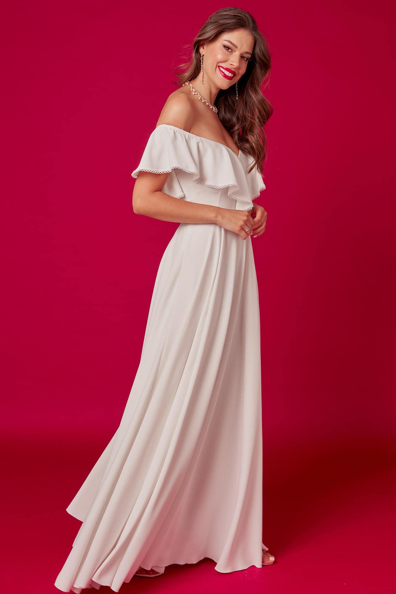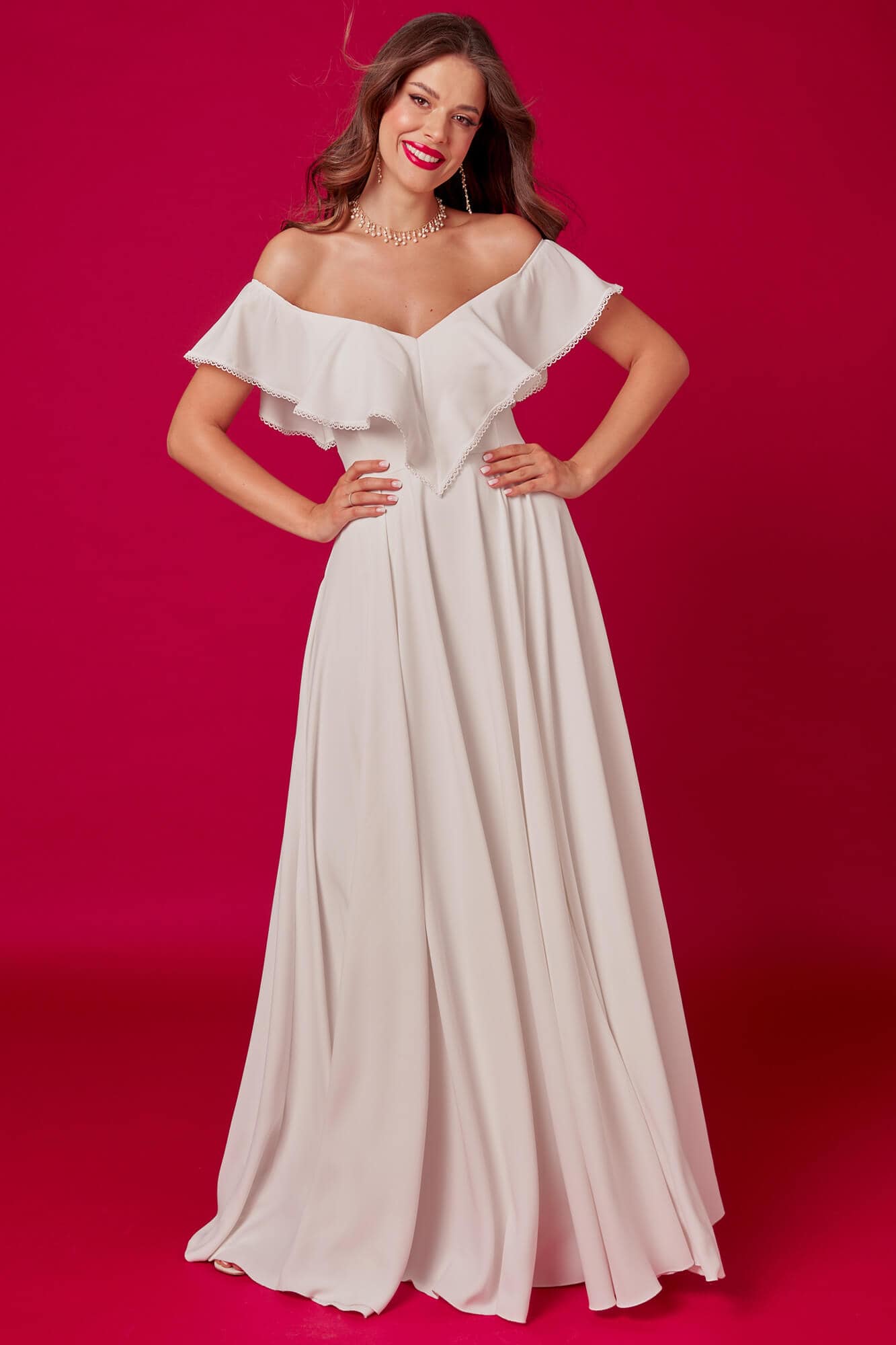 To suknia ślubna, która łączy klasyczny charakter z delikatnie odsłoniętą linią ramion – w zgodzie z Twoją sylwetką.