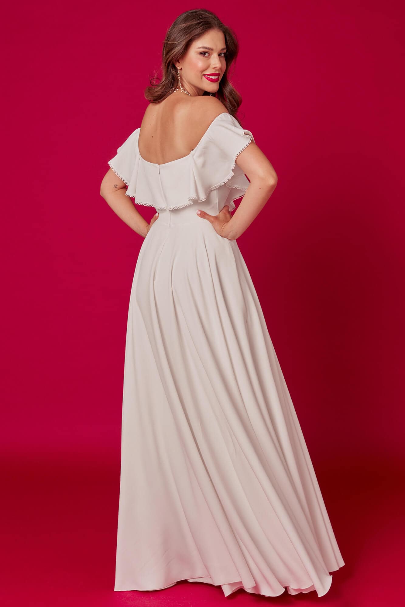 Gładka suknia ślubna z kieszeniami i hiszpańskim dekoltem, który odsłania ramiona w wyważony sposób. Fason łączy klasykę z subtelnym akcentem, bez efektu przesady. Mięsista, ale lejąca tkanina dobrze układa się w ruchu i wiruje w tańcu. Model sprawdzi się także podczas ślubu kościelnego. Każdy element możesz zmienić podczas szycia w pracowni.