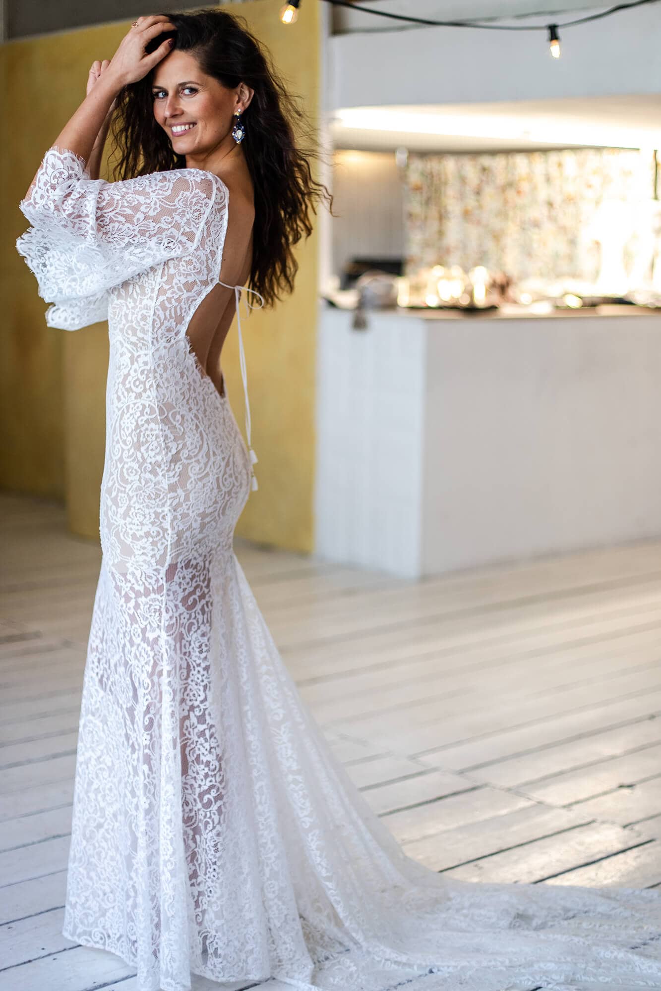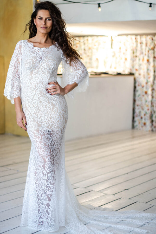 Suknia ślubna z zabudowanym przodem, długim rękawem i mocno wyciętymi plecami. Dopełniona trenem, który nadaje jej wyrazistej formy. To model dla kobiet, które nie potrzebują wpisywać się w jeden kanon proporcji. Sprawdzi się szczególnie podczas ceremonii w plenerze lub na plaży. Koronka dostępna w ograniczonej ilości.