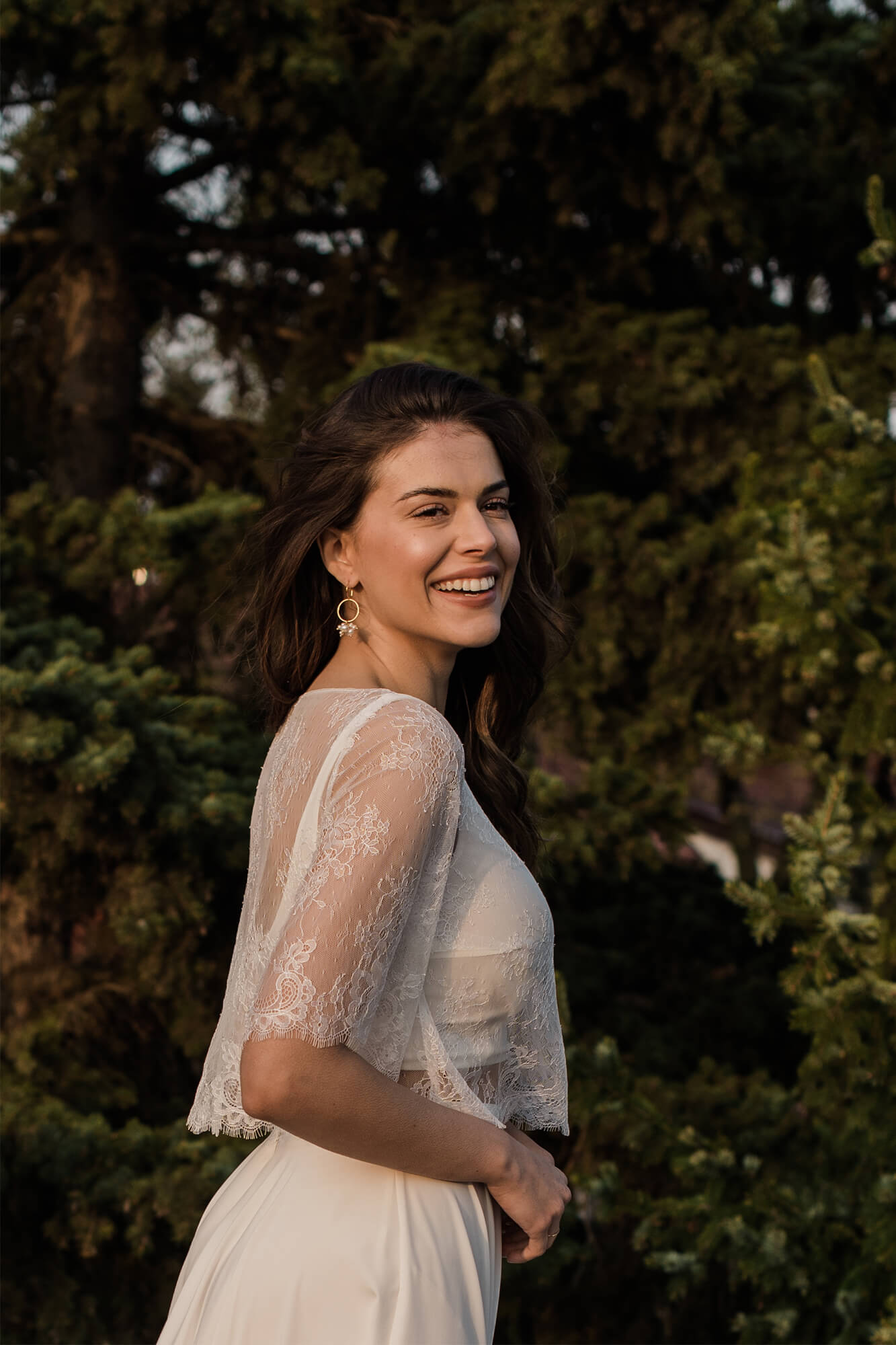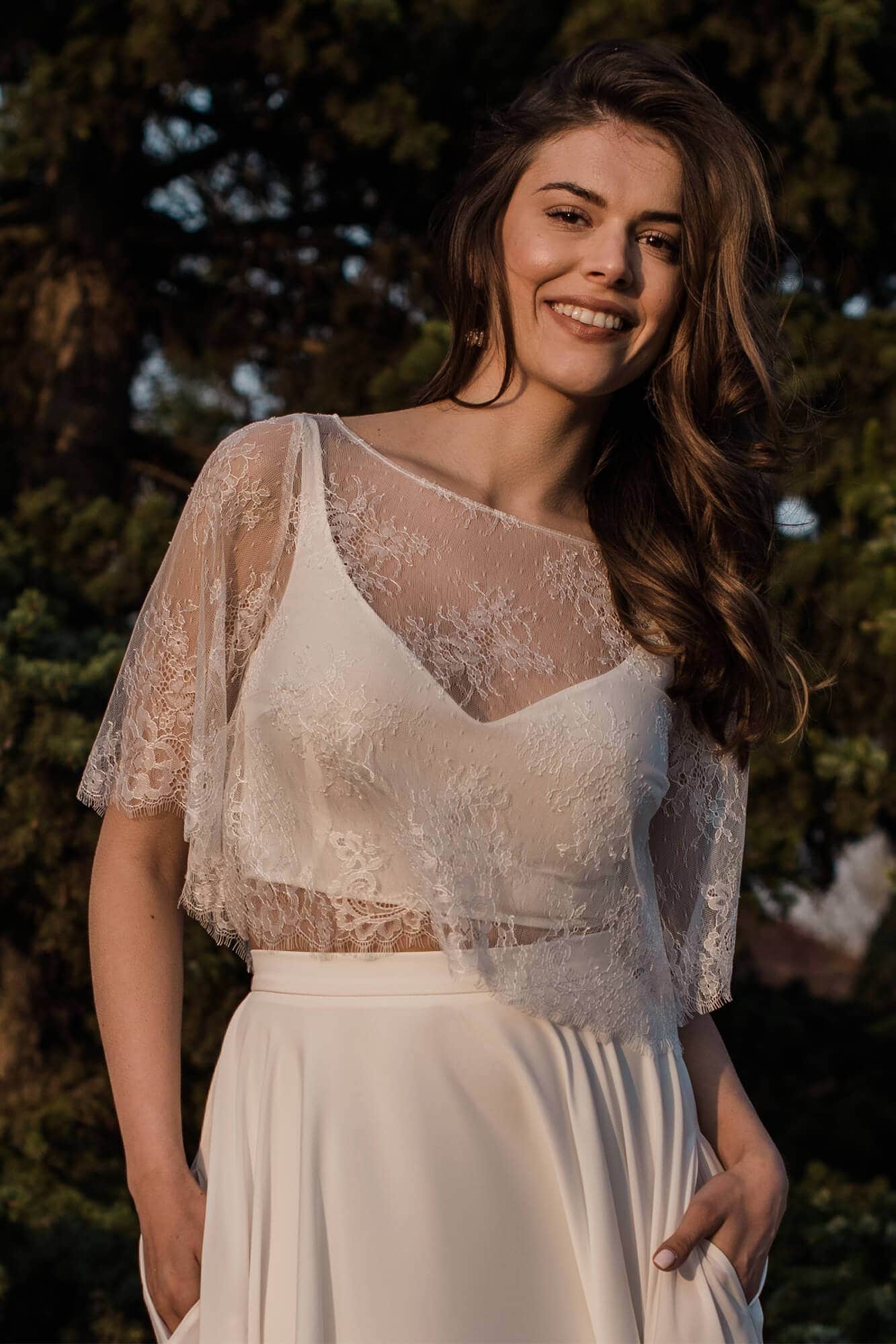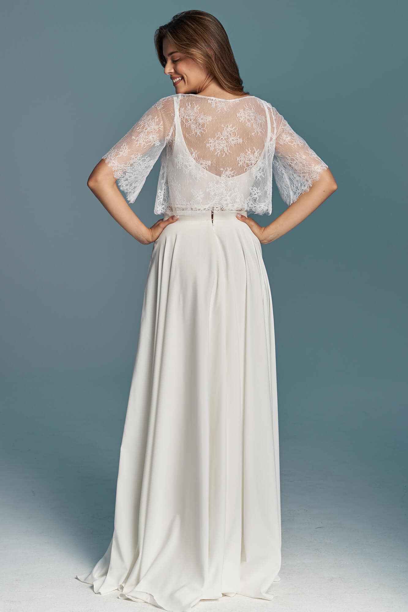 Długość bluzki została zaprojektowana tak, by ciało było widoczne głównie przy unoszeniu rąk. Dzięki temu dwuczęściowa suknia ślubna może być odpowiednia również do ceremonii kościelnej. Po ślubie top możesz nosić jako narzutkę lub łączyć z innymi elementami garderoby. Ilość dostępnej koronki jest ograniczona.