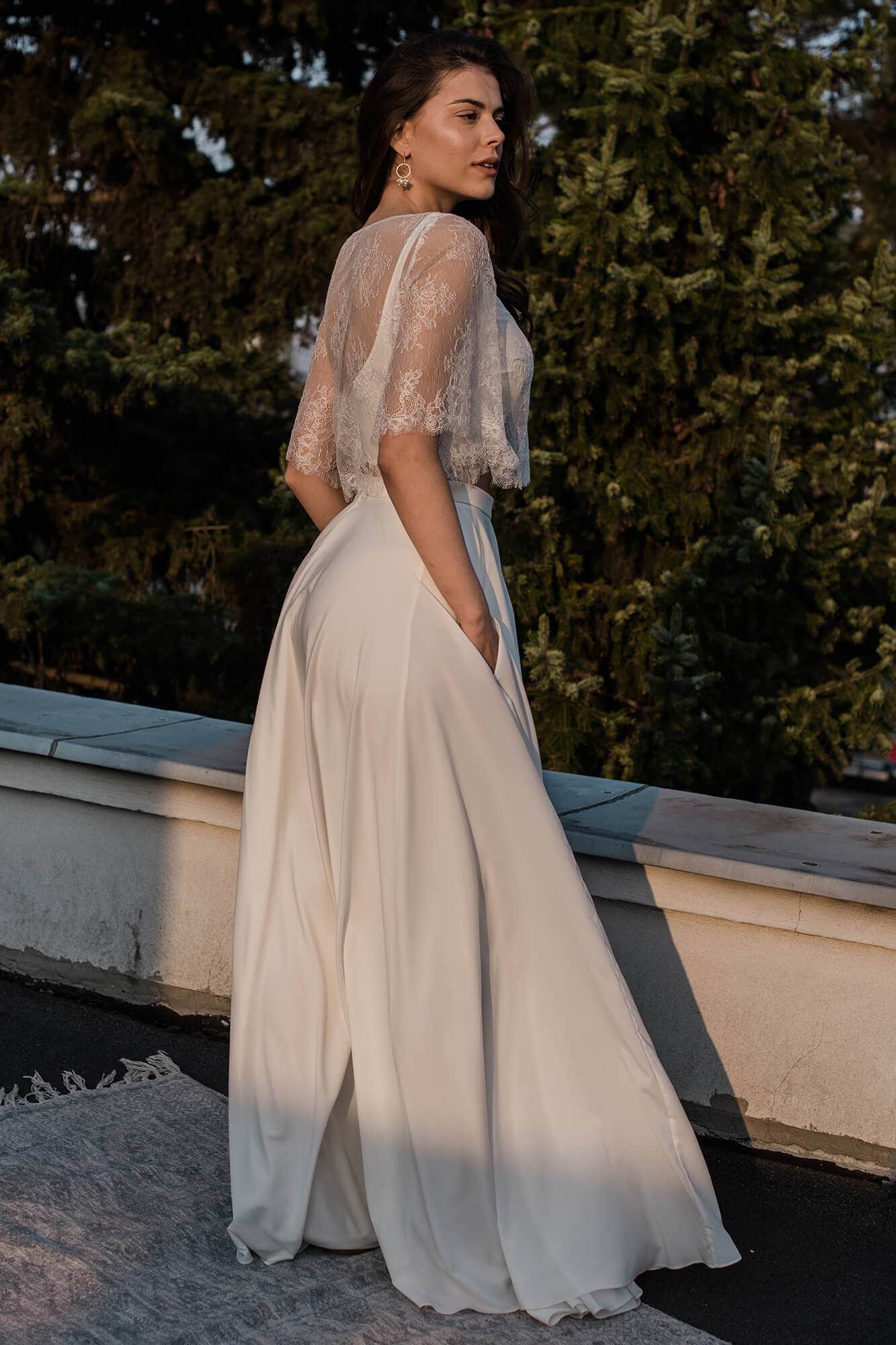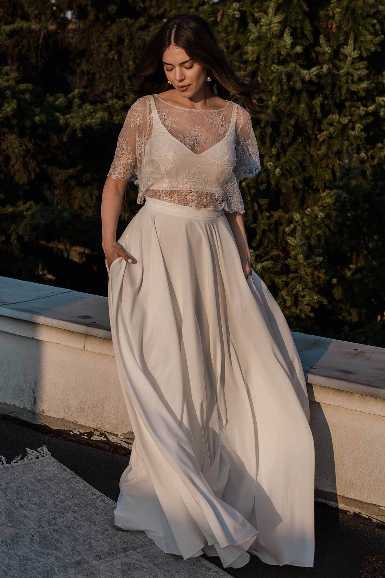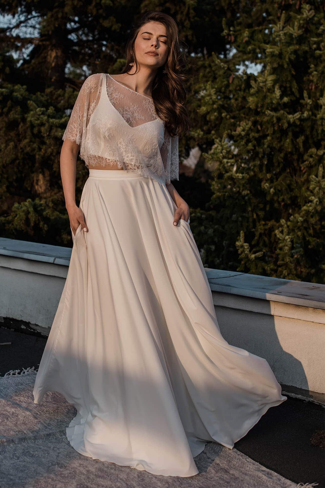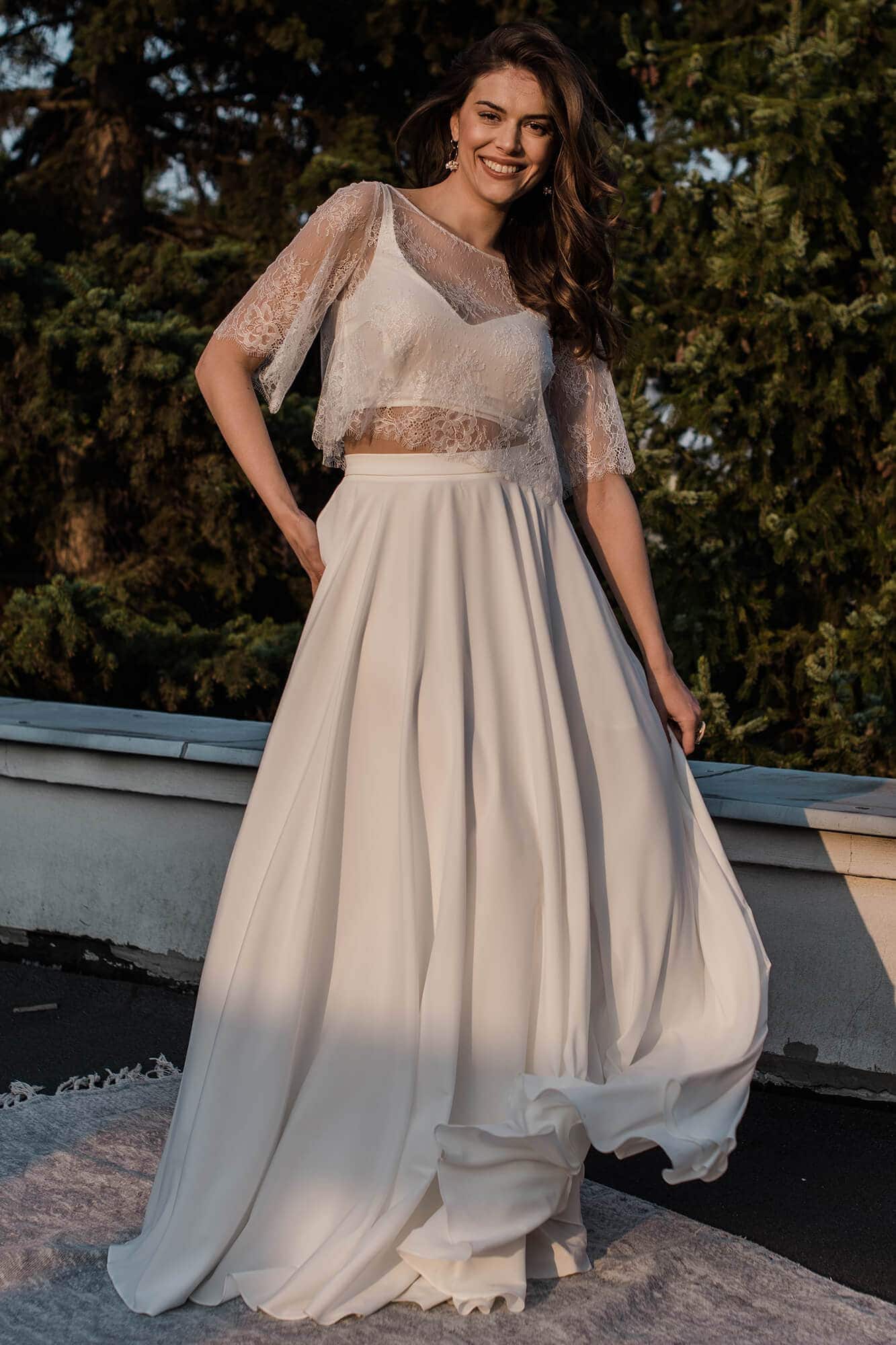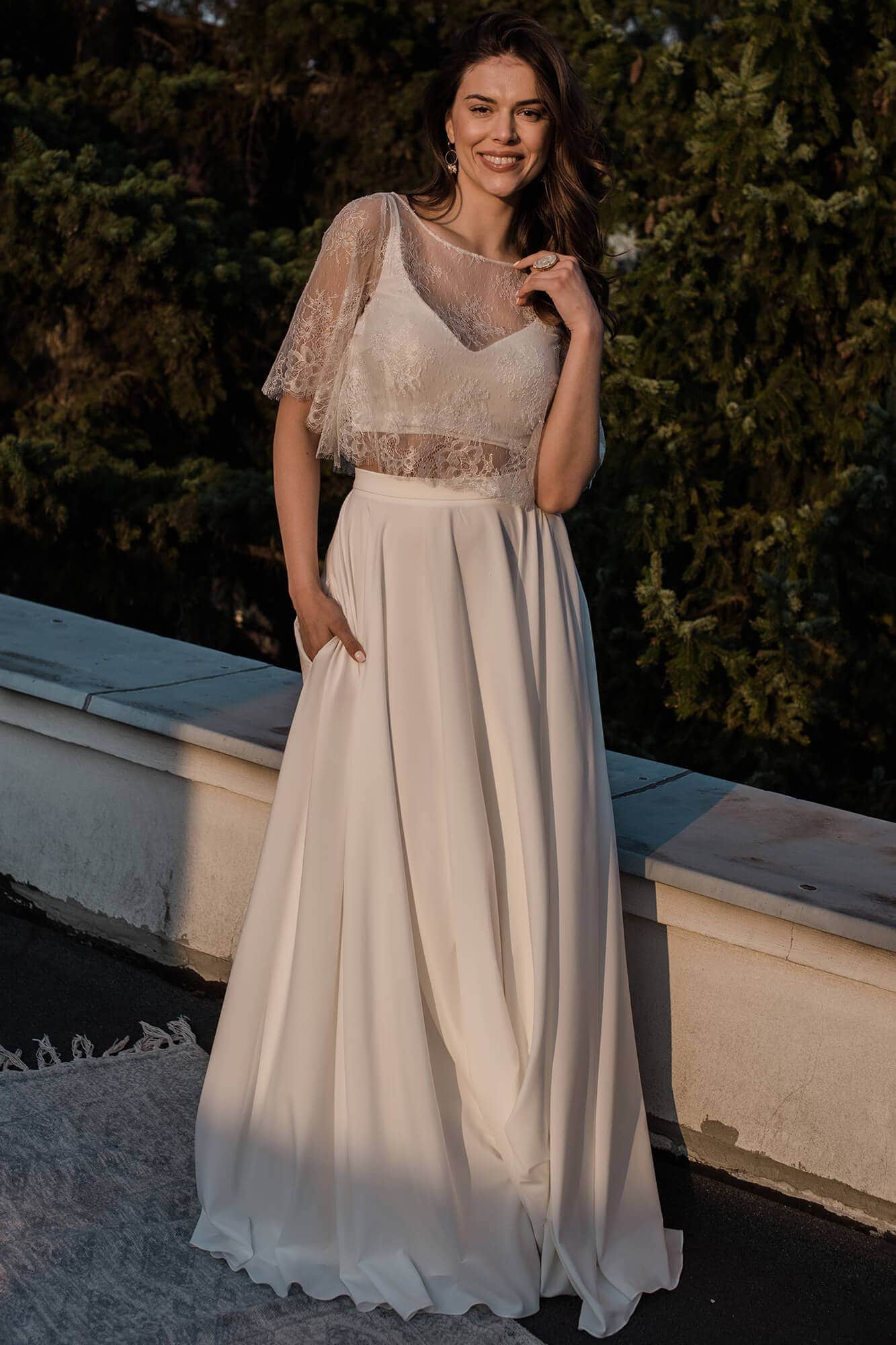 Dwuczęściowa, gładka suknia ślubna z rozkloszowaną spódnicą z koła i koronkowym topem. Spódnica ma kieszenie i pięknie układa się w ruchu. Bluzka składa się z elastycznej, dwustronnej podszewki (ecru lub cielistej) oraz miękkiej koronki z dekoltem w łódeczkę. Rękawek jest lekki i przewiewny, odpowiedni na letnie wesele. Oba elementy możesz nosić także po ślubie.