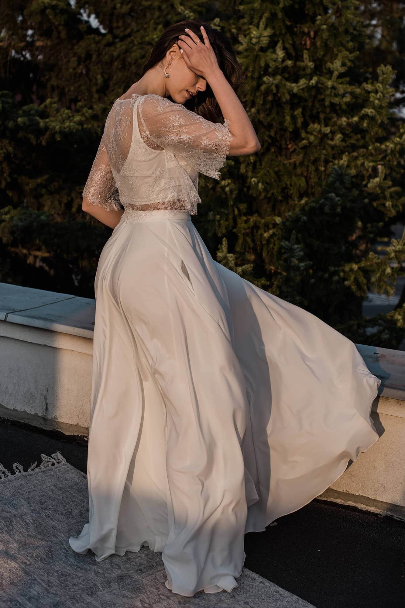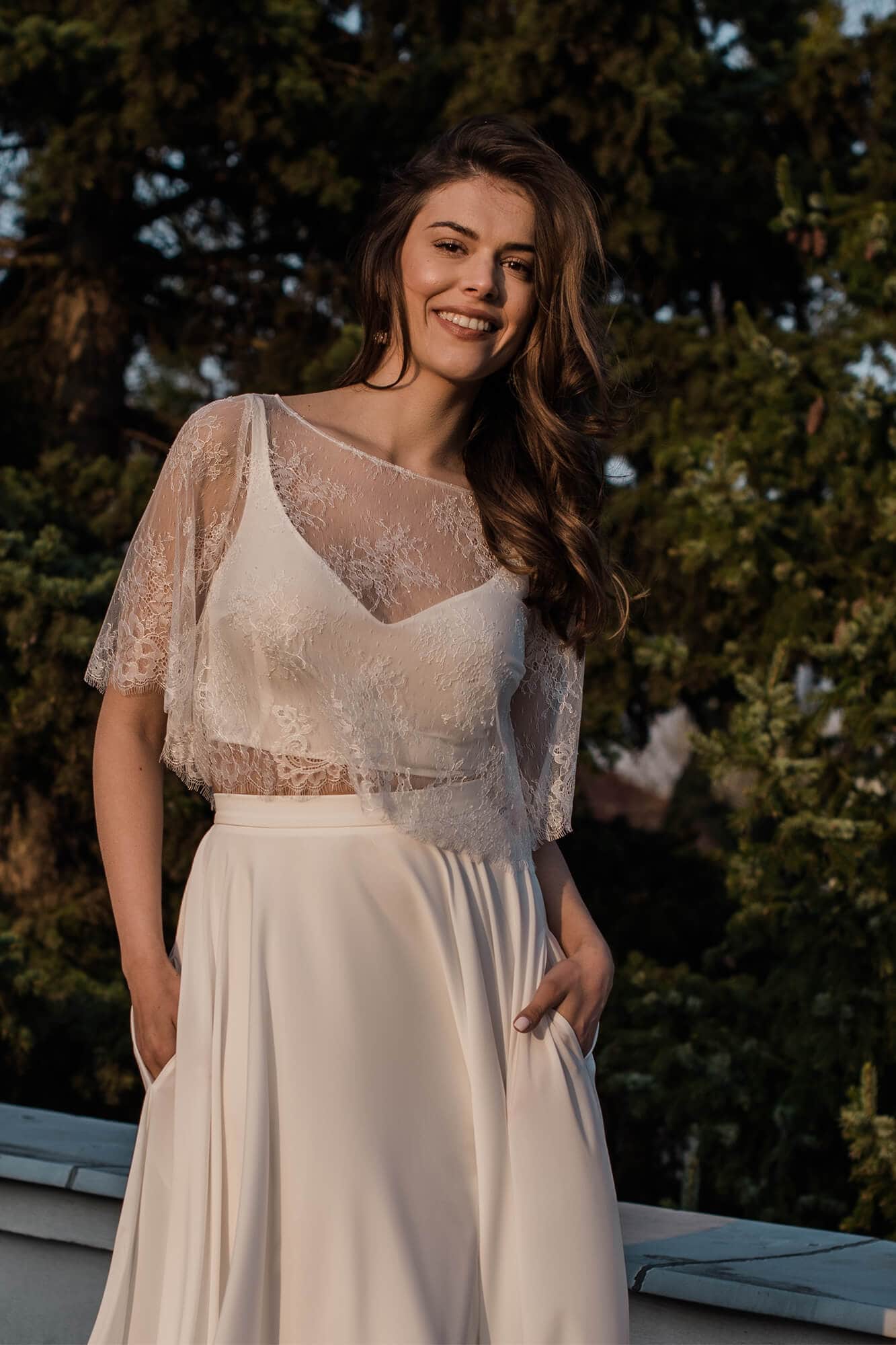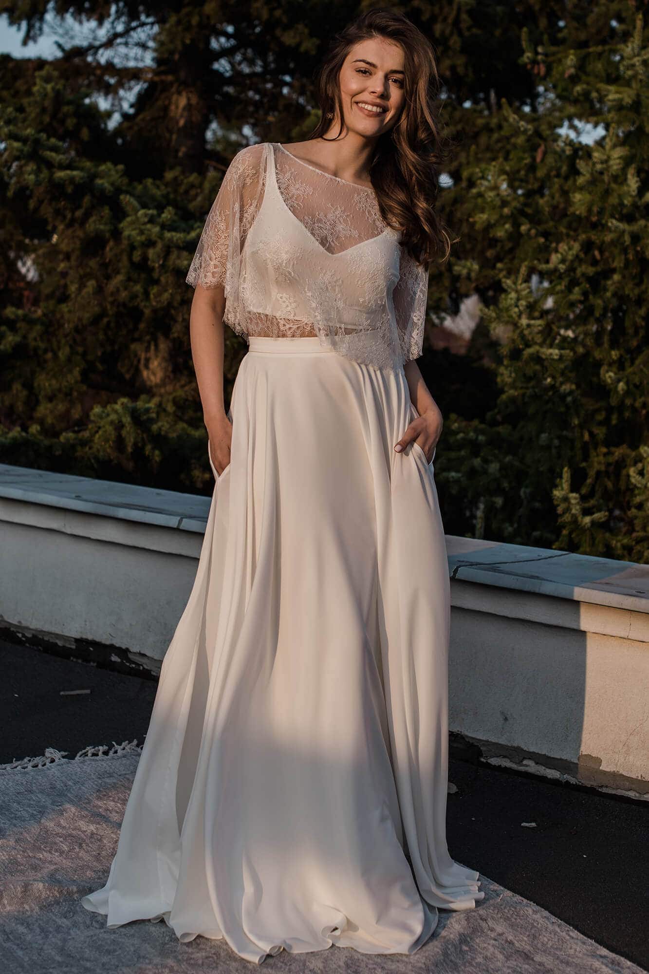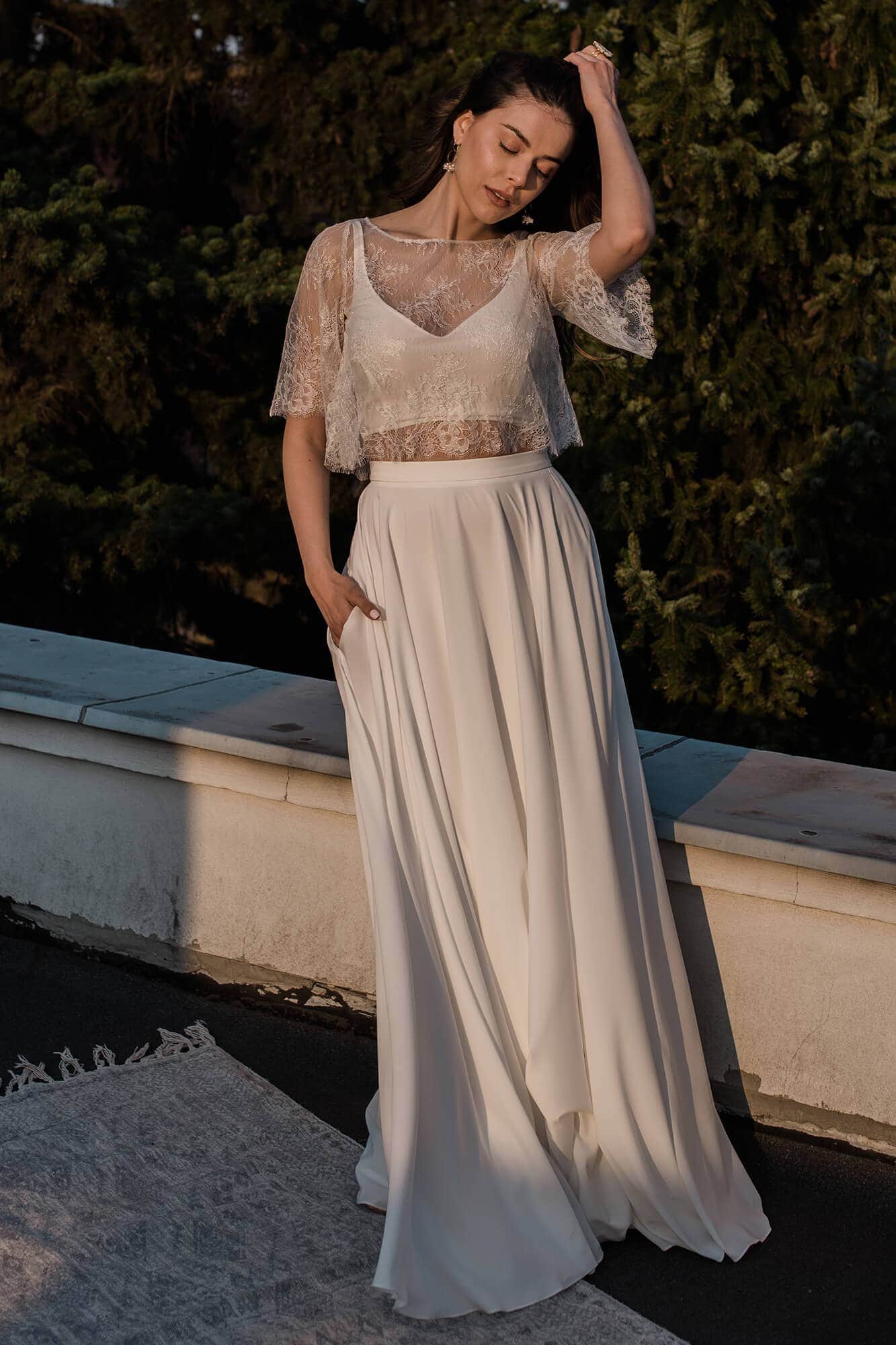 Dwuczęściowa, gładka suknia ślubna z rozkloszowaną spódnicą z koła i koronkowym topem. Spódnica ma kieszenie i pięknie układa się w ruchu. Bluzka składa się z elastycznej, dwustronnej podszewki (ecru lub cielistej) oraz miękkiej koronki z dekoltem w łódeczkę. Rękawek jest lekki i przewiewny, odpowiedni na letnie wesele. Oba elementy możesz nosić także po ślubie.