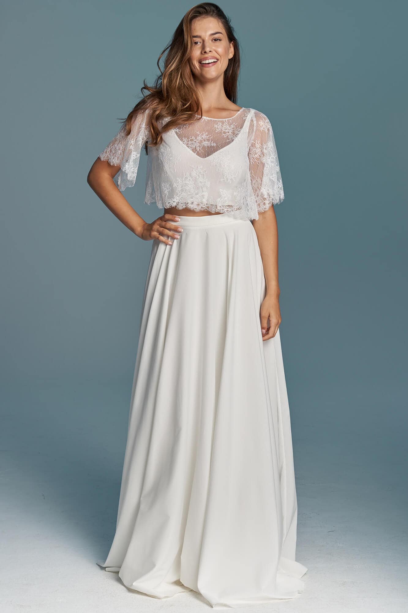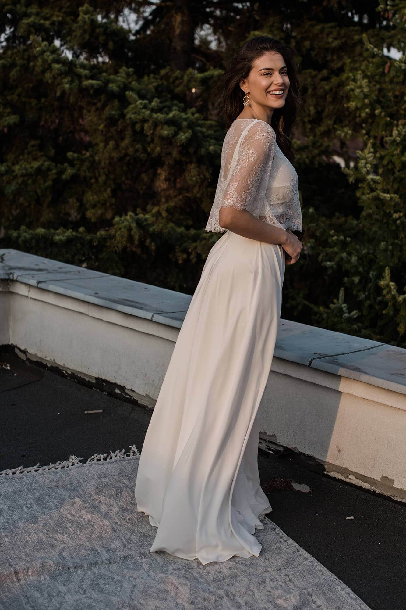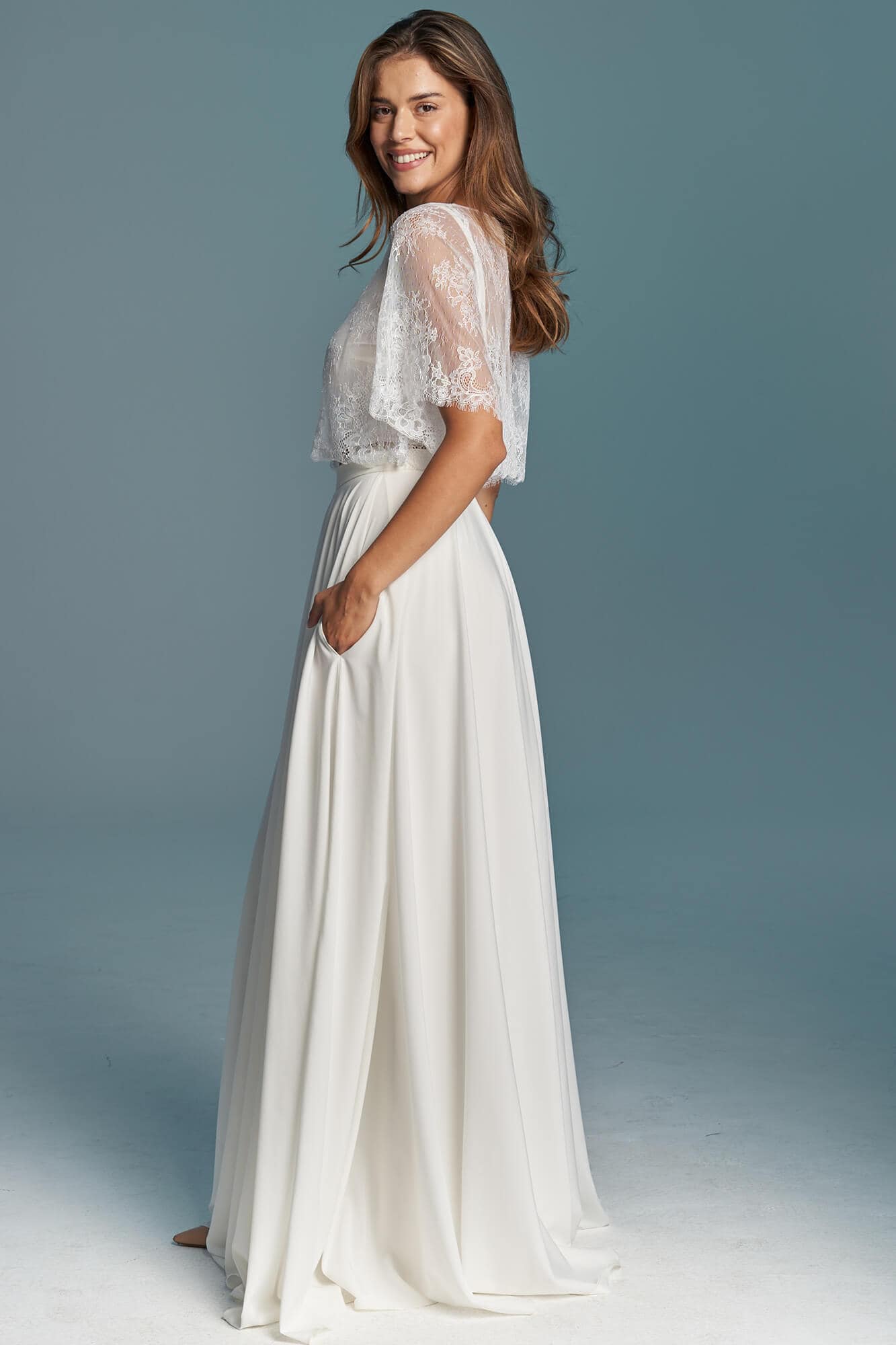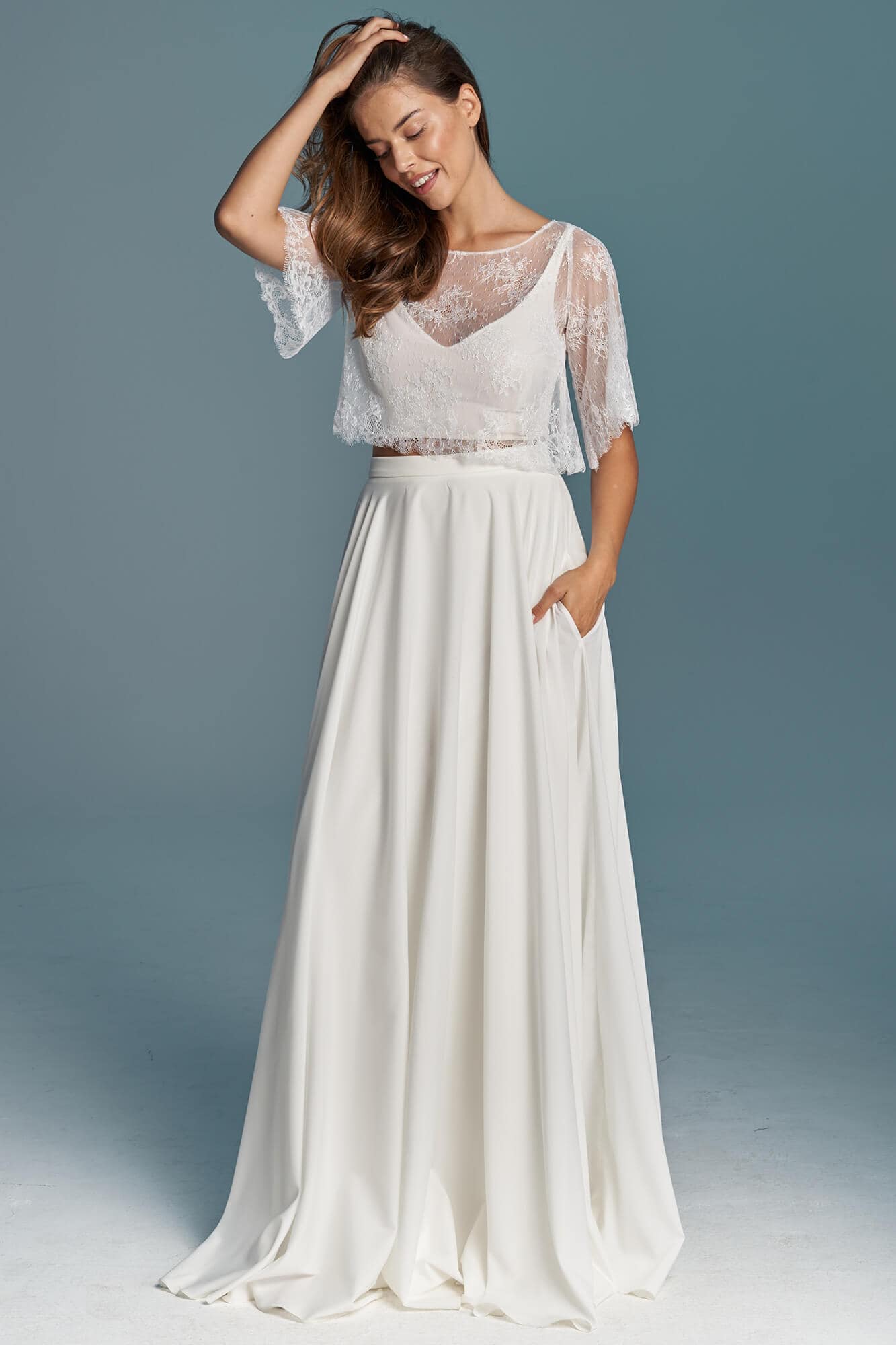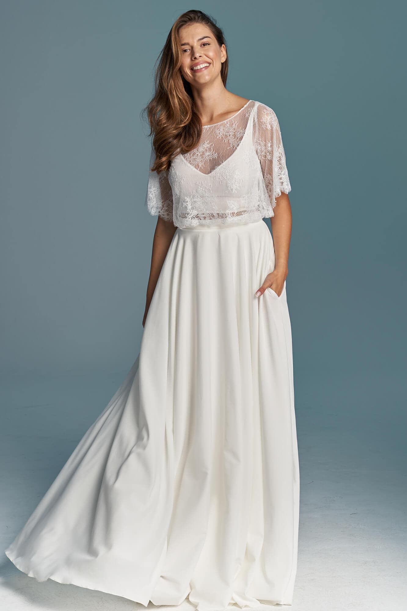 Dwuczęściowa, gładka suknia ślubna z rozkloszowaną spódnicą z koła i koronkowym topem. Spódnica ma kieszenie i pięknie układa się w ruchu. Bluzka składa się z elastycznej, dwustronnej podszewki (ecru lub cielistej) oraz miękkiej koronki z dekoltem w łódeczkę. Rękawek jest lekki i przewiewny, odpowiedni na letnie wesele. Oba elementy możesz nosić także po ślubie.