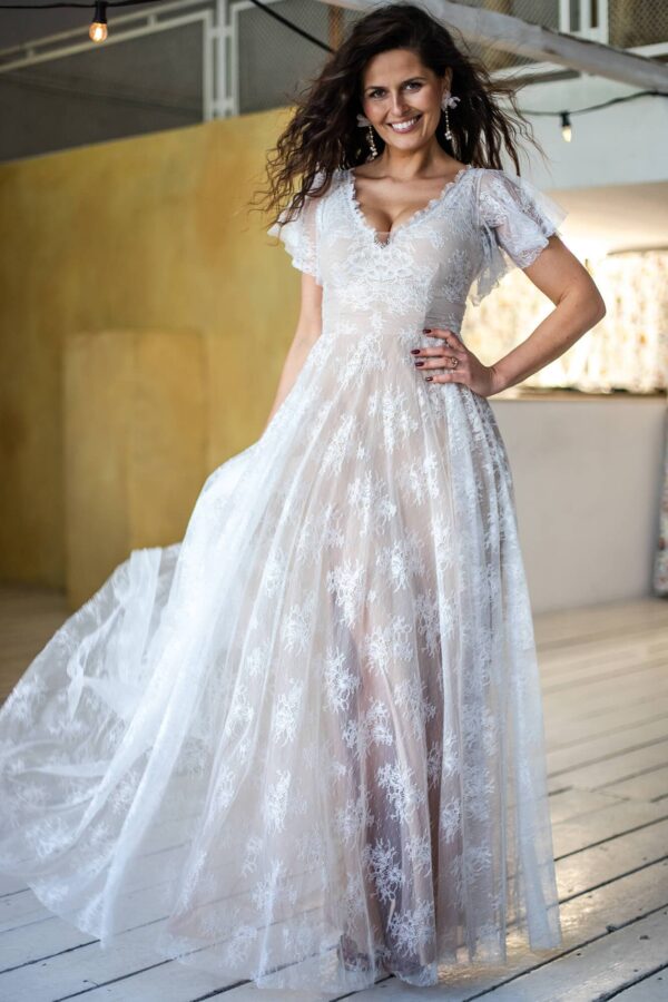 Romantyczna suknia ślubna z lekkimi rękawkami i spódnicą z koła. Koronka w odcieniu écru zestawiona z cielistym tiulem nadaje całości miękki, twarzowy kolor. Przezroczyste rękawki delikatnie osłaniają ramiona, nie poszerzając ich optycznie. Rozkloszowany dół pomaga wyrównać proporcje sylwetki i podkreślić talię. Model sprawdzi się zarówno w stylu boho, jak i w bardziej eleganckiej oprawie.