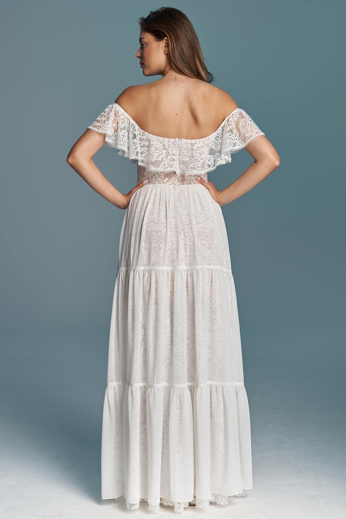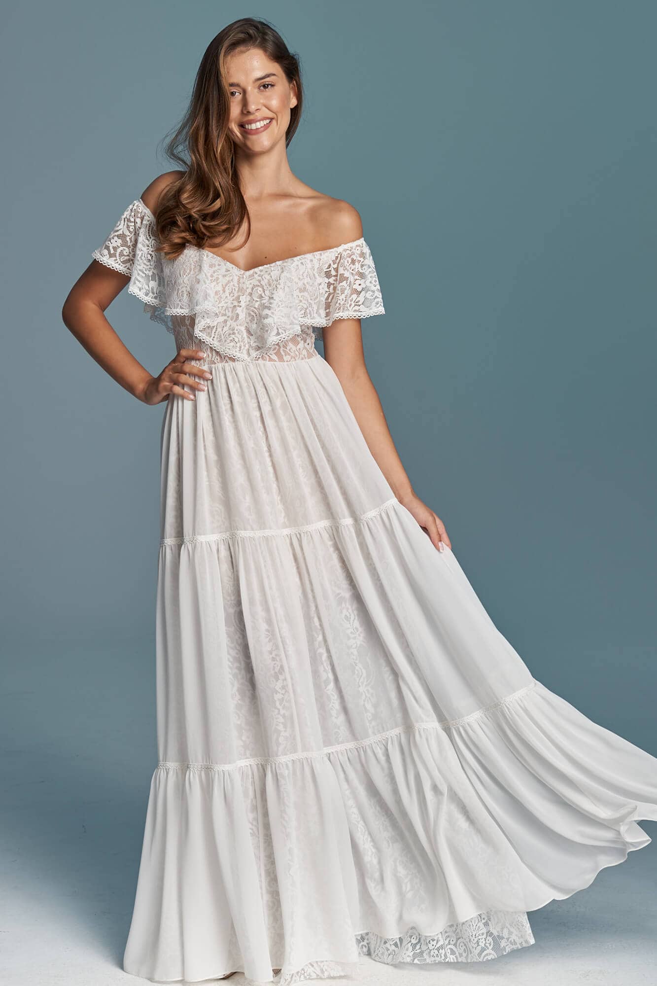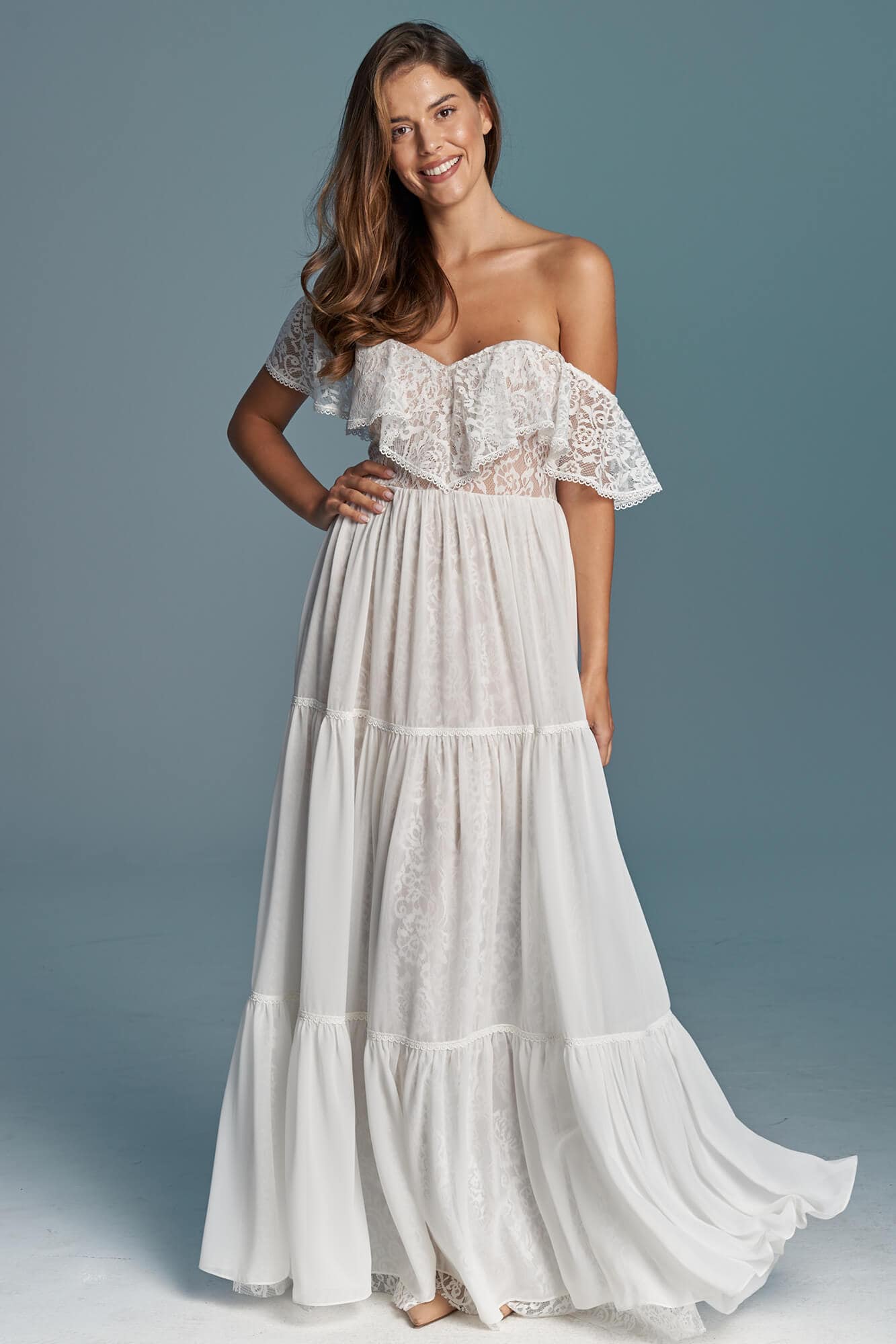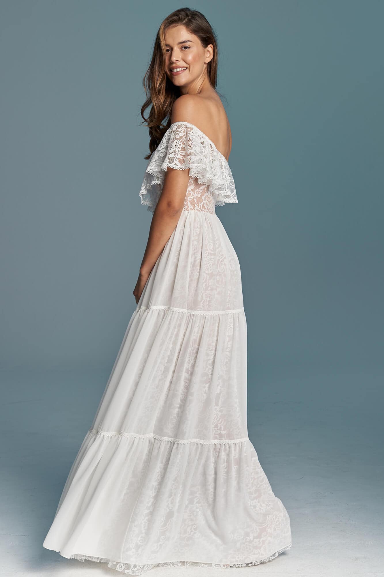 Suknia ślubna hiszpanka z odkrytymi ramionami i falbaną wykończoną tasiemką. Uszyta z miękkiej, elastycznej koronki, z warstwową spódnicą podzieloną na trzy piętra. Cienka, gładka warstwa wierzchnia dodaje lekkości i nie zasłania wzoru koronki. Linia dekoltu została ukształtowana tak, by podkreślić obojczyki i zachować równowagę proporcji. Model można skrócić i nosić także po ślubie.