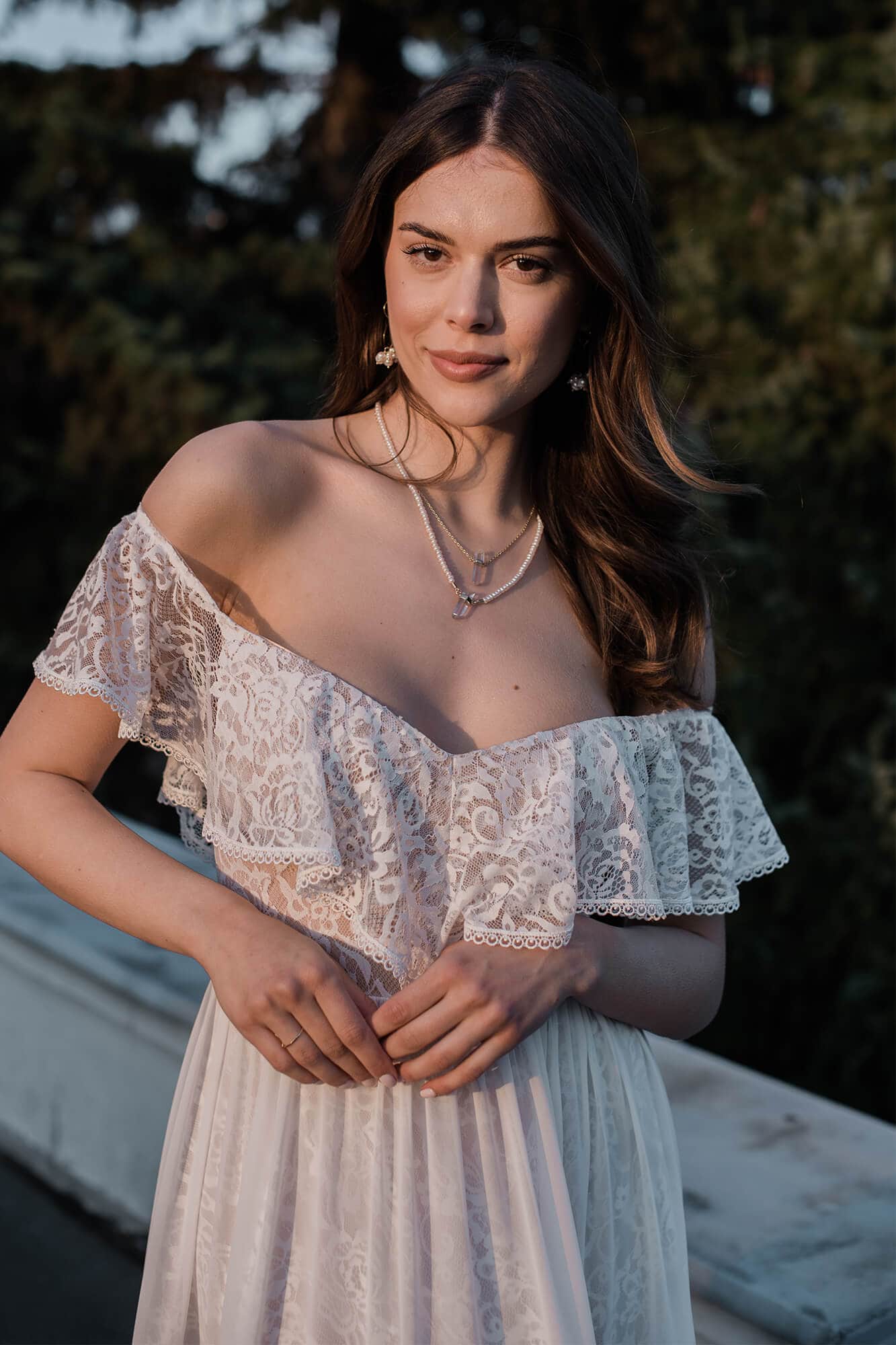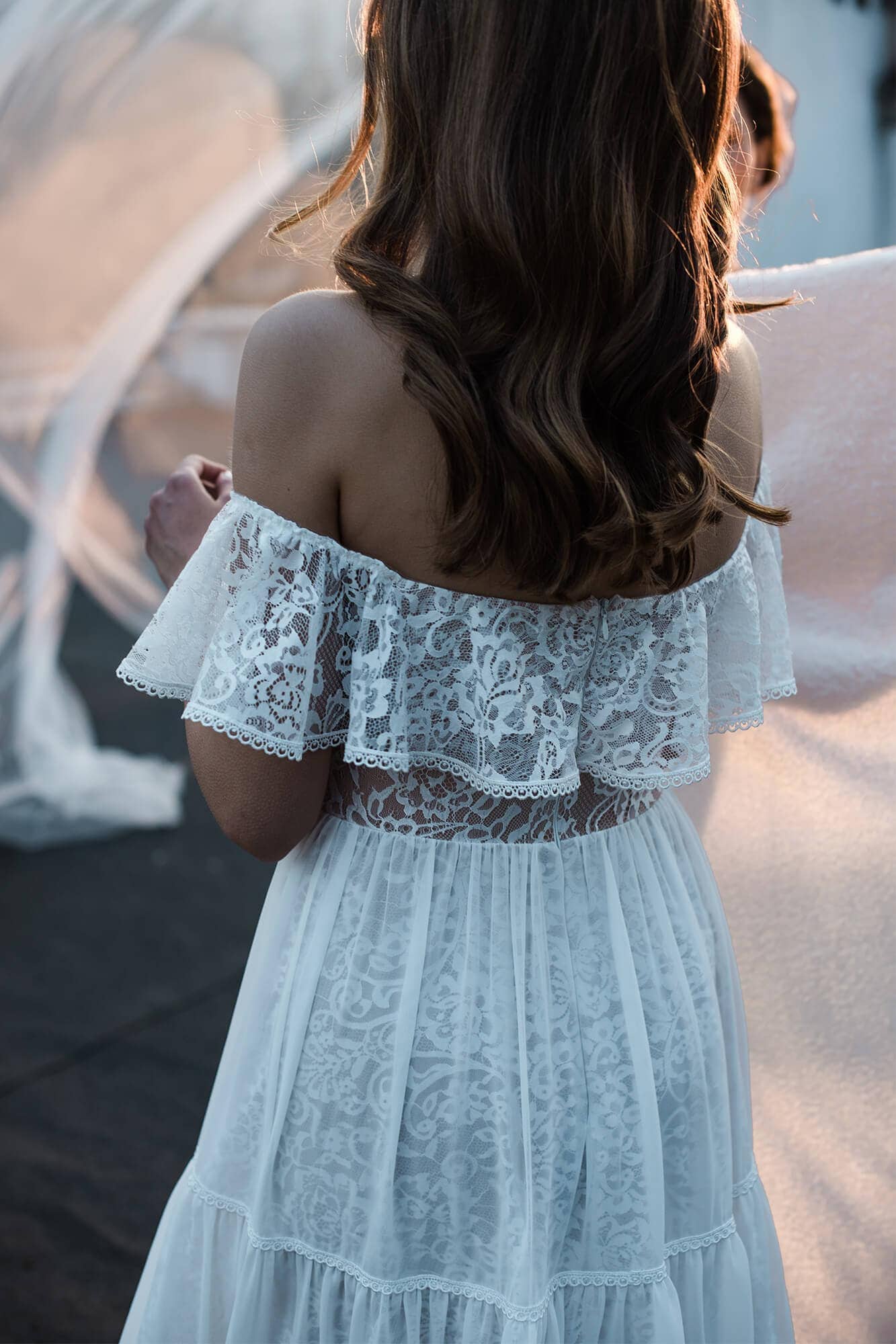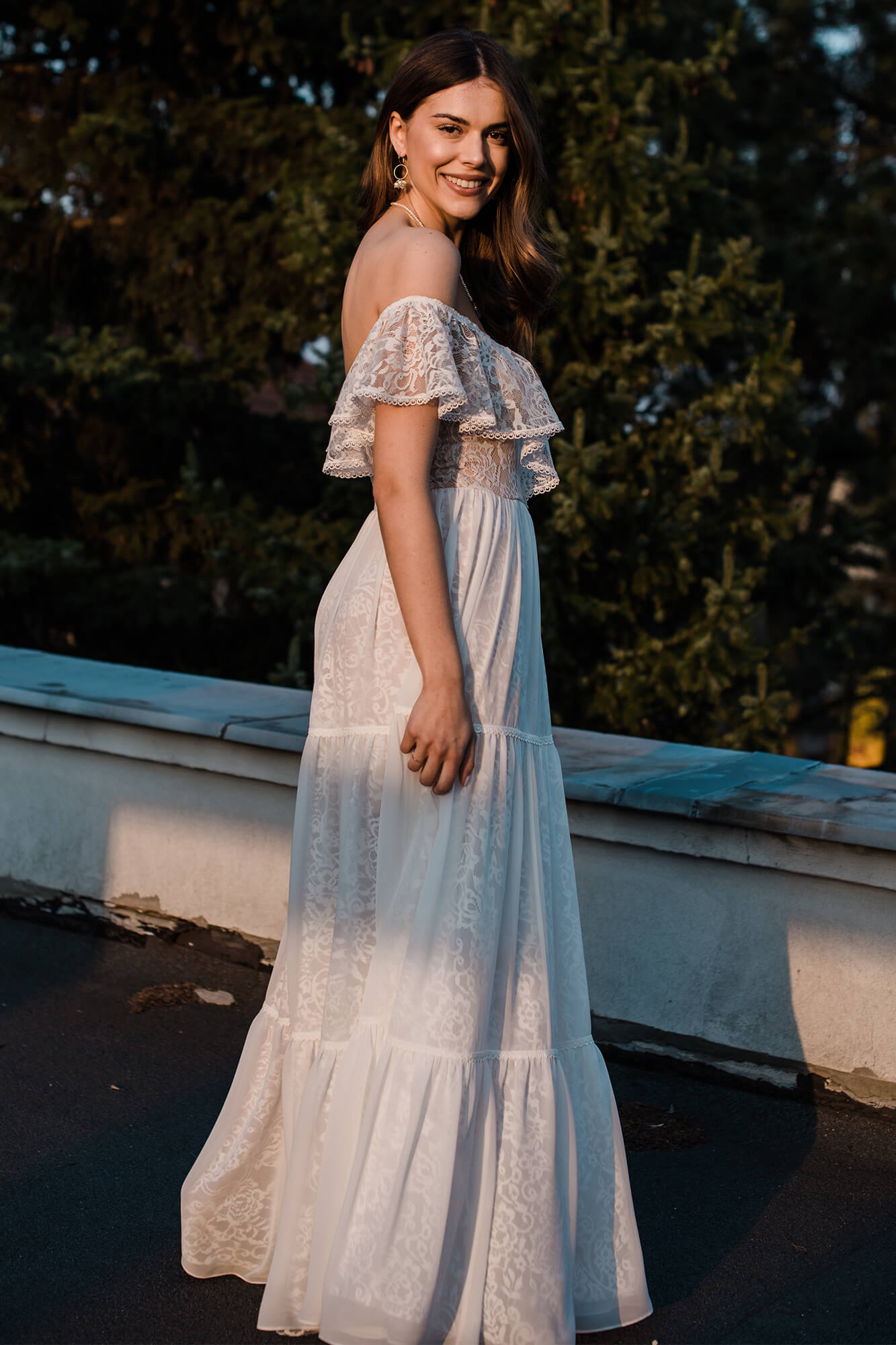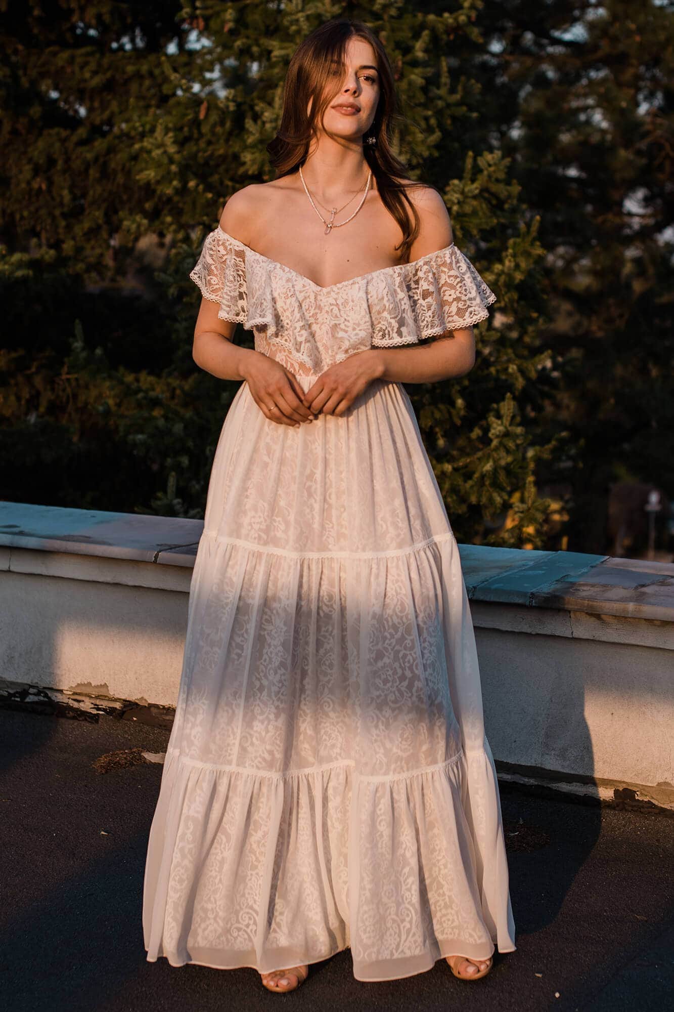 Suknia ślubna hiszpanka z odkrytymi ramionami i falbaną wykończoną tasiemką. Uszyta z miękkiej, elastycznej koronki, z warstwową spódnicą podzieloną na trzy piętra. Cienka, gładka warstwa wierzchnia dodaje lekkości i nie zasłania wzoru koronki. Linia dekoltu została ukształtowana tak, by podkreślić obojczyki i zachować równowagę proporcji. Model można skrócić i nosić także po ślubie.