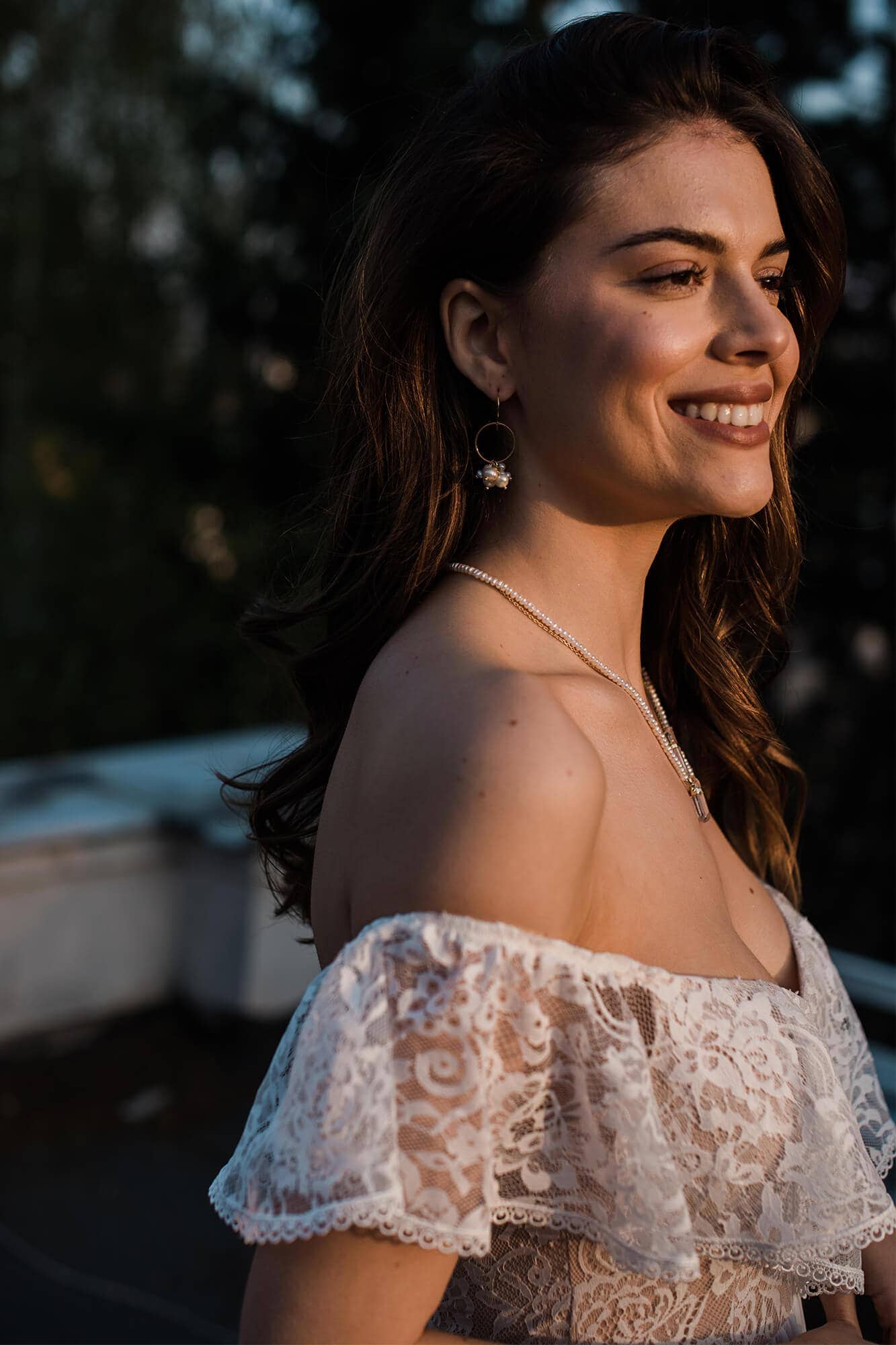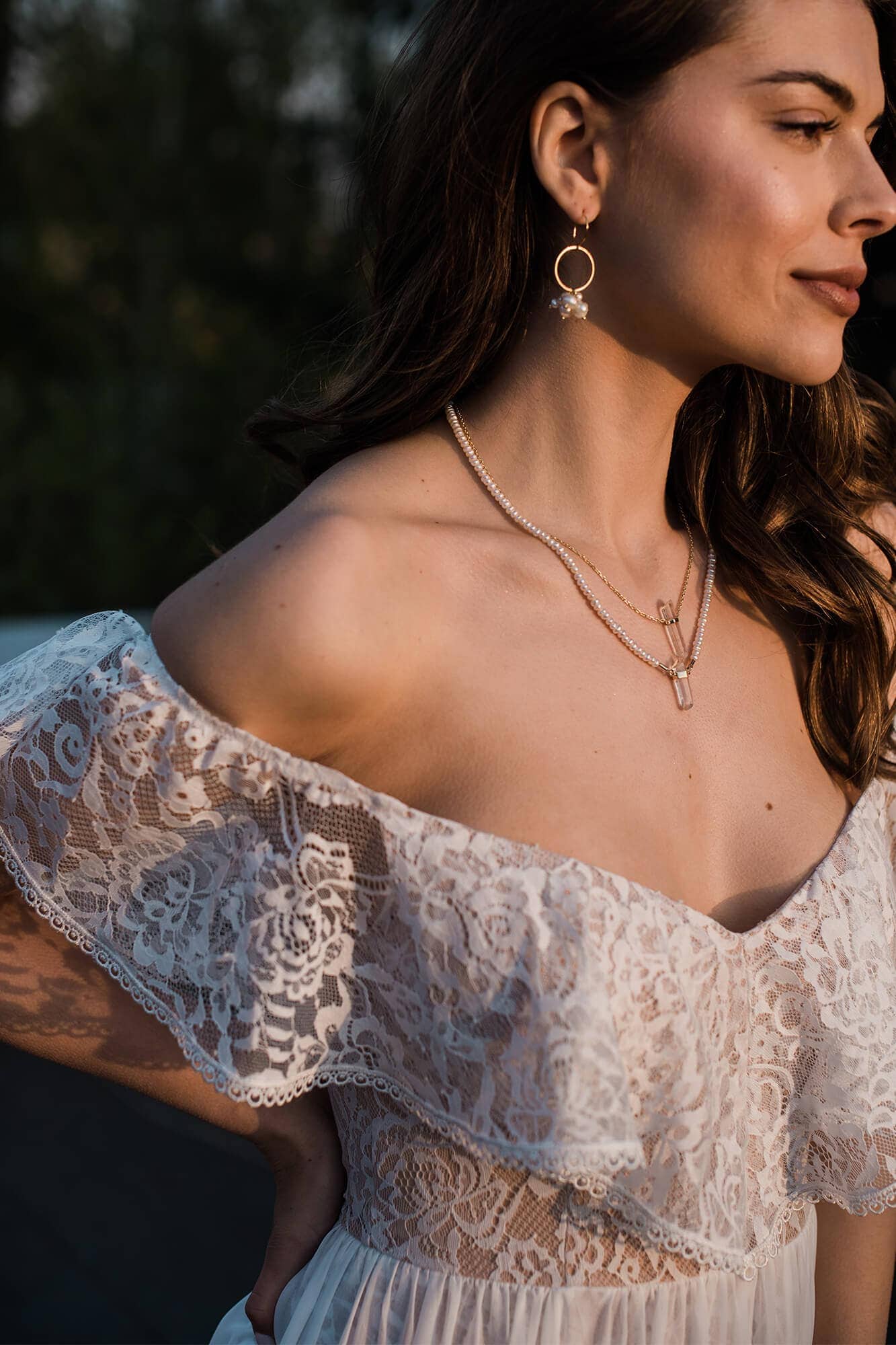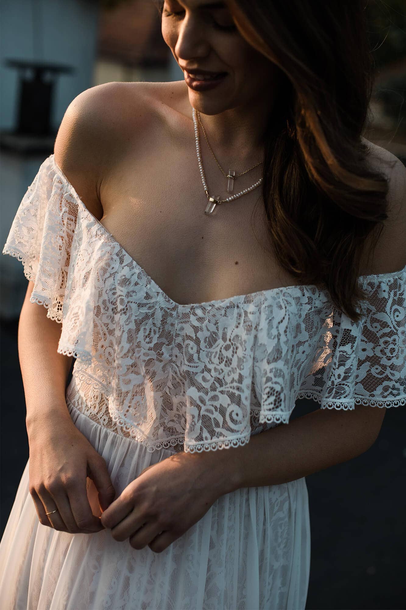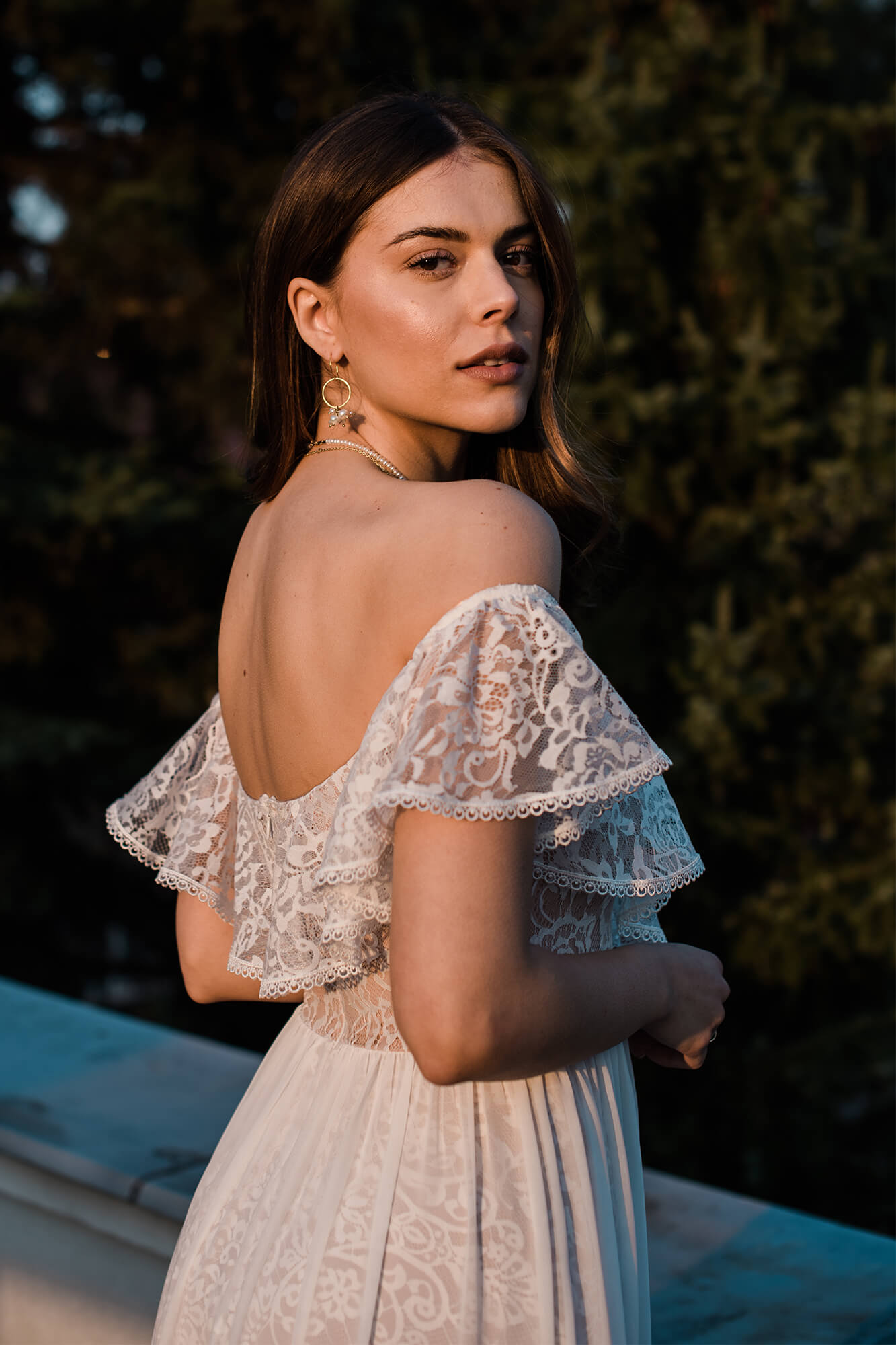 Suknia ślubna hiszpanka z odkrytymi ramionami i falbaną wykończoną tasiemką. Uszyta z miękkiej, elastycznej koronki, z warstwową spódnicą podzieloną na trzy piętra. Cienka, gładka warstwa wierzchnia dodaje lekkości i nie zasłania wzoru koronki. Linia dekoltu została ukształtowana tak, by podkreślić obojczyki i zachować równowagę proporcji. Model można skrócić i nosić także po ślubie.