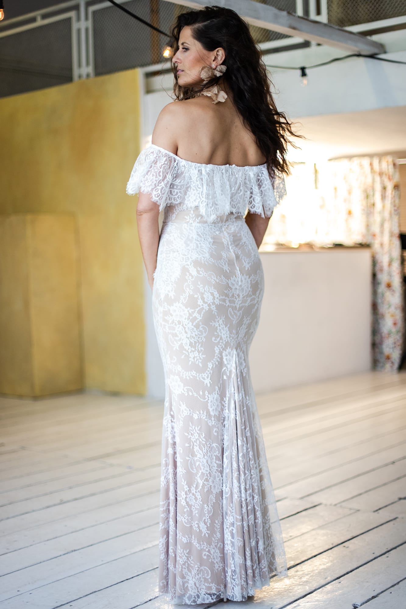 Dopasowana suknia ślubna typu hiszpanka z odkrytymi ramionami i falbaną przy dekolcie. Krój rybki podkreśla biodra i linię pleców, a wszyty z tyłu godet daje swobodę ruchu. Model eksponuje ramiona i dekolt, zachowując stabilność konstrukcji. Sprawdzi się także podczas intensywnej zabawy na parkiecie. Dostępna również w rozmiarze Plus Size.