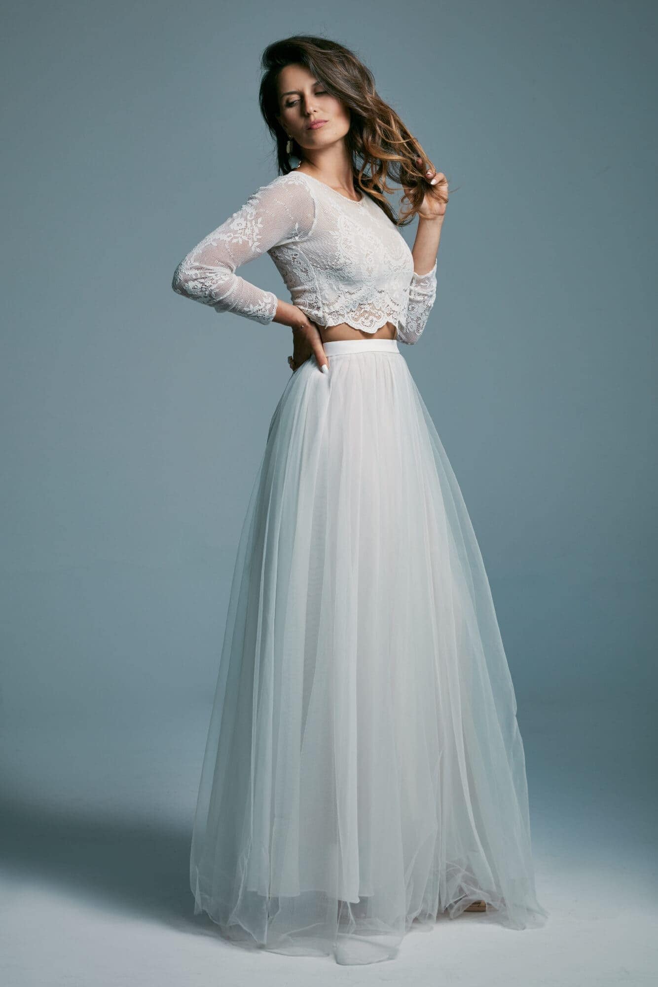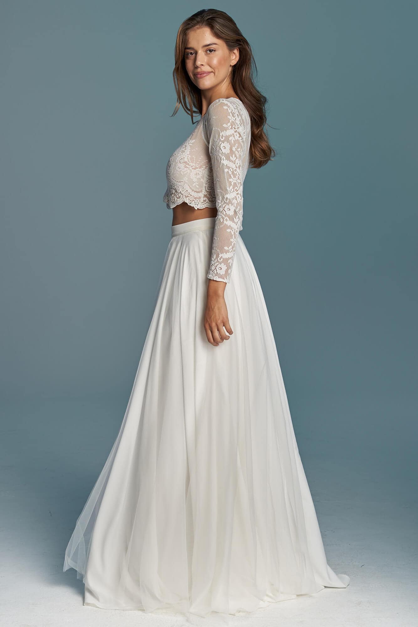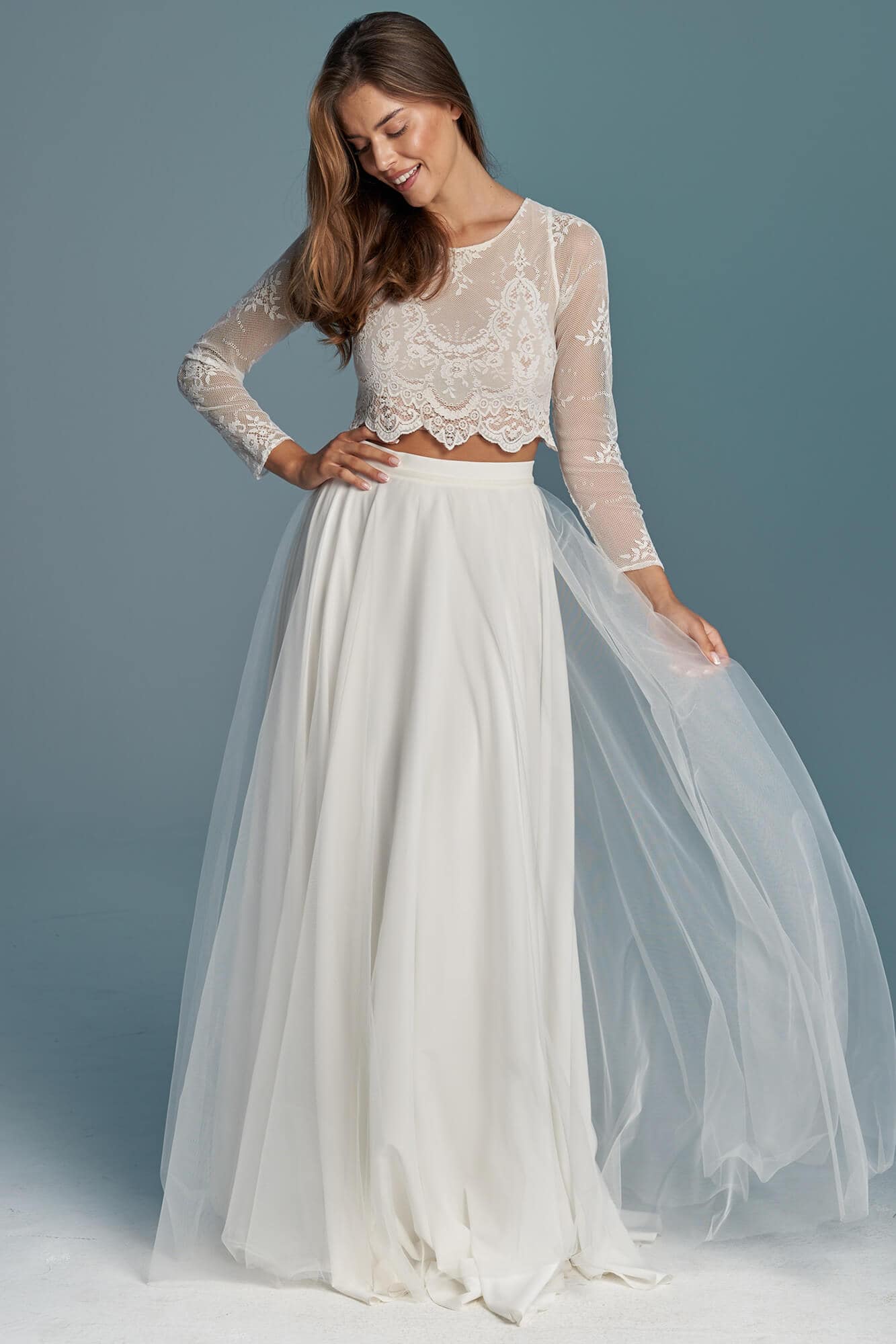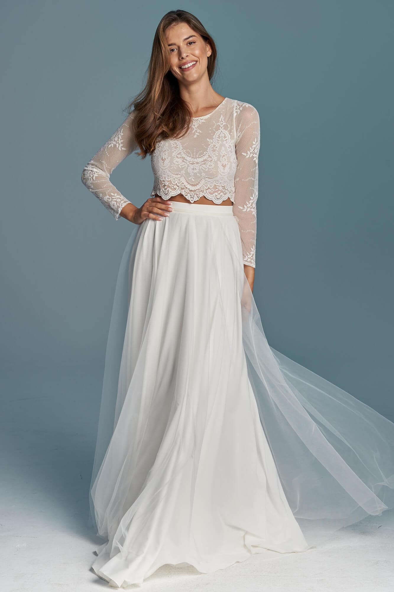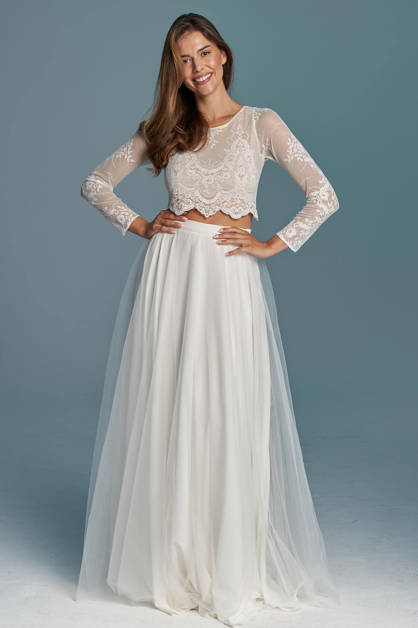 Dwuczęściowa suknia ślubna z kolekcji Porto to propozycja dla romantyczek ceniących elegancję i prostotę. Koronkowy top kończący się tuż nad talią, zabudowany pod szyję i z długim rękawem, nadaje stylizacji skromny charakter, jednocześnie subtelnie eksponując linię brzucha. To model praktyczny i funkcjonalny.