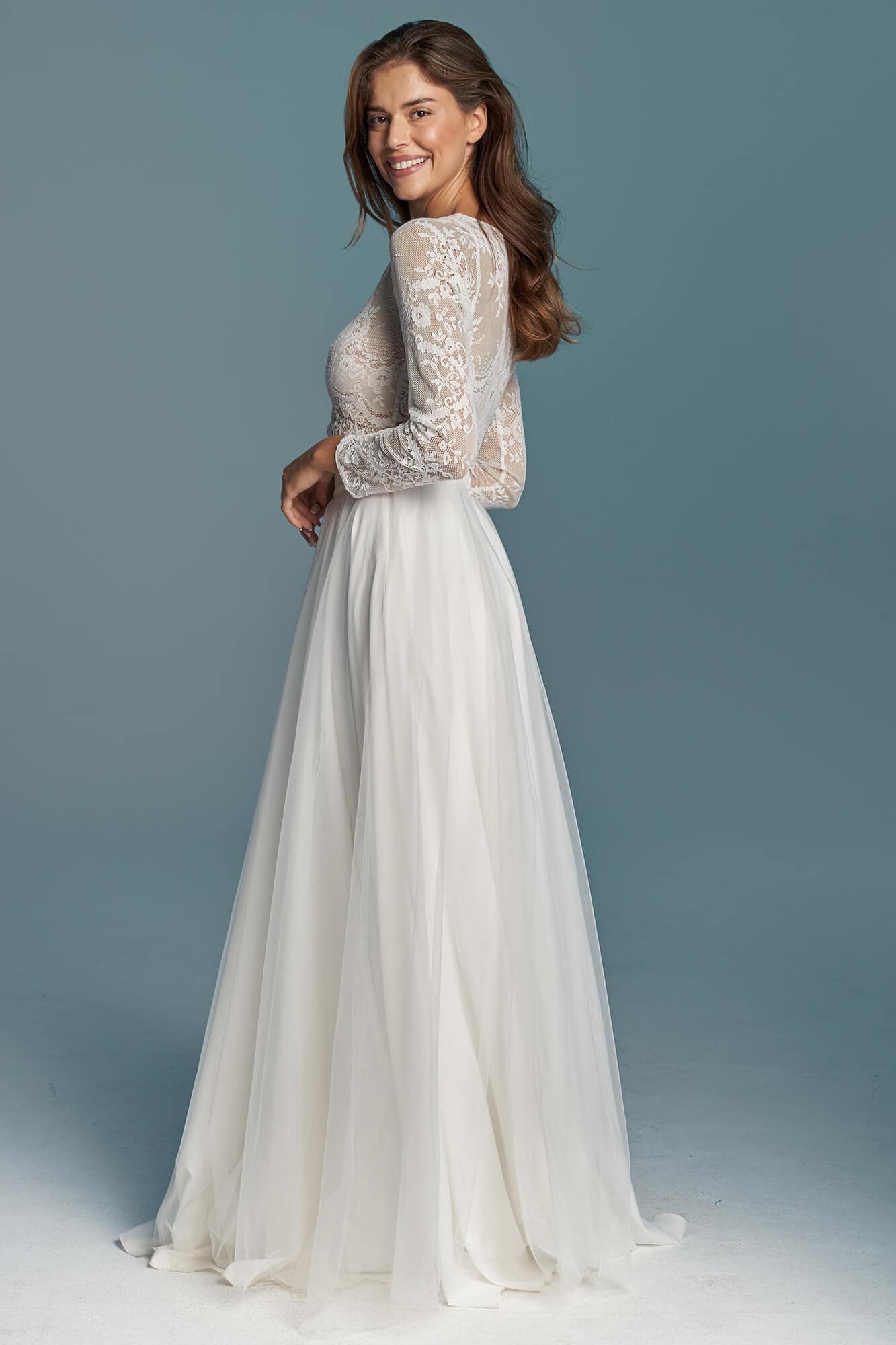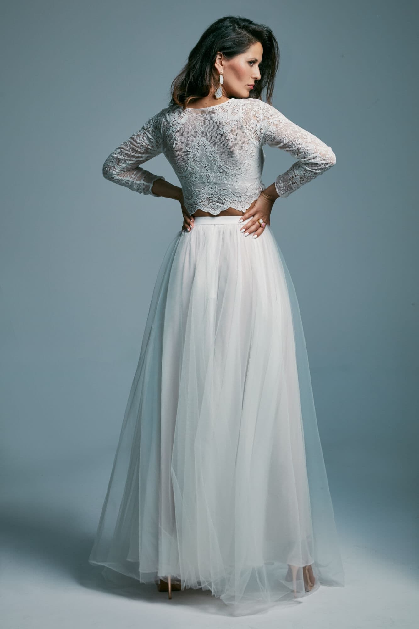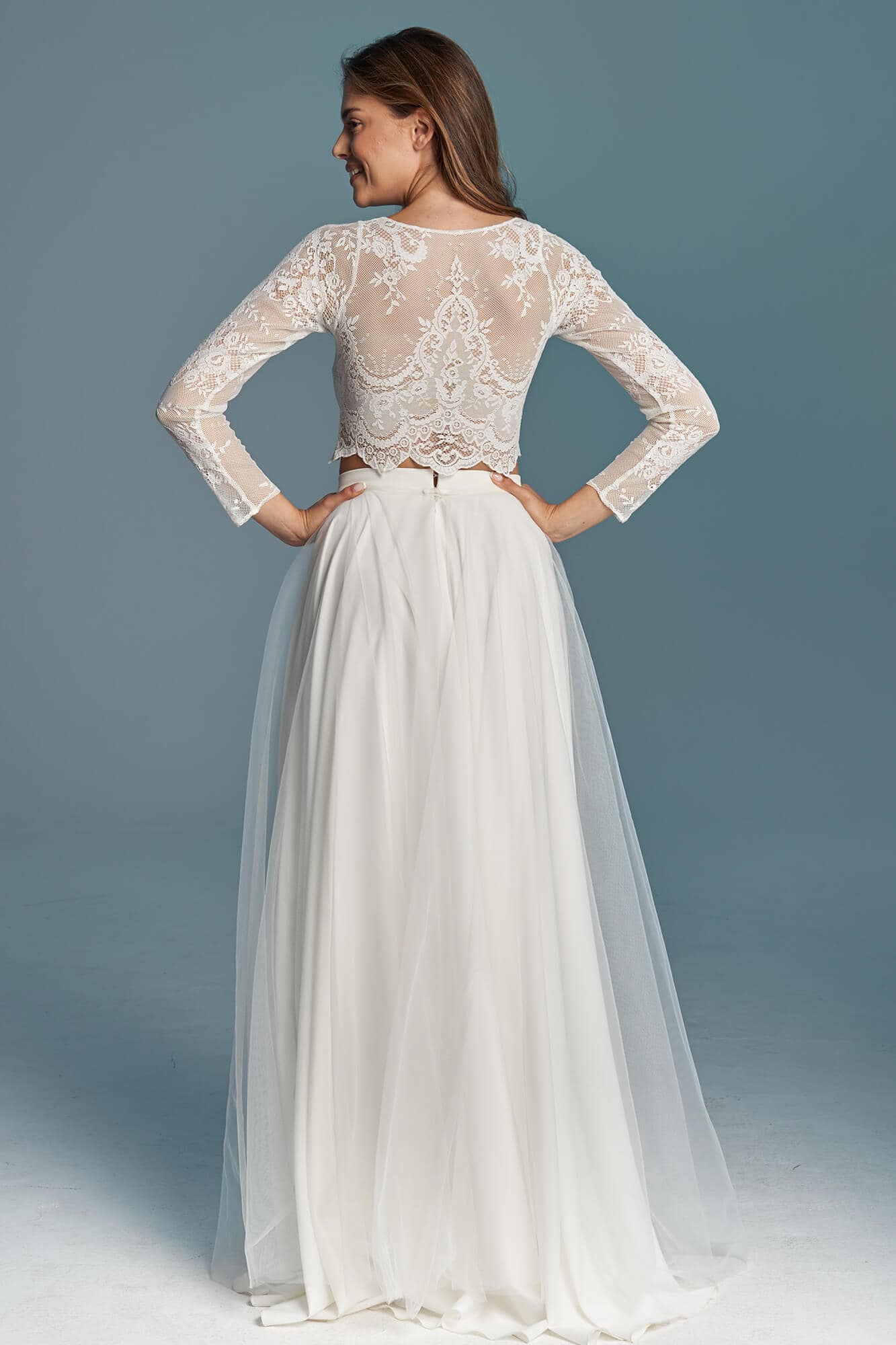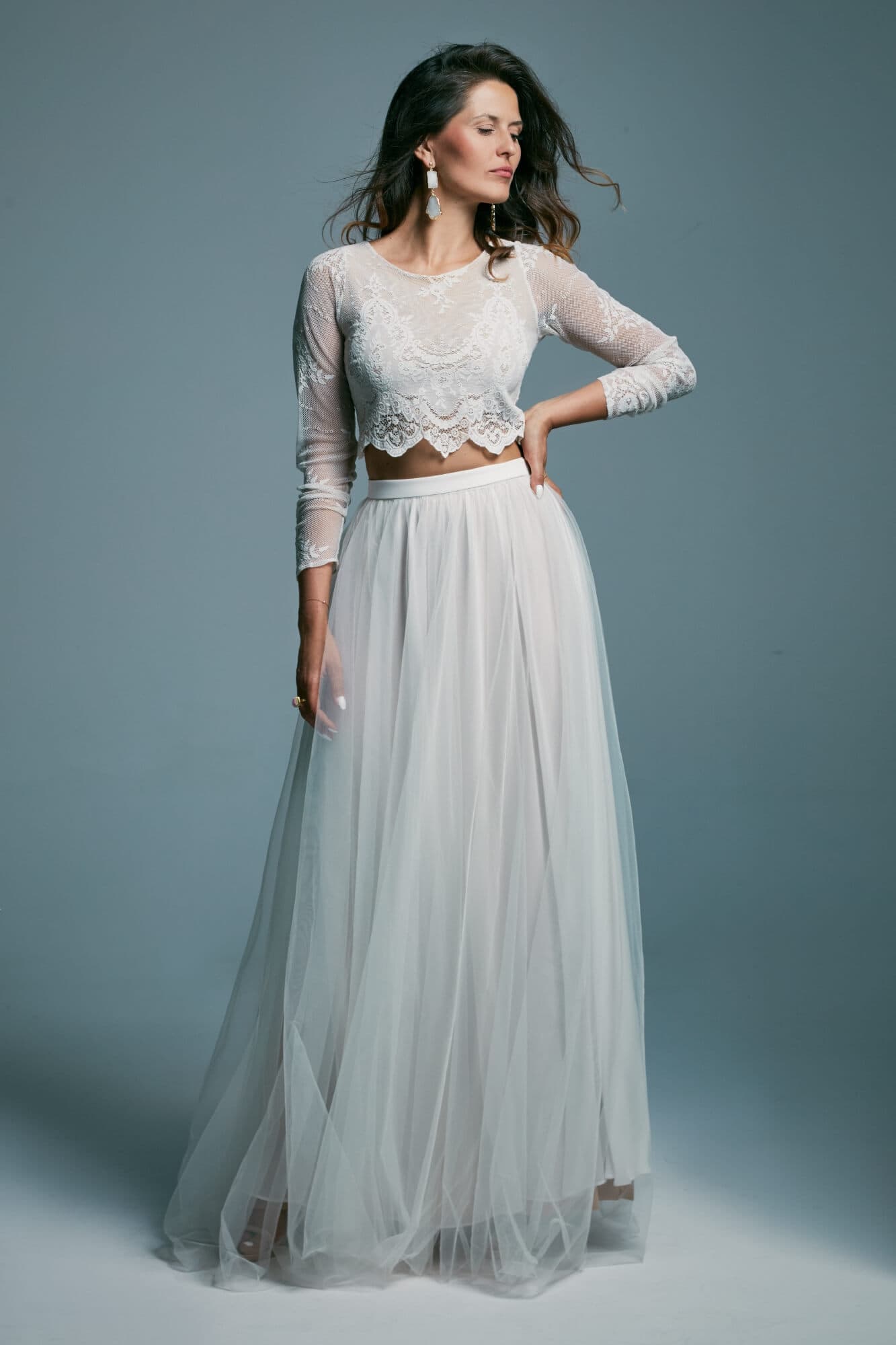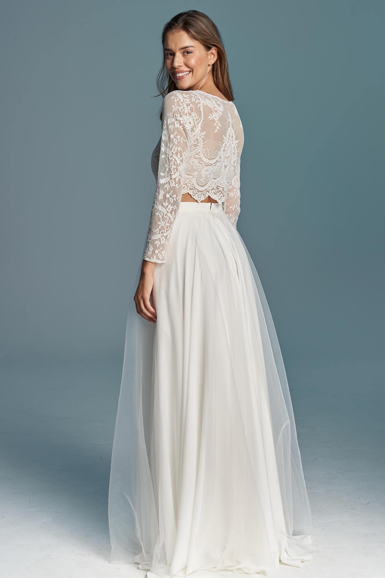 Dwuczęściowa suknia ślubna z kolekcji Porto to propozycja dla romantyczek ceniących elegancję i prostotę. Koronkowy top kończący się tuż nad talią, zabudowany pod szyję i z długim rękawem, nadaje stylizacji skromny charakter, jednocześnie subtelnie eksponując linię brzucha. To model praktyczny i funkcjonalny.