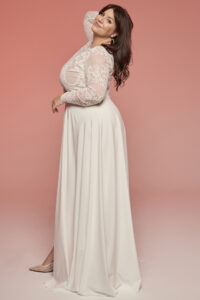 Model łączy klasyczną formę z nowoczesnym podziałem na dwie części, co pozwala na swobodne stylizowanie elementów także po ślubie. Zabudowana góra umożliwia założenie biustonosza, zwiększając komfort noszenia. To propozycja dla kobiet, które chcą połączyć romantyczny charakter z funkcjonalnością i świadomym podkreśleniem swojej sylwetki.