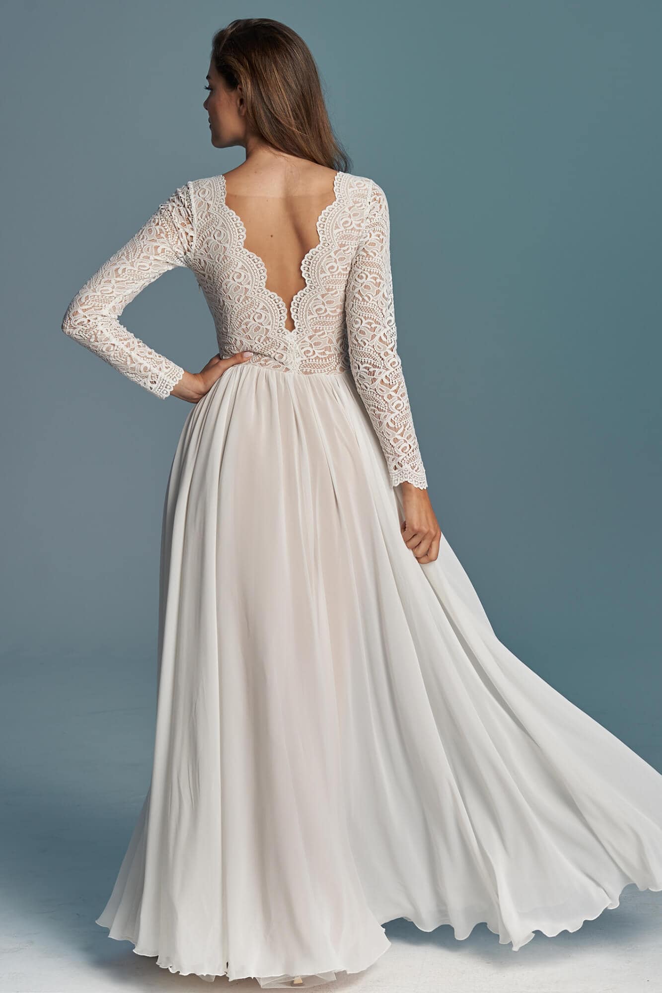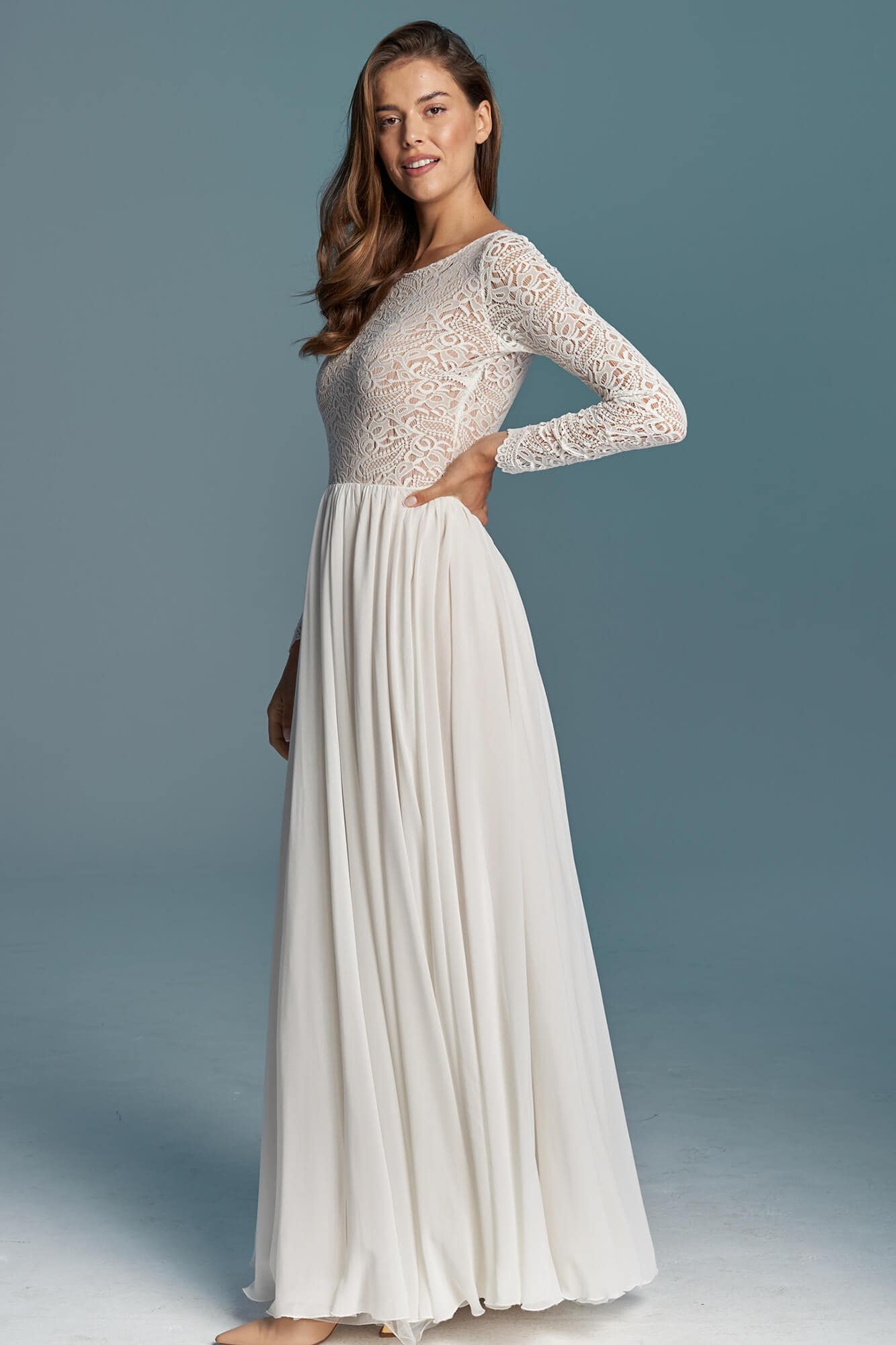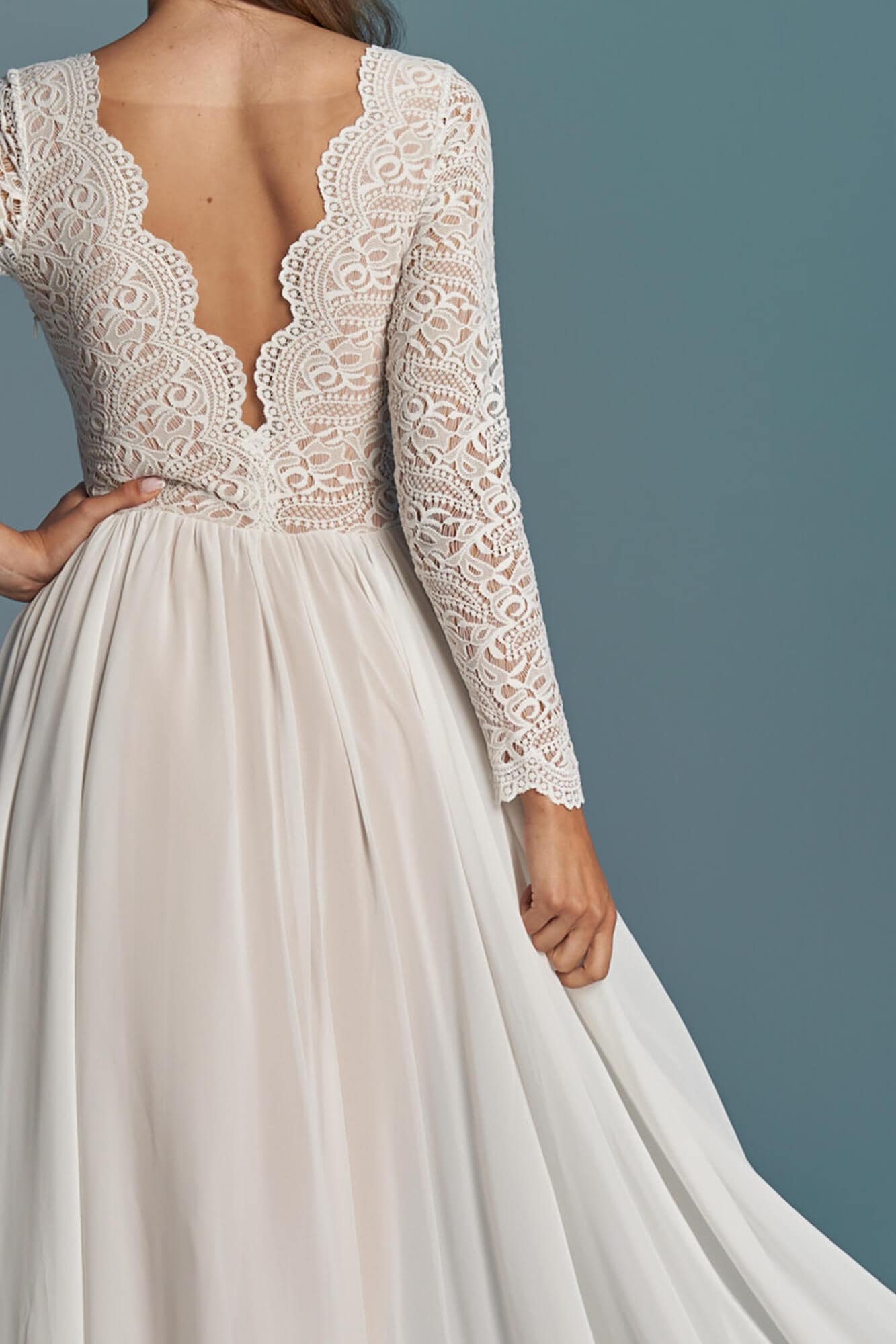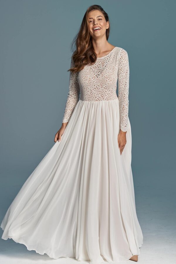 Sukienka ślubna łącząca koronkową górę z długimi rękawami i zwiewną, szyfonową spódnicę z koła. Przód jest zabudowany pod szyję, a głębokie wycięcie na plecach zostało zabezpieczone delikatną siateczką. Spódnica składa się z trzech warstw: szyfonu, tiulu ecru i cielistej podszewki. Model dobrze sprawdza się w ruchu i podczas tańca. Szyty na miarę – z możliwością zmiany dekoltu, rękawów i objętości spódnicy.