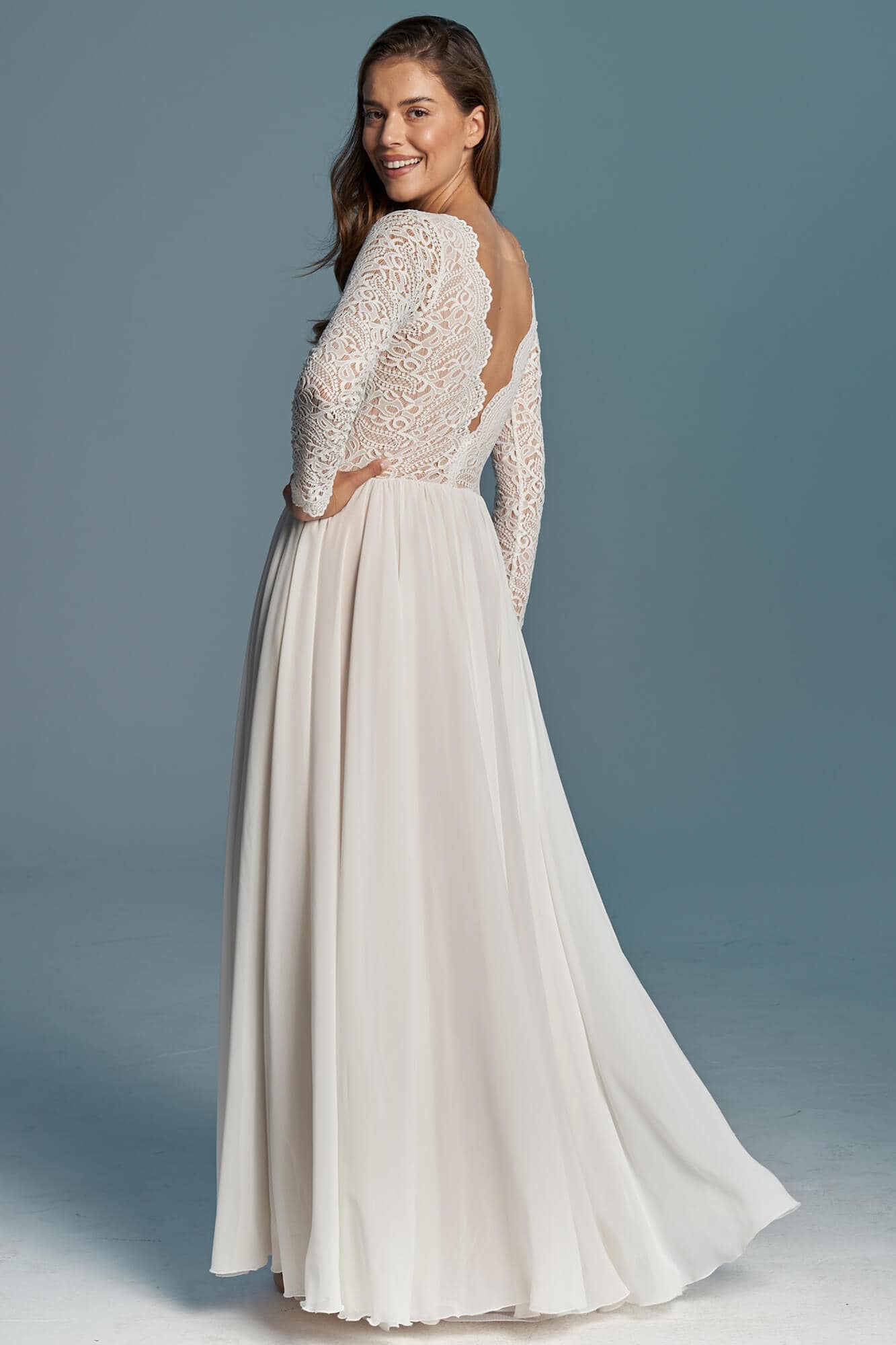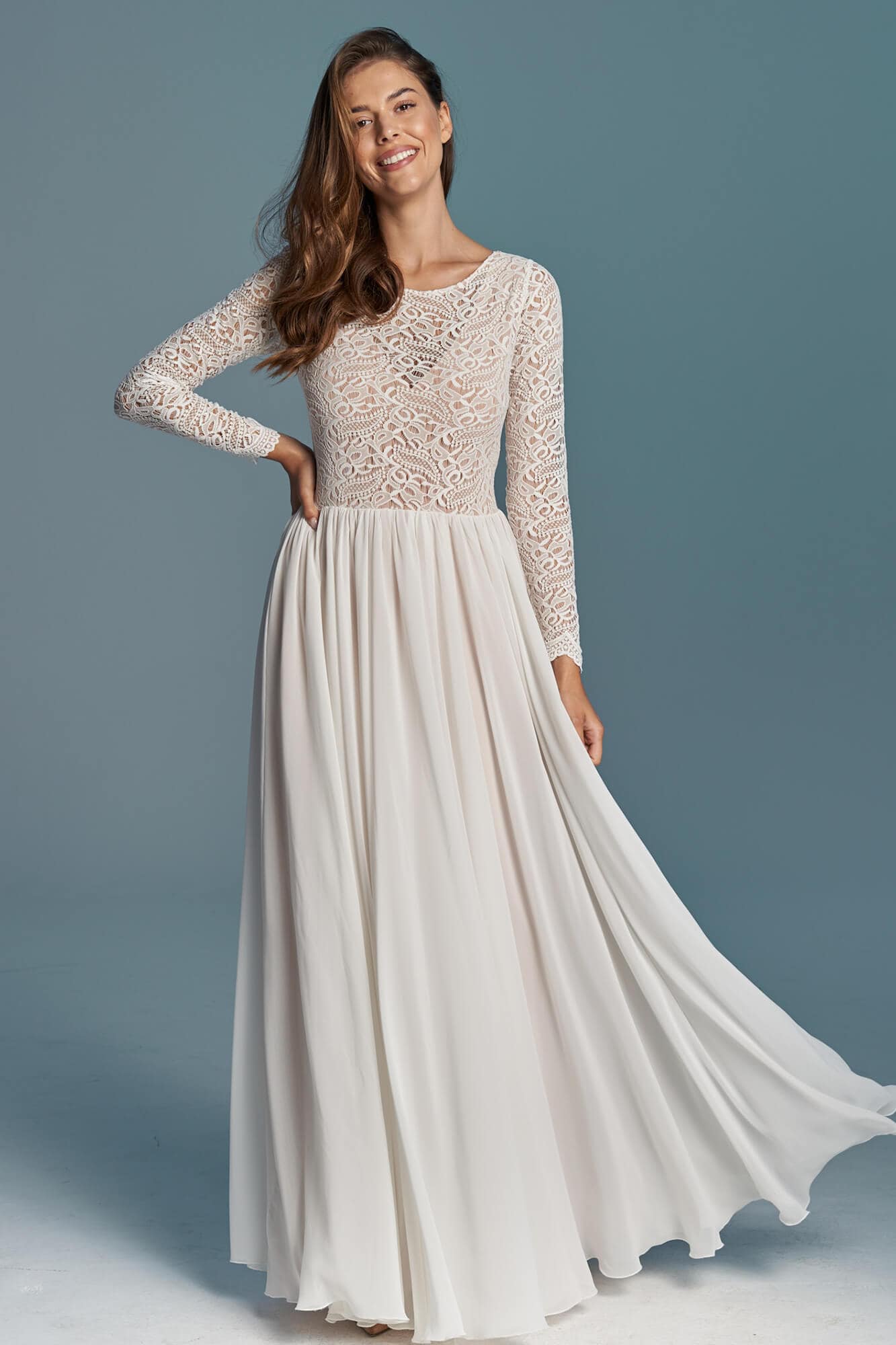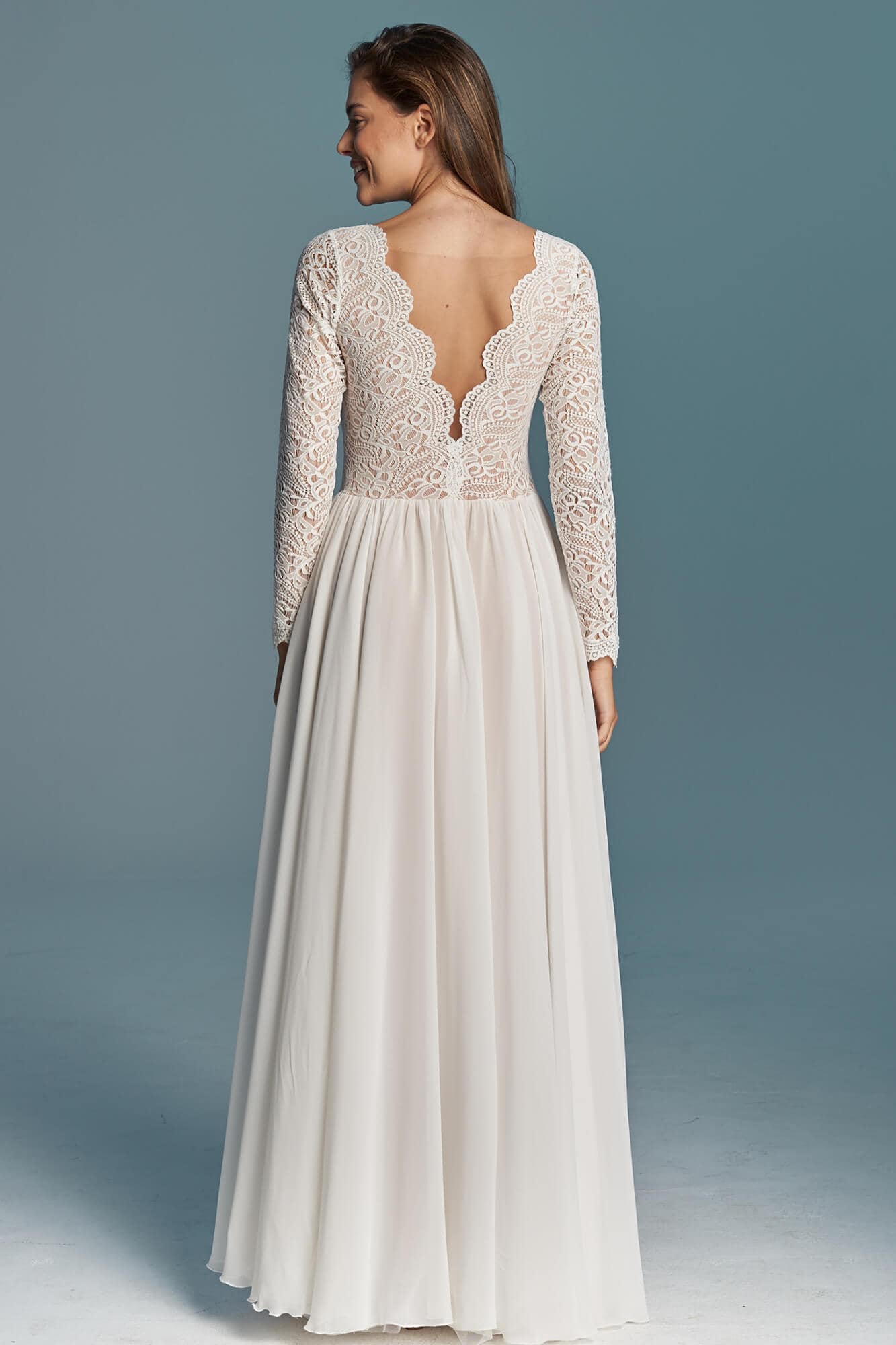 Sukienka ślubna łącząca koronkową górę z długimi rękawami i zwiewną, szyfonową spódnicę z koła. Przód jest zabudowany pod szyję, a głębokie wycięcie na plecach zostało zabezpieczone delikatną siateczką. Spódnica składa się z trzech warstw: szyfonu, tiulu ecru i cielistej podszewki. Model dobrze sprawdza się w ruchu i podczas tańca. Szyty na miarę – z możliwością zmiany dekoltu, rękawów i objętości spódnicy.