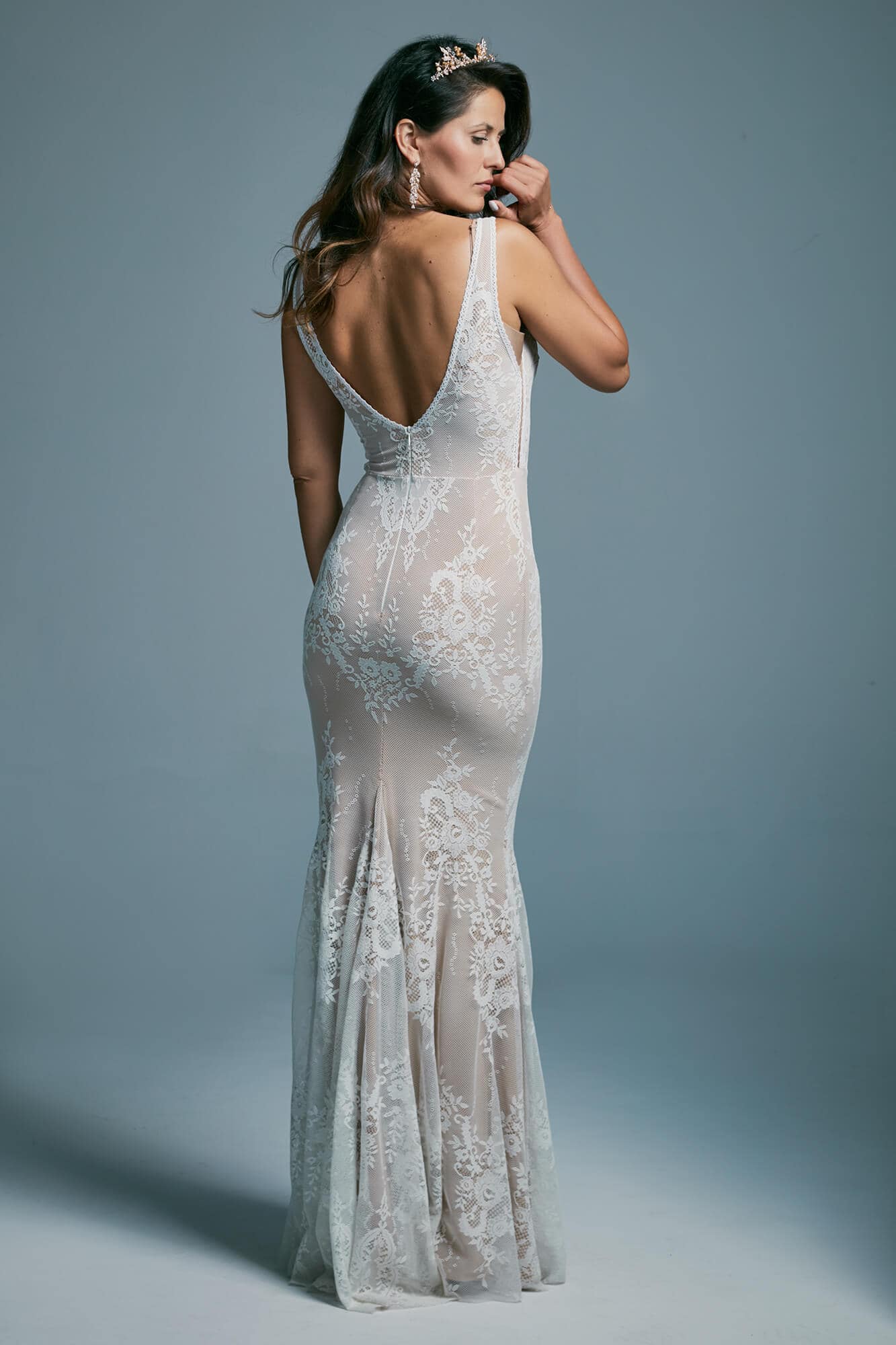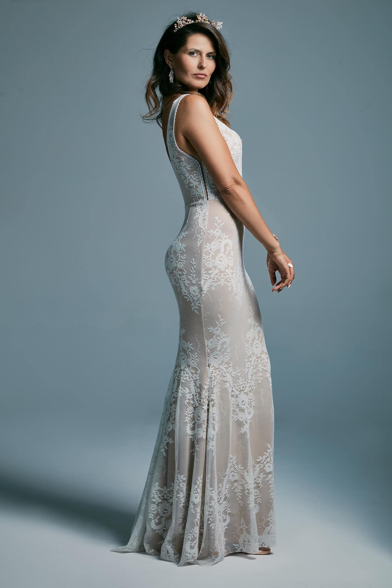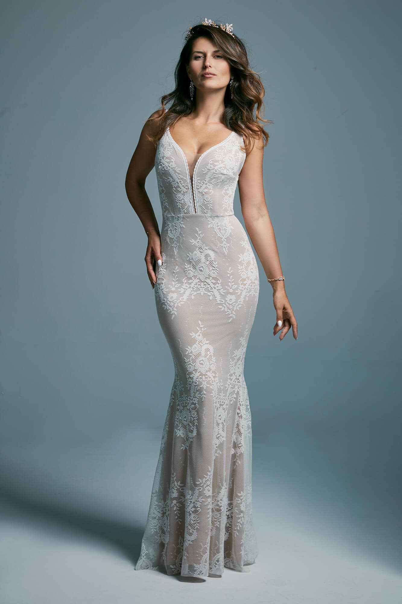 Model został uszyty z jednolitej koronki na stonowanej, beżowej podszewce. Takie zestawienie nadaje całości naturalny efekt i wydobywa delikatne zdobienia w kluczowych miejscach sylwetki. To propozycja dla kobiet, które chcą wyraźnie podkreślić swoje proporcje, zachowując elegancję i komfort podczas całej uroczystości.