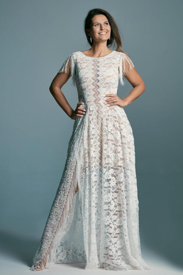 Bogaty wzór koronki na cielistej podszewce oraz pionowy zygzak biegnący przez całą długość sukni sprawiają, że sylwetka wydaje się wyższa i bardziej proporcjonalna. Delikatne frędzle na ramionach równoważą linię bioder i wprowadzają lekkość w górnej części kreacji.