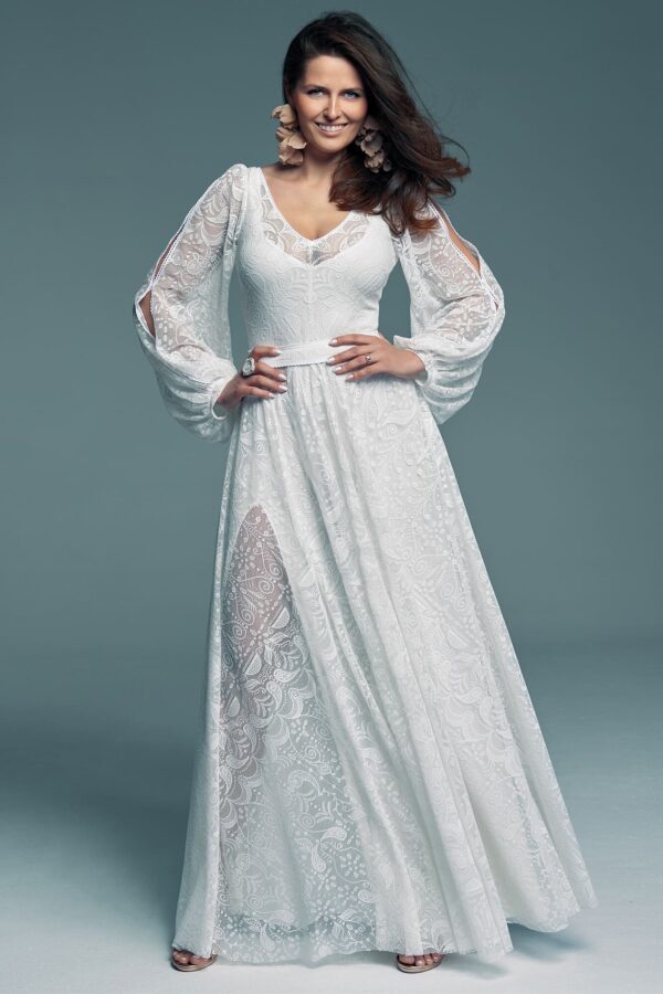 Jeśli klasyczna, śnieżna biel nie jest Twoim wyborem, a beż wydaje się zbyt odważny, postaw na odcień ecru. Mimo fasonu w literę A model wyróżnia się detalem i daleko mu do standardowych, salonowych propozycji.