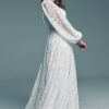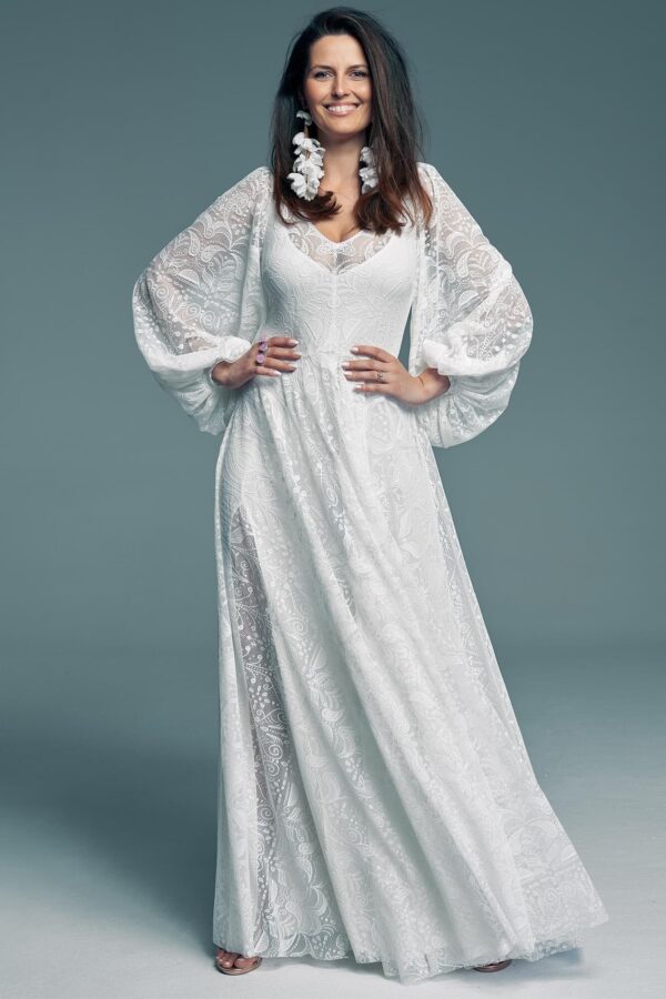 Niezależnie od tego, czy bliższy jest Ci styl hipisowski, boho czy romantyczny, ta suknia w odcieniu ciepłej bieli łączy te estetyki w spójną całość. Duże, luźne, bufiaste rękawy równoważą proporcje sylwetki, szczególnie przy figurze typu gruszka. Przy bardzo rozbudowanej górze warto zwrócić uwagę na ich objętość, aby zachować harmonię.