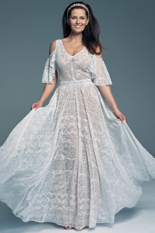 Brak marszczenia w talii oraz ozdobny, koronkowy pasek akcentują naturalne wcięcie i wygładzają linię w okolicy brzucha. Cielista podszewka sprawia, że wzory koronki są wyraźniejsze i nabierają głębi. Model sprawdzi się zarówno podczas ceremonii kościelnej, cywilnej, jak i w plenerze. To wyważone połączenie romantyzmu i funkcjonalnej konstrukcji, które pozwala czuć się swobodnie i pewnie.