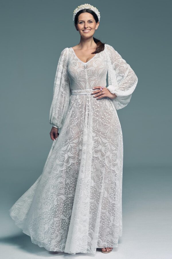 Luźne, bufiaste rękawy wprowadzają objętość w górnej części i pomagają wyrównać proporcje, szczególnie przy sylwetce typu gruszka. To model, który łączy romantyczny detal z przemyślaną konstrukcją. Sprawdzi się zarówno podczas ceremonii kościelnej, cywilnej, jak i w plenerze – niezależnie od pory roku.