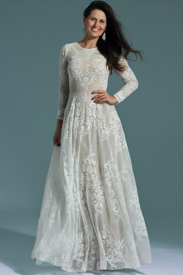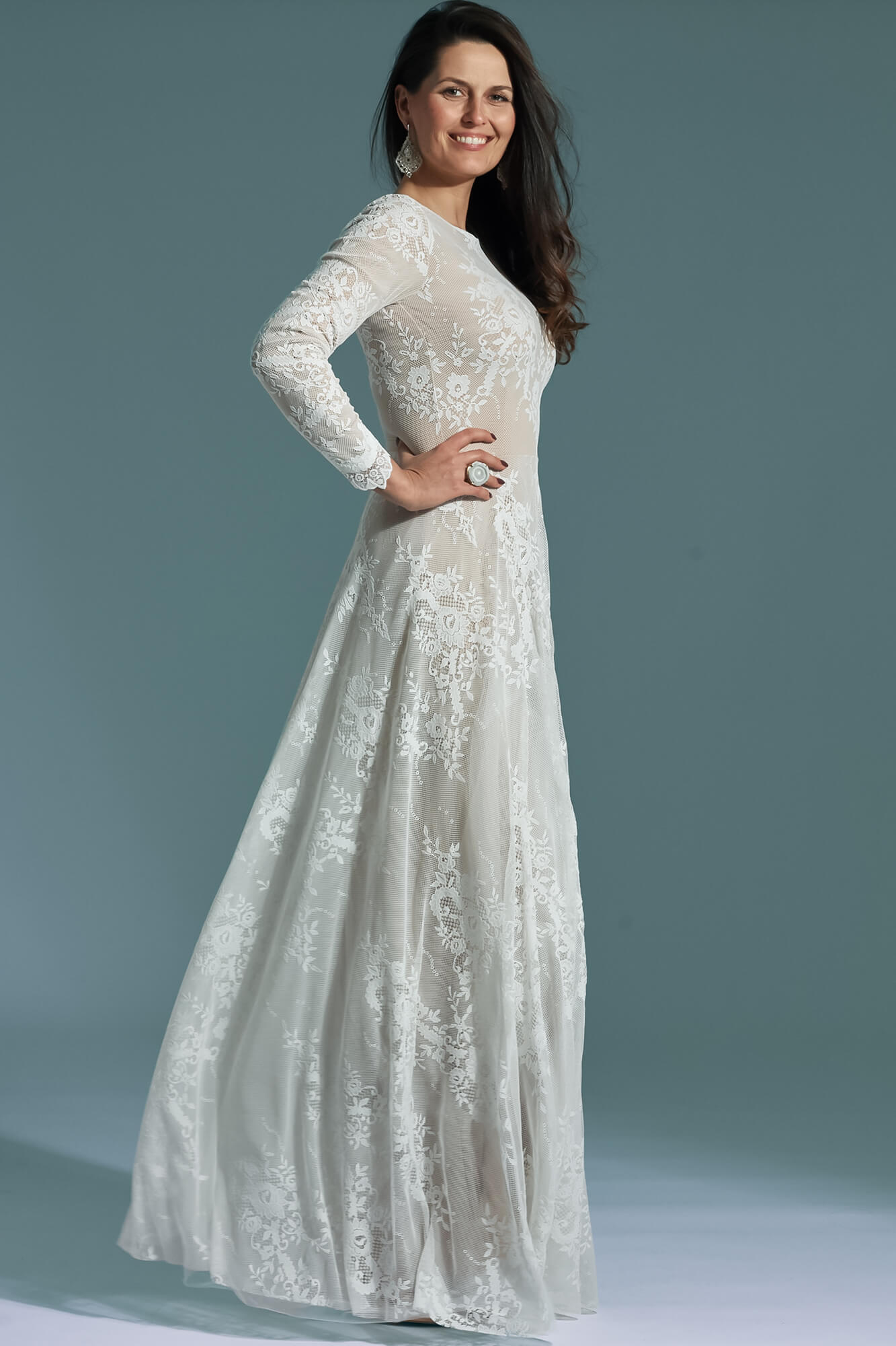 Długi, koronkowy rękaw wykończony ozdobną krawędzią porządkuje formę i dodaje elegancji. Model dobrze wpisuje się w stylistykę romantyczną i rustykalną, a przy odpowiednich dodatkach może zyskać bardziej klasyczny charakter. Suknię można prać w pralce i nie wymaga prasowania, co zwiększa jej funkcjonalność. To propozycja dla kobiet, które chcą połączyć zabudowaną formę z miękką, kobiecą linią.
