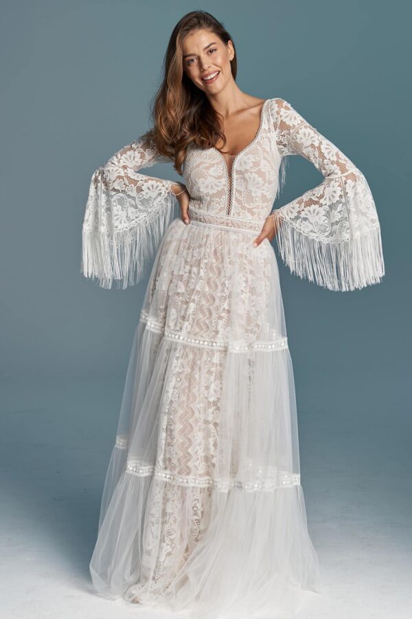 Boho suknia ślubna z elementami klasyki, łącząca koronkową górę z tiulową spódnicą. Gęsta, elastyczna koronka zestawiona jest z piaskową podszewką, która podkreśla wzór i rozświetla całość. Rękawy rozszerzane ku dołowi wykończone frędzlami nadają lekkości w ruchu. Charakterystyczny dekolt modeluje biust w naturalny sposób, bez efektu przesady. Model można zmieniać i dopasować do własnej wizji.