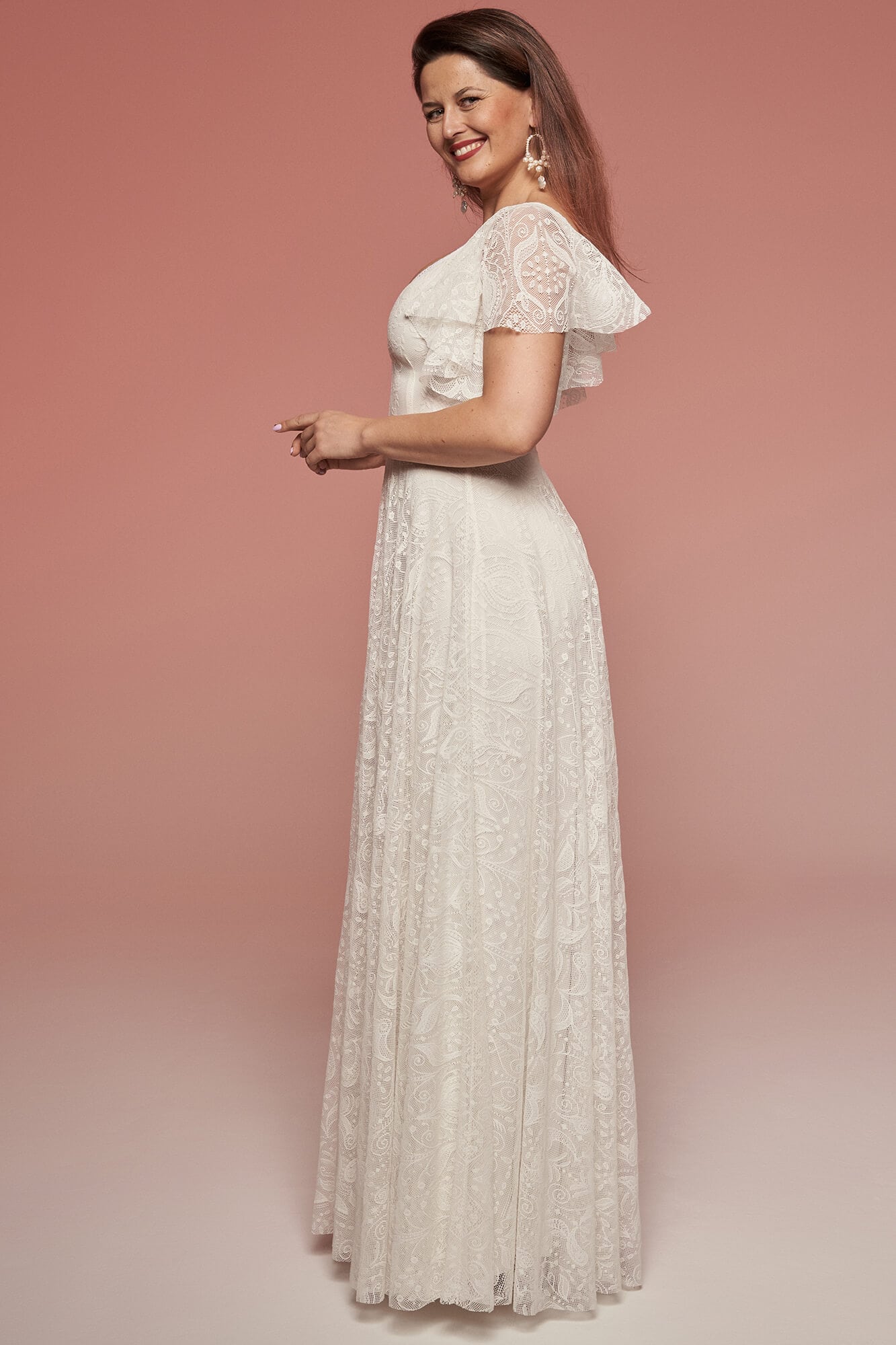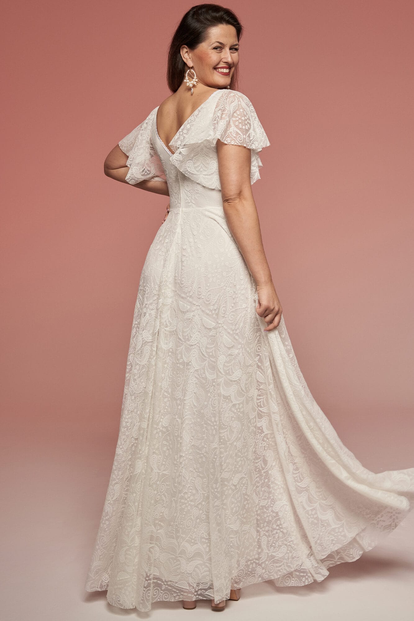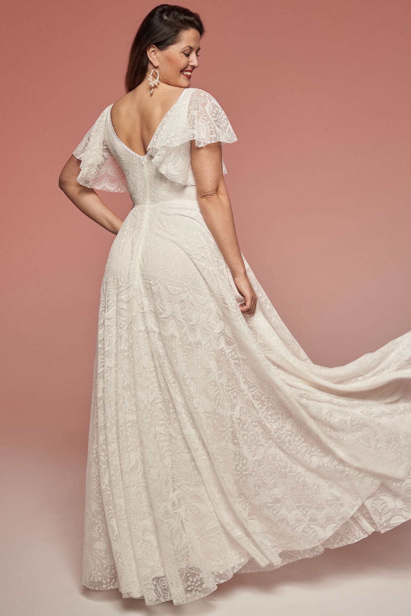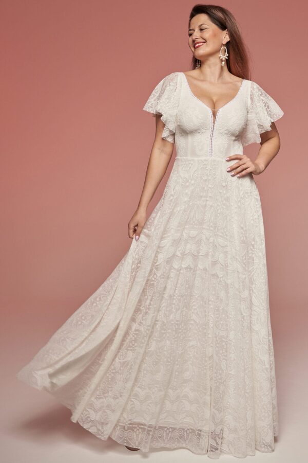 Romantyczna suknia ślubna z rękawkami motylkami i głębokim dekoltem. Lekka koronka łączy geometryczny wzór na spódnicy z kwiatowym motywem w górnej części. Obszerna spódnica nadaje sylwetce objętości i swobodnie pracuje w ruchu. Dekolt pozwala na założenie klasycznego biustonosza. Model możesz zmodyfikować, dopasowując rękawy i detale.