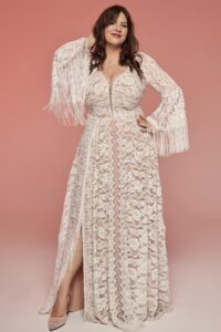 To suknia ślubna, która łączy koronkę, frędzle i wygodę – w zgodzie z Twoją sylwetką i swobodą ruchu.