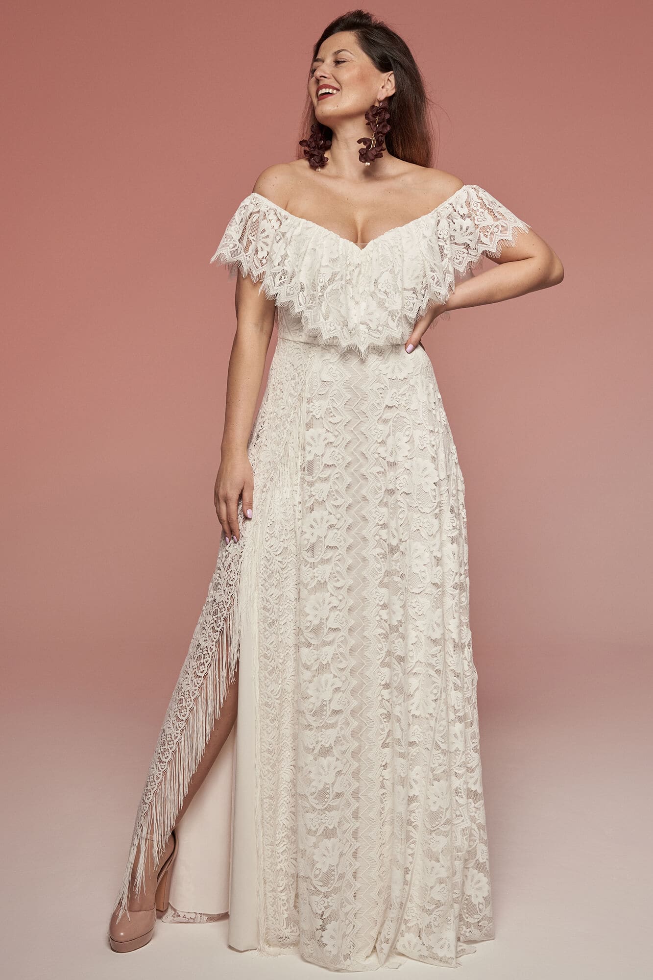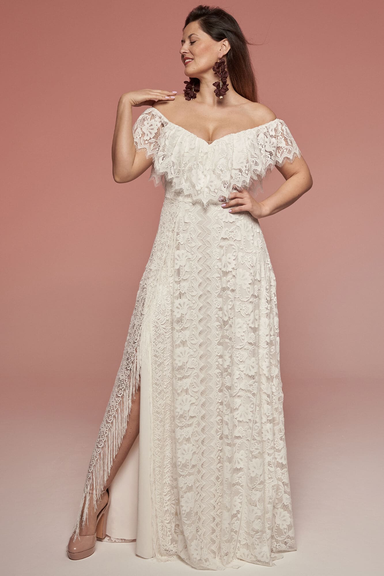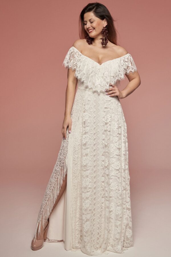 Koronkowa suknia ślubna z hiszpańskim dekoltem i odkrytymi ramionami. Mięsista, ale lekka koronka w kwiatowy wzór tworzy falbanę wykończoną ozdobną krawędzią. Spódnica w kształcie litery A posiada rozcięcie na nodze zakończone frędzlami. Kremowa podszewka łagodzi kontrast wzoru. Model możesz modyfikować podczas szycia, dopasowując detale do siebie.