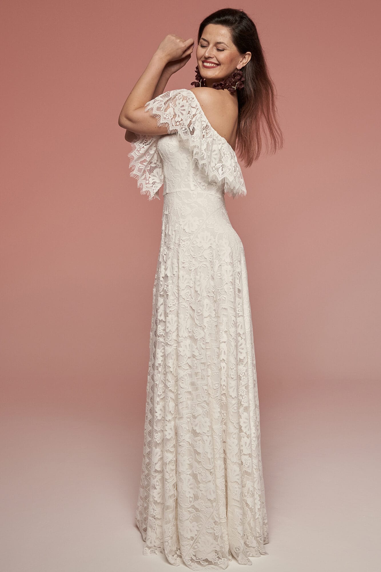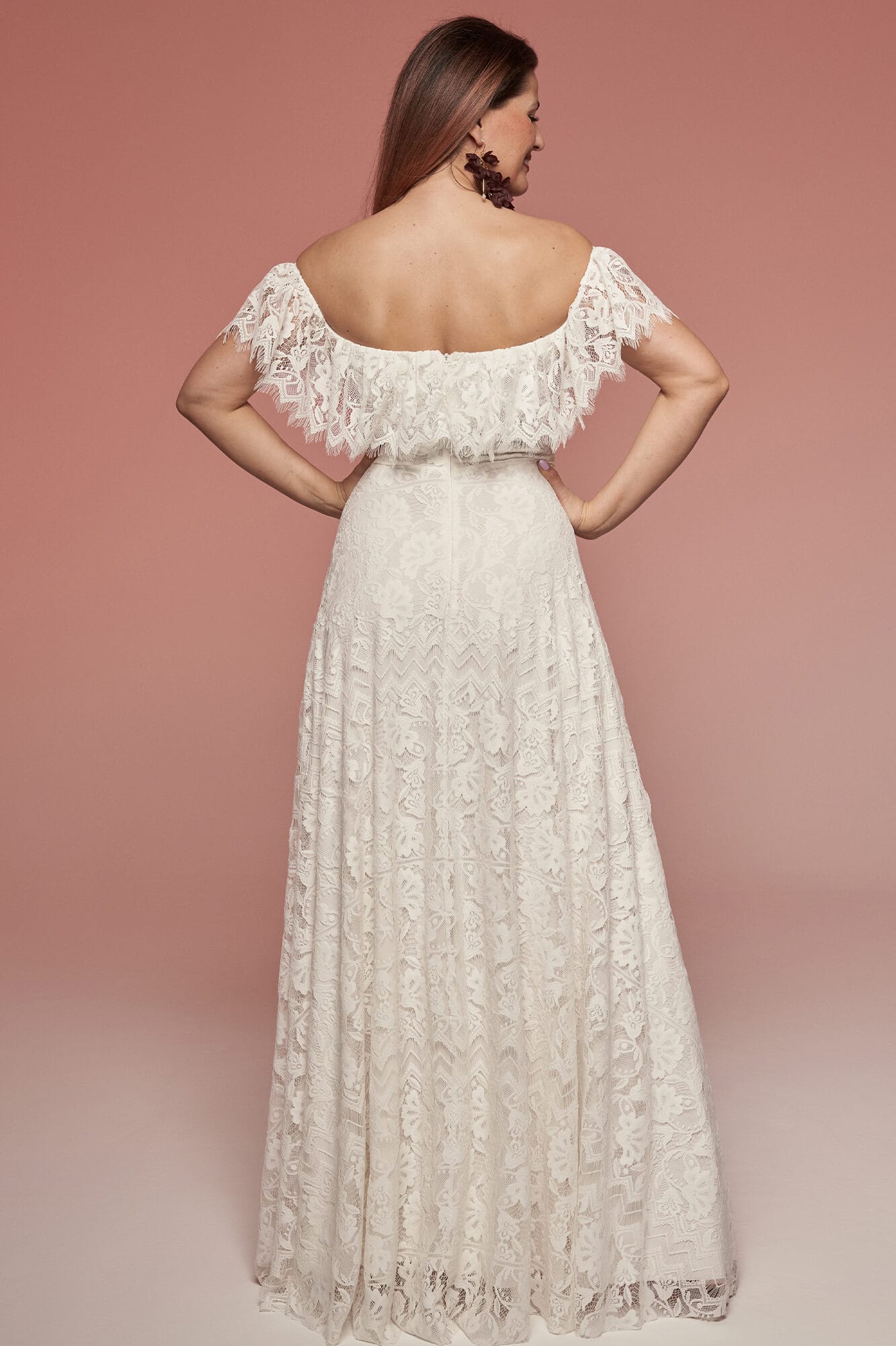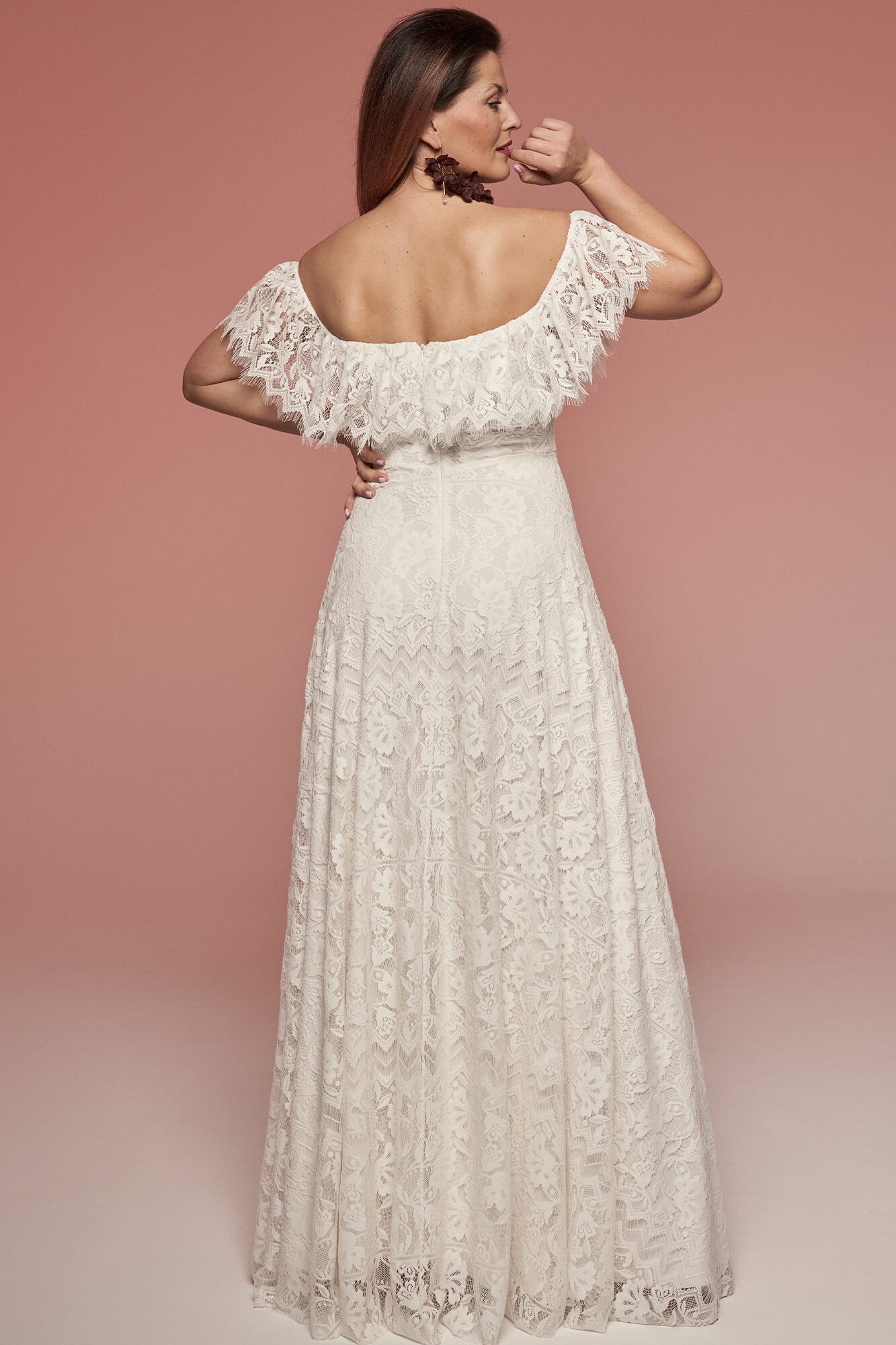 Koronkowa suknia ślubna z hiszpańskim dekoltem i odkrytymi ramionami. Mięsista, ale lekka koronka w kwiatowy wzór tworzy falbanę wykończoną ozdobną krawędzią. Spódnica w kształcie litery A posiada rozcięcie na nodze zakończone frędzlami. Kremowa podszewka łagodzi kontrast wzoru. Model możesz modyfikować podczas szycia, dopasowując detale do siebie.