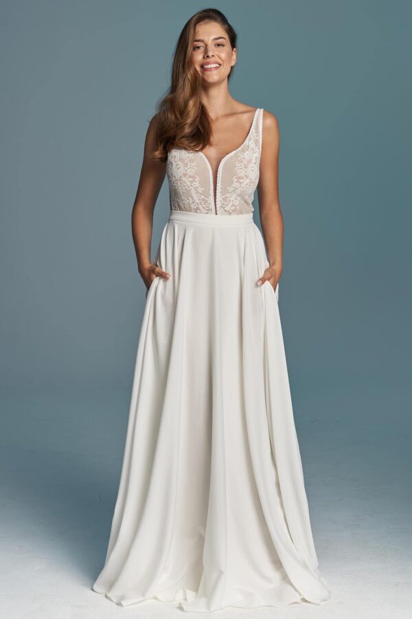 Ta suknia ślubna została zaprojektowana z myślą o kobietach, które chcą podkreślić linię biustu i wydłużyć sylwetkę. Głęboki dekolt sięgający do pępka stabilizuje wszyta cielista siateczka, dzięki której góra dobrze przylega do ciała. Jeśli nie chcesz, nie musisz zakładać stanika, ale możesz wybrać model samonośny w cielistym kolorze. To rozwiązanie sprawdza się także przy mniejszym biuście – dekolt buduje proporcje bez nadmiaru objętości.