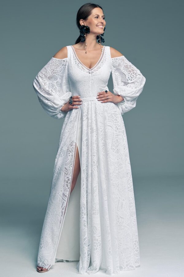 Bufiaste rękawy z koronki to rozwiązanie, które sprawdzi się o każdej porze roku. Odsłonięte ramiona oraz wyrazisty rozporek nadają całości lekkości i subtelnej zmysłowości. Głębokie wycięcie pięknie eksponuje nogi i optycznie wydłuża sylwetkę, podkreślając jej naturalne proporcje. To klasyczna kolorystyka w połączeniu z charakterystycznym krojem.