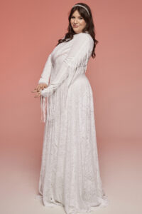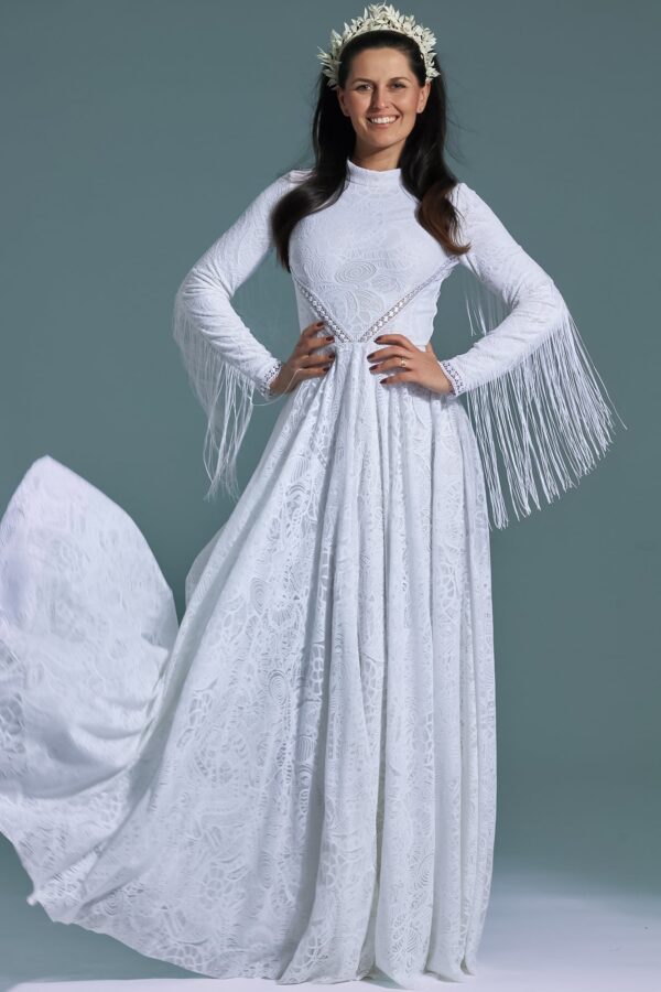 Lubisz białe suknie ślubne i styl boho, ale bliższe są Ci bardziej zabudowane, długie fasony? Ten model łączy te elementy w spójną, niestandardową całość. Zamiast klasycznego dekoltu zastosowano stójkę, co nadaje sukni wyrazisty i rzadko spotykany charakter.