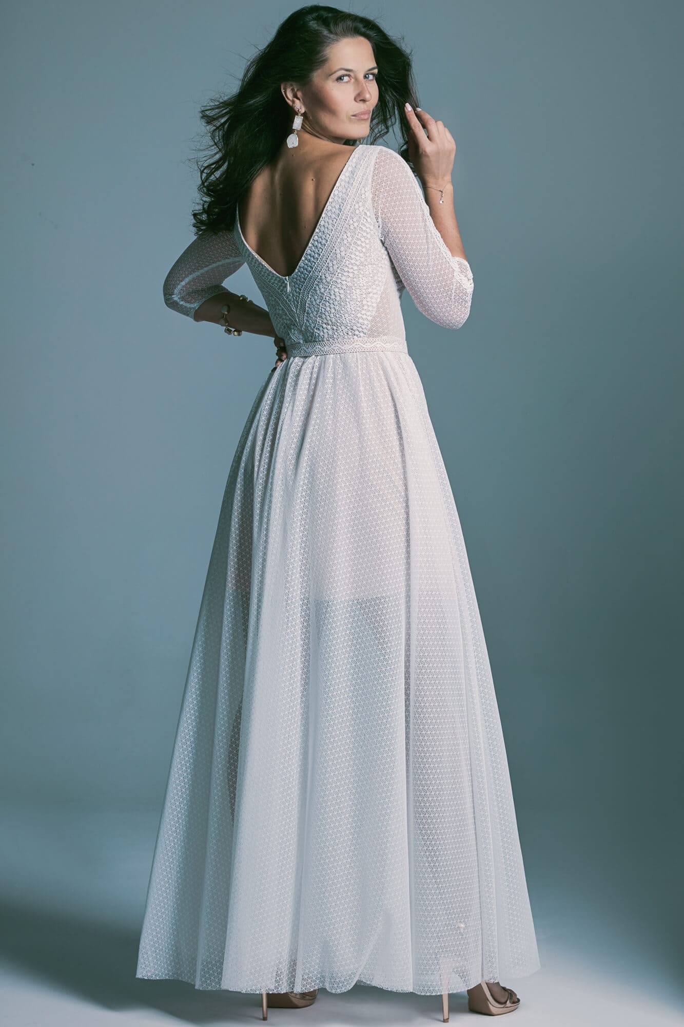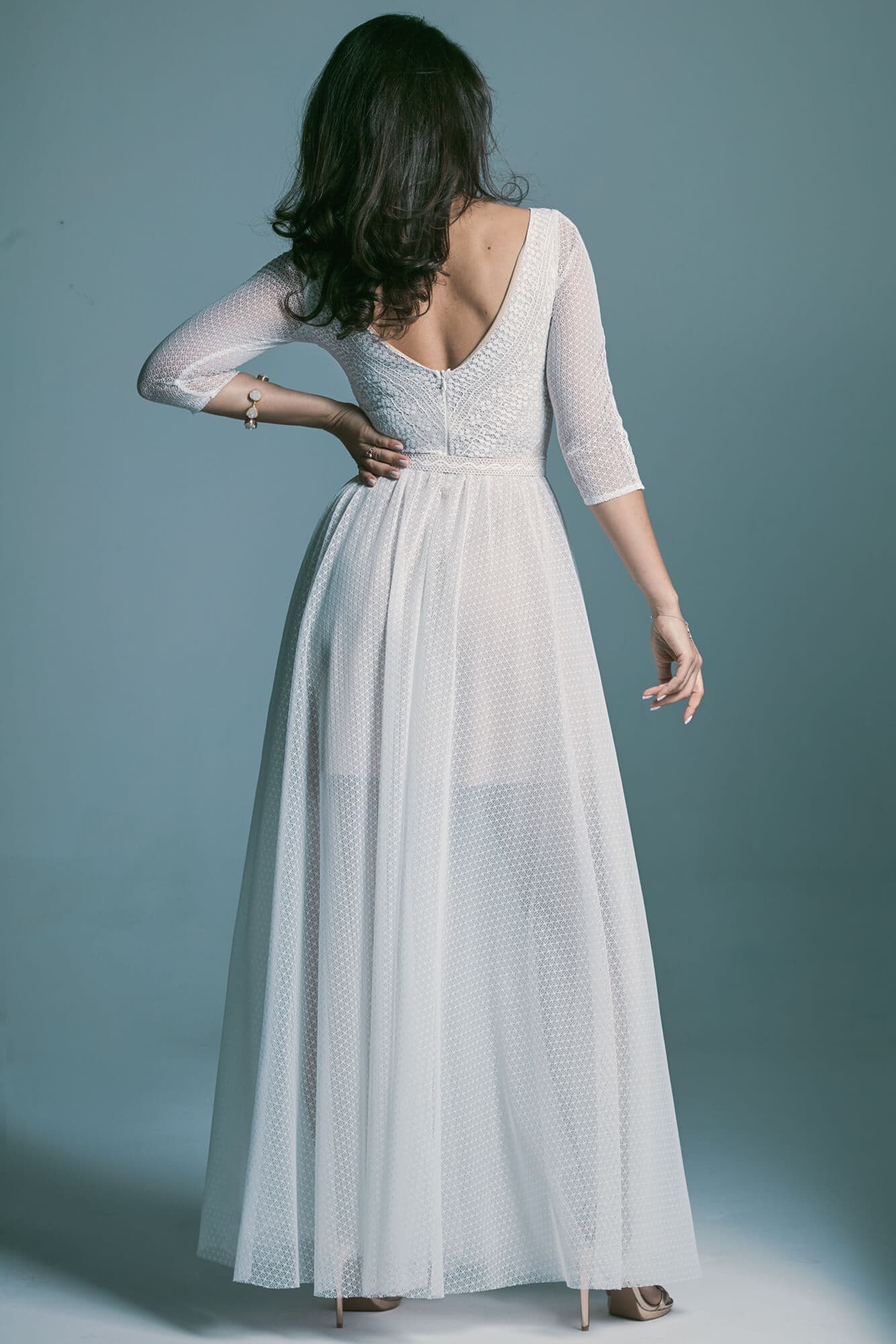 Suknia została uszyta z lekkiej, dzianinowej koronki, która miękko przylega do ciała i nie ogranicza swobody ruchów. Dekolt w łódkę nadaje stylizacji klasy i, dzięki transparentności koronki, zachowuje lekkość nawet przy pełniejszym biuście. Diagonalny układ wzorów w górnej części optycznie akcentuje talię i porządkuje proporcje sylwetki. Dopasowane rękawy 3/4 wykończone taśmą wydłużają linię przedramion i subtelnie nawiązują do paska w talii. Spódnica z połowy koła z delikatnym marszczeniem pięknie pracuje w tańcu, zachowując płynną linię bioder. To model, który po skróceniu z powodzeniem można nosić również na co dzień, łącząc go choćby z jeansową kurtką.