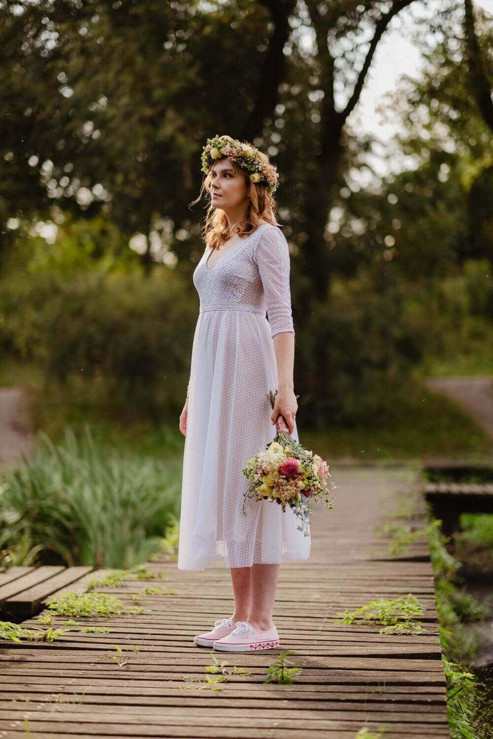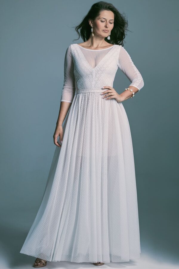 Skromna suknia ślubna dla narzeczonych, które w dniu ślubu chcą wyglądać elegancko i kobieco, zachowując subtelny, wyważony charakter stylizacji. Model z rękawem 3/4 sprawdzi się zarówno podczas ceremonii kościelnej, jak i wesela w stodole czy plenerze.