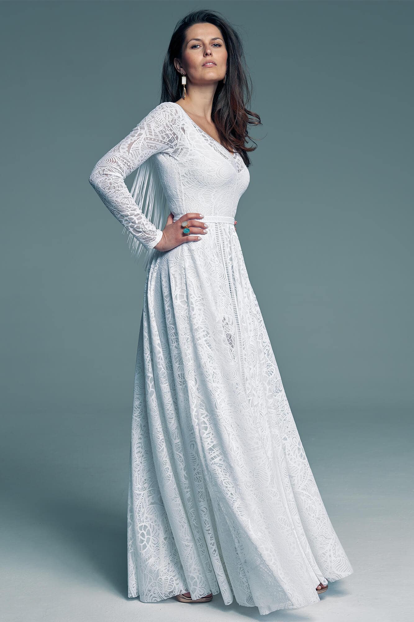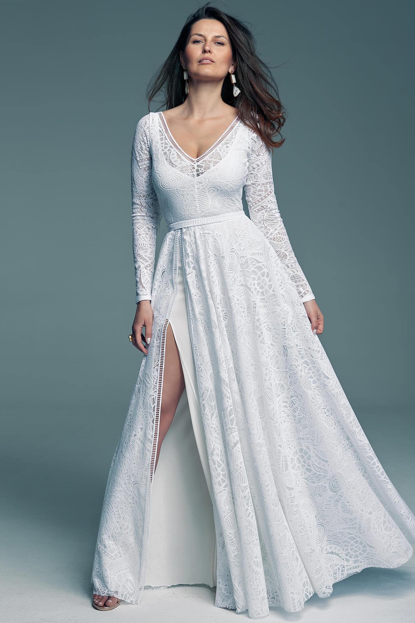 Koronkowy pasek subtelnie podkreśla talię i stanowi spójne wykończenie stylizacji, podobnie jak obszycia długich rękawów. Ten typ rękawa szczególnie dobrze równoważy proporcje przy drobniejszej górze sylwetki, podkreślając jej lekkość. W przypadku szerszych ramion warto świadomie ocenić efekt, jaki chcemy uzyskać – konstrukcja rękawa może optycznie wzmocnić linię górnej części ciała. Suknia została uszyta z białej koronki o niestandardowych wzorach, które nadają jej charakteru. Głęboki rozporek wydłuża sylwetkę, dodaje lekkości i wprowadza wyrazisty, kobiecy akcent. To klasyka z pazurem – elegancka, ale nie zachowawcza.