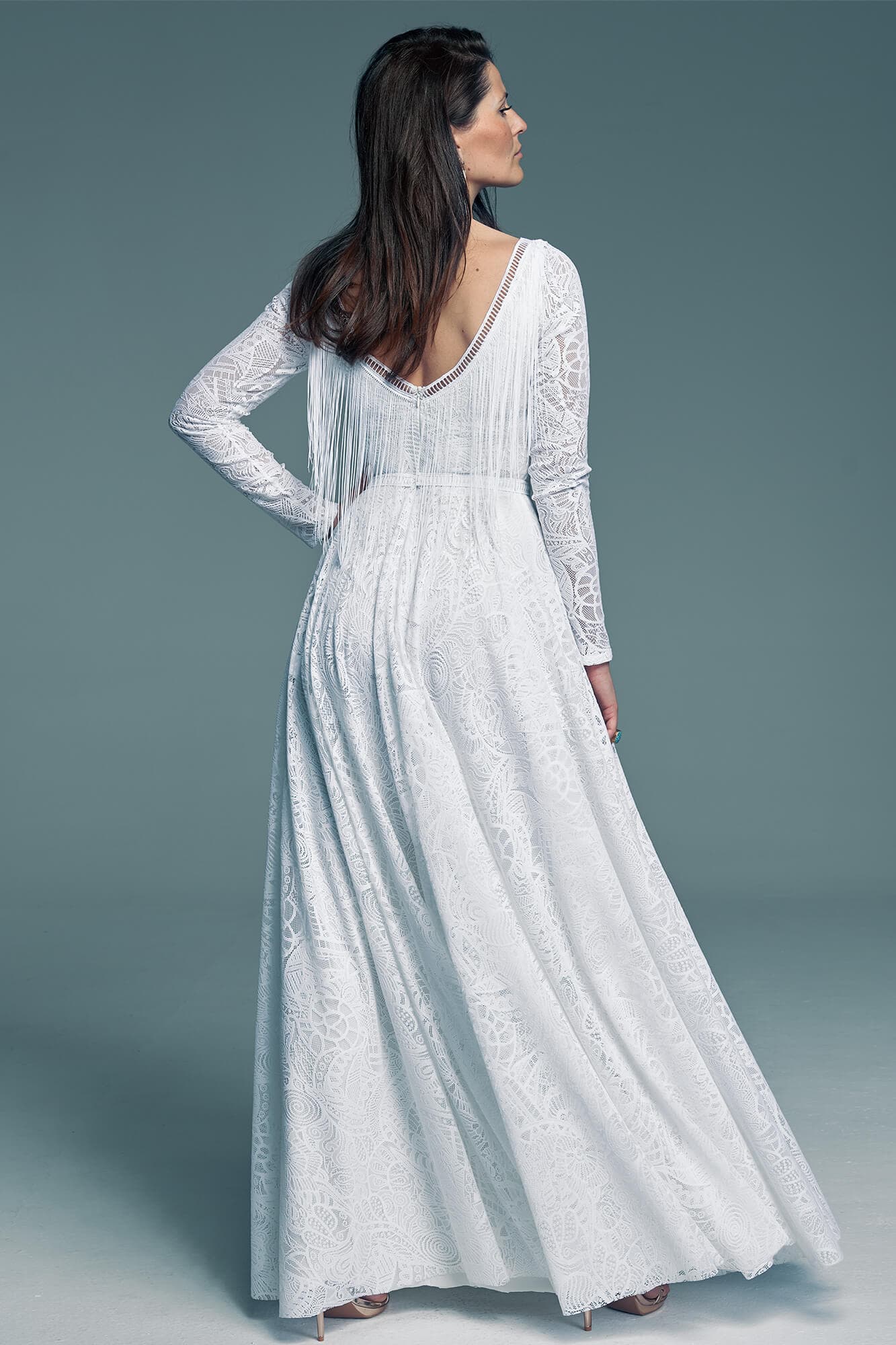 Jeśli cenisz klasykę, ale nie chcesz, by była oczywista, a biel i linia A to Twój świadomy wybór – ten model jest dla Ciebie. Dekolt w kształcie litery V z przodu i z tyłu został wykończony białą, koronkową tasiemką, a tył wzbogacono o boho akcent w postaci frędzli.