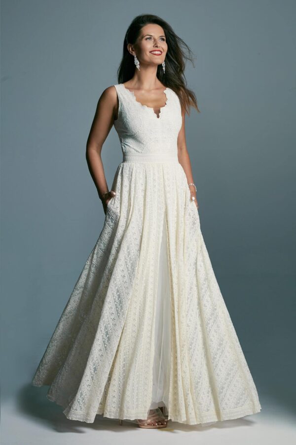 Koronkowa suknia ślubna z bawełnianej koronki i delikatnego tiulu. Ma głęboki dekolt w kształcie litery V oraz szeroki pas podkreślający talię. Góra łączy odcienie bieli i beżu, tworząc wyraźną strukturę. Dodatkowa warstwa tiulu daje efekt lekkiego rozcięcia. Model można skrócić i zafarbować po ślubie.