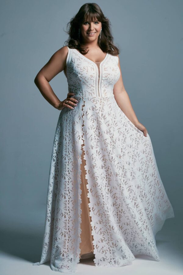Suknia ślubna plus size z odkrytymi plecami, uszyta z koronki o geometrycznym wzorze. Dopasowany krój podkreśla naturalne krągłości sylwetki. Ma głęboki dekolt, wycięcia po bokach oraz rozporek w spódnicy. Tiulowe prześwity dodają lekkości konstrukcji. Model można modyfikować pod względem kroju i detali.