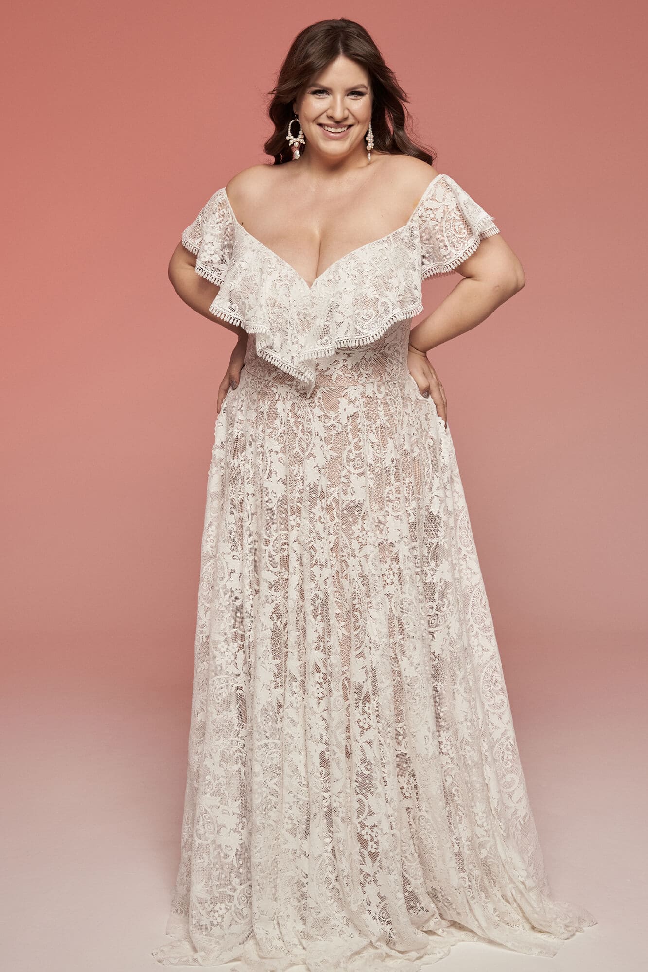 Ta hiszpańska suknia ślubna łączy bohemę z elegancją, oferując efektowny krój i komfort noszenia. Górę zdobi głęboki dekolt eksponujący ramiona, uzupełniony falbaną, która lekko zakrywa biust i dodaje lekkości sylwetce. Koronkowa faktura na cielistej podszewce subtelnie podkreśla detale materiału i kontrastuje z gładką spódnicą.
