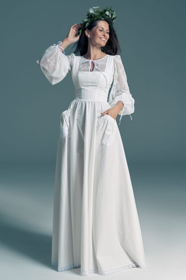 Suknia ślubna z bufiastymi rękawami i koronkowymi detalami. Ma duże kieszenie ozdobione delikatnymi, białymi kwiatami. Łączy romantyczny charakter z elementami w stylu sielskim lub vintage. Spódnica ma komfortową linię, która daje swobodę ruchu. To model dla kobiet, które chcą wyraźnych detali, ale bez rezygnowania z wygody.